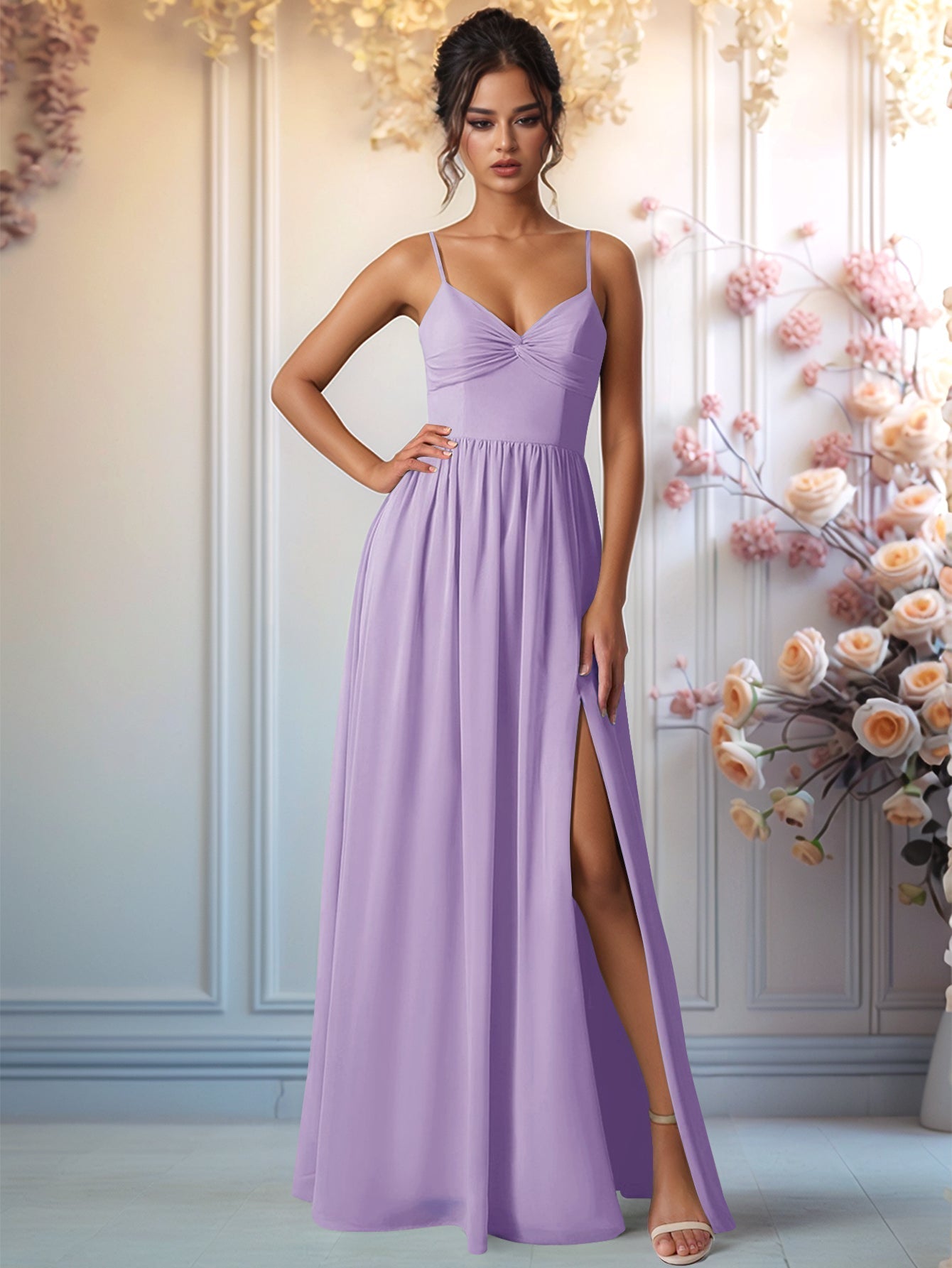 This chiffon bridesmaid dress features back bow on the bodice. The spaghetti strap wedding guest dress has a v-neck and pleated split hem. The a-line wedding showing dress is ideal for beach, outdoor wedding or garden wedding guest party.