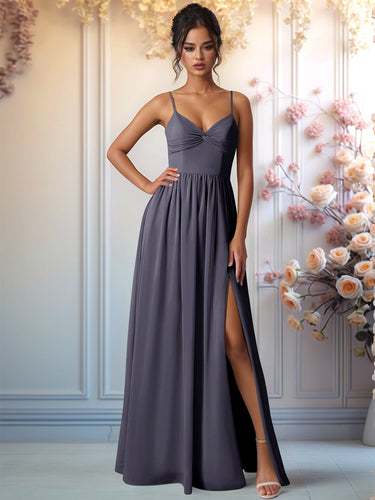 This chiffon bridesmaid dress features back bow on the bodice. The spaghetti strap wedding guest dress has a v-neck and pleated split hem. The a-line wedding showing dress is ideal for beach, outdoor wedding or garden wedding guest party.
