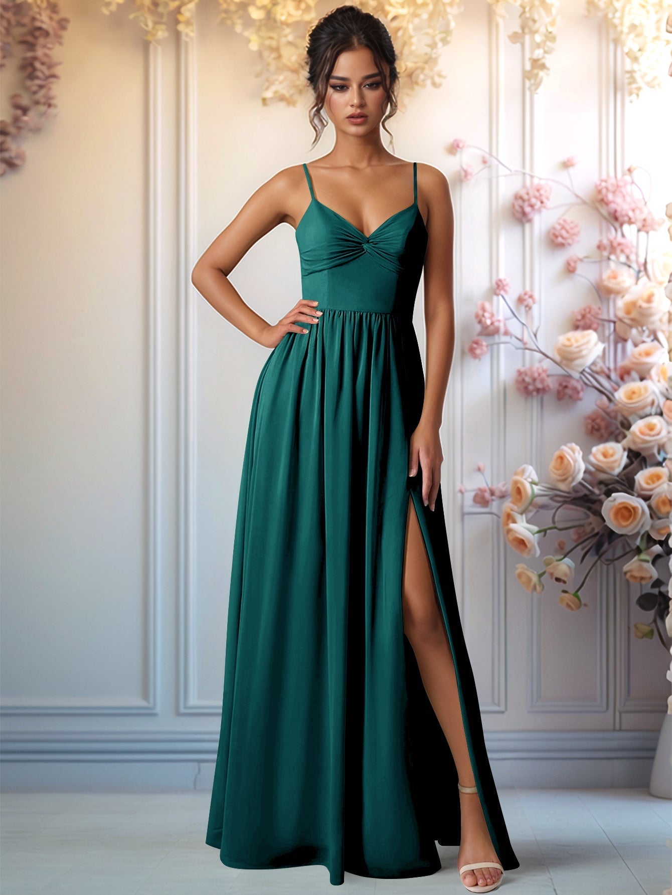 This chiffon bridesmaid dress features back bow on the bodice. The spaghetti strap wedding guest dress has a v-neck and pleated split hem. The a-line wedding showing dress is ideal for beach, outdoor wedding or garden wedding guest party.