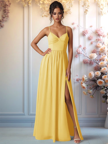 This chiffon bridesmaid dress features back bow on the bodice. The spaghetti strap wedding guest dress has a v-neck and pleated split hem. The a-line wedding showing dress is ideal for beach, outdoor wedding or garden wedding guest party.