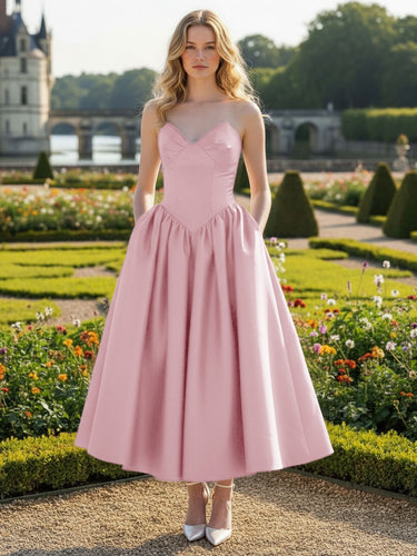 This satin bridal dress features boned on the bodice with pocket. The strapless wedding shower dress has a sweetheart neck and pleated hem. The dress for bridal is ideal for beach, outdoor wedding or garden wedding guest party.