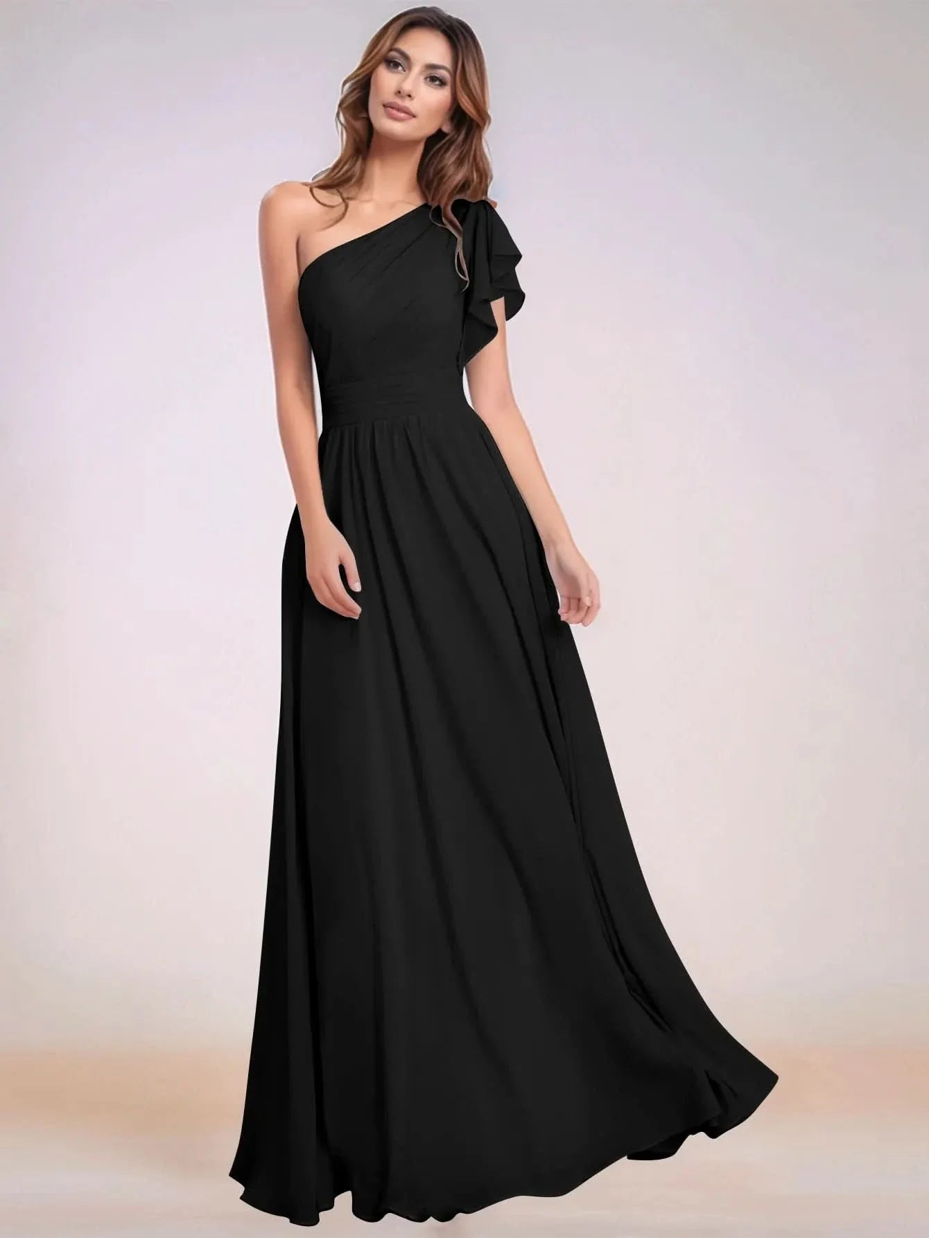 Asymmetrical Chiffon Bridesmaid Dress With Ruffle Short Sleeve - Black