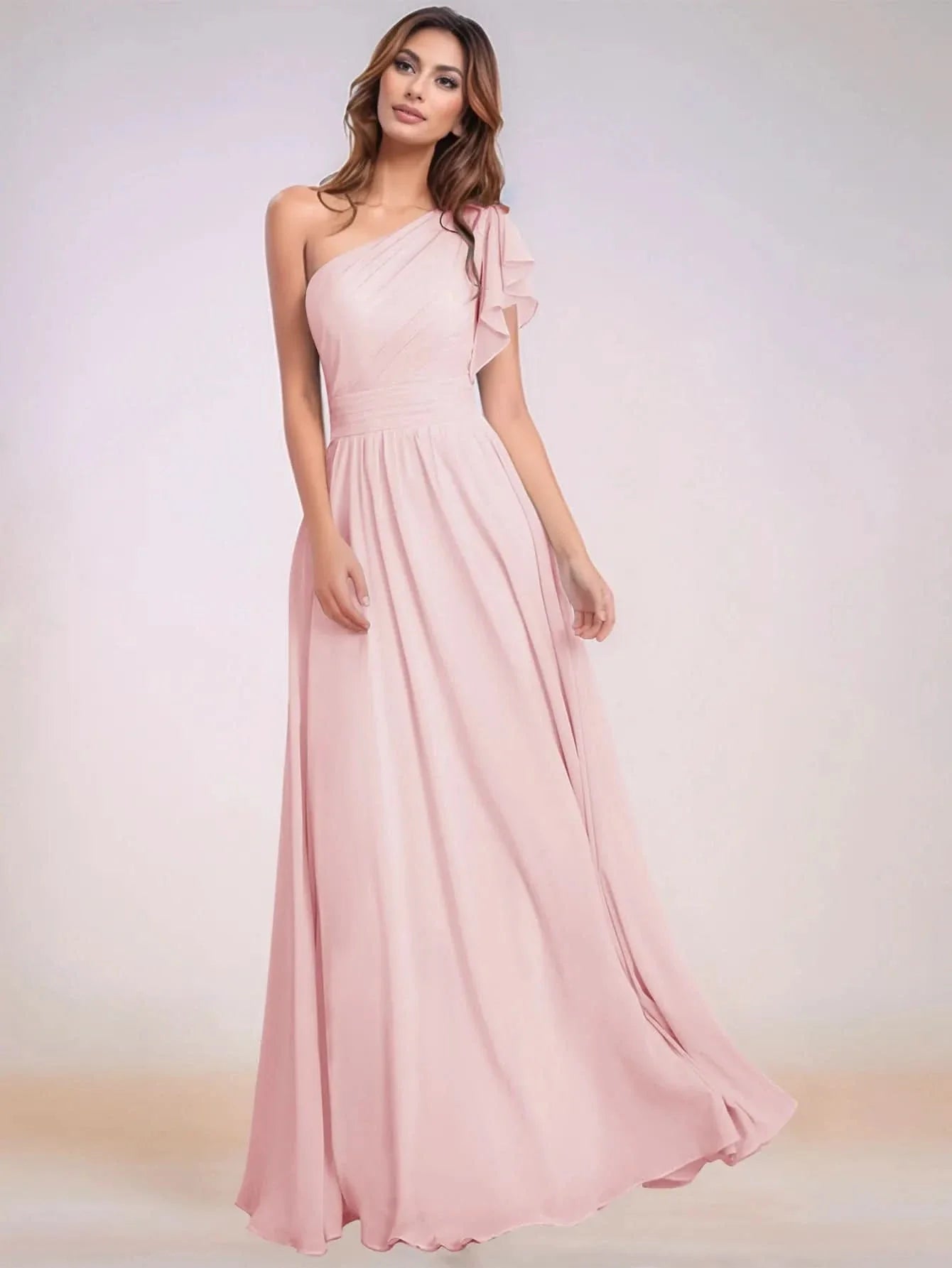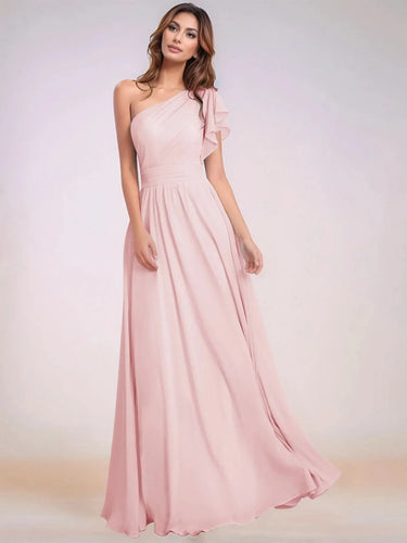 This chiffon bridesmaid dress features ruffle short sleeve on the bodice. The one shoulder brides maid dress has a asymmetrical neck and pleated hem. The sheath classy wedding guest dress is ideal for wedding, family or wedding guest party.