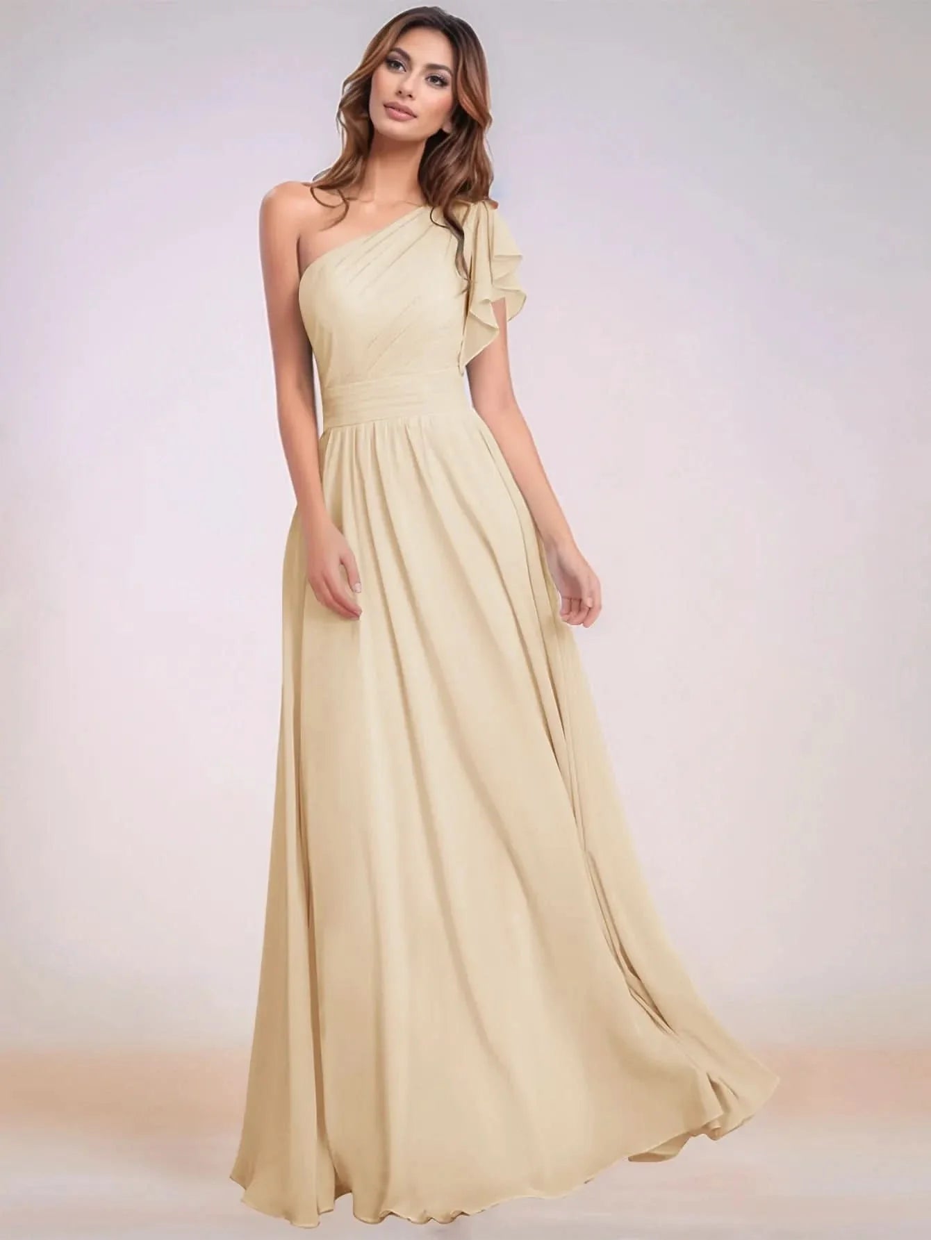 This chiffon bridesmaid dress features ruffle short sleeve on the bodice. The one shoulder brides maid dress has a asymmetrical neck and pleated hem. The sheath classy wedding guest dress is ideal for wedding, family or wedding guest party.