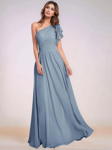 This chiffon bridesmaid dress features ruffle short sleeve on the bodice. The one shoulder brides maid dress has a asymmetrical neck and pleated hem. The sheath classy wedding guest dress is ideal for wedding, family or wedding guest party.