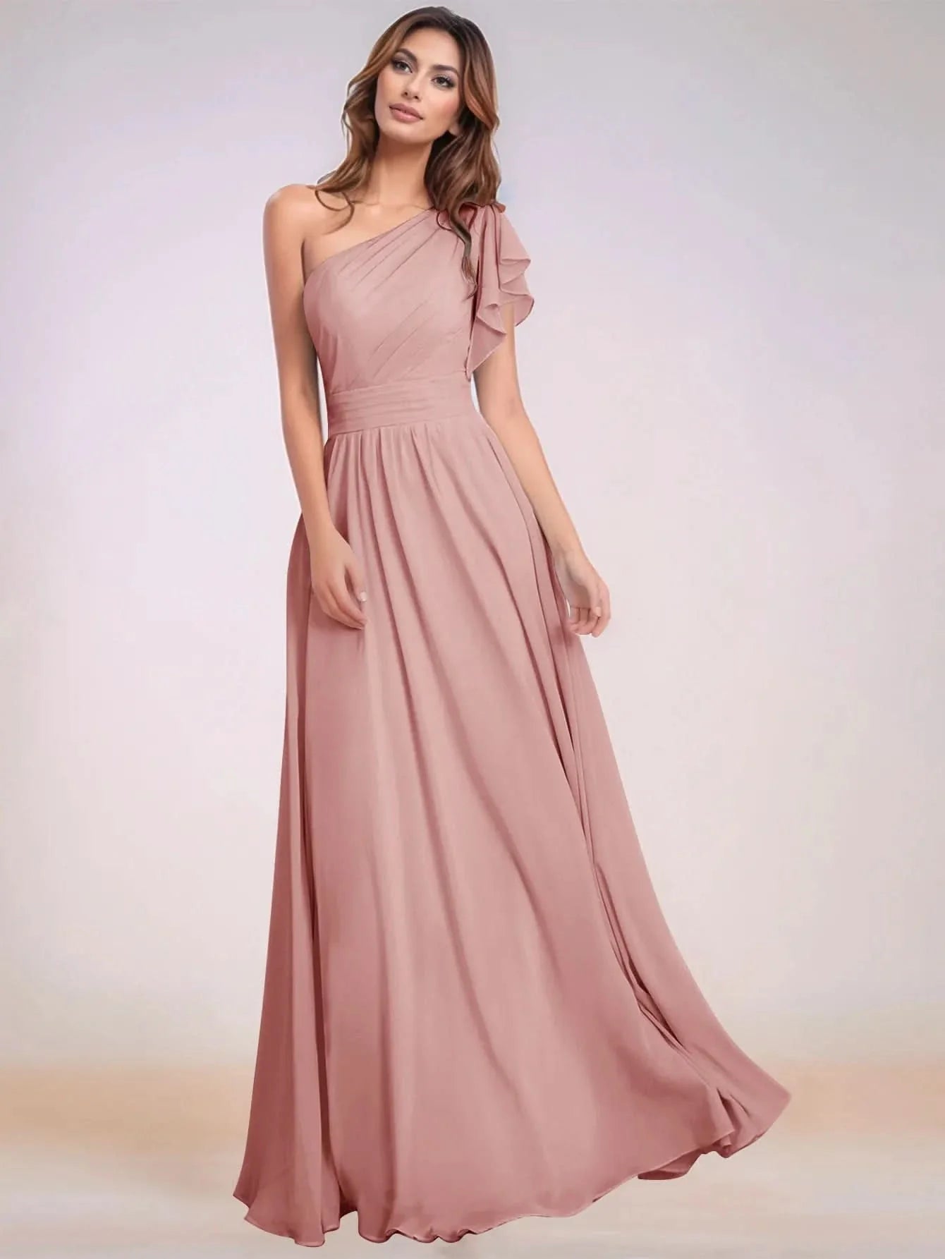 Asymmetrical Chiffon Bridesmaid Dress With Ruffle Short Sleeve - Dusty Rose
