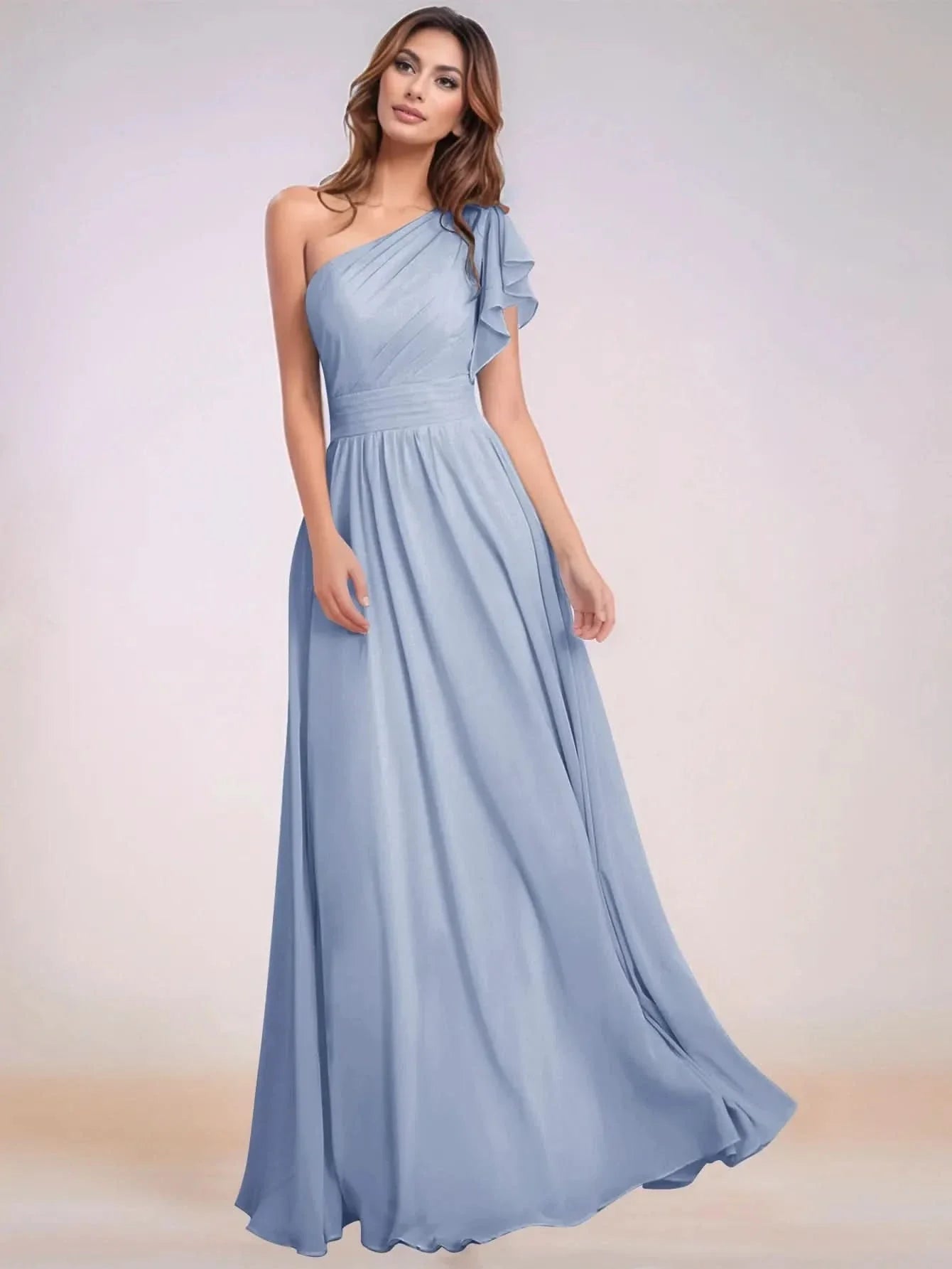 This chiffon bridesmaid dress features ruffle short sleeve on the bodice. The one shoulder brides maid dress has a asymmetrical neck and pleated hem. The sheath classy wedding guest dress is ideal for wedding, family or wedding guest party.