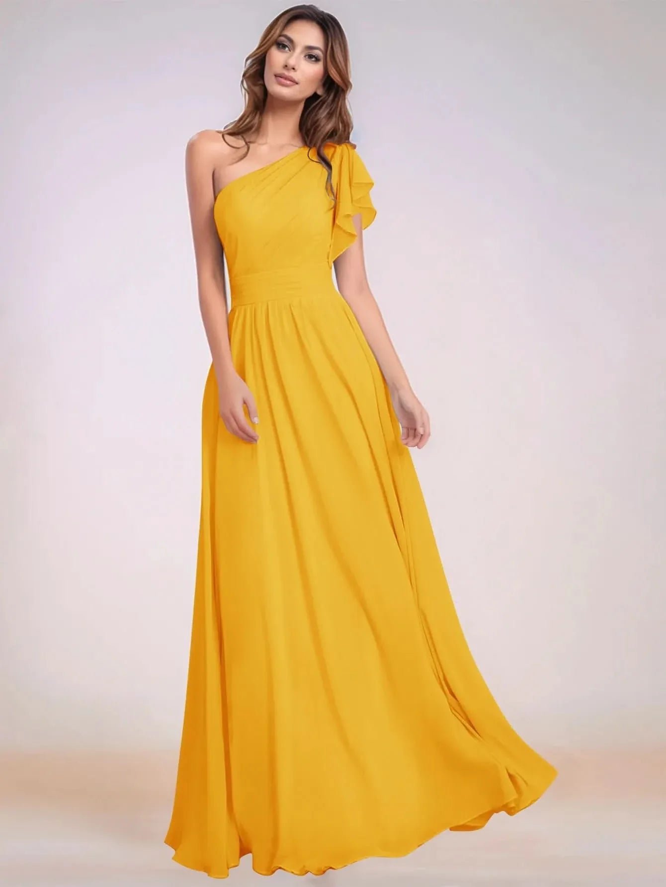 Asymmetrical Chiffon Bridesmaid Dress With Ruffle Short Sleeve - Mustard Yellow