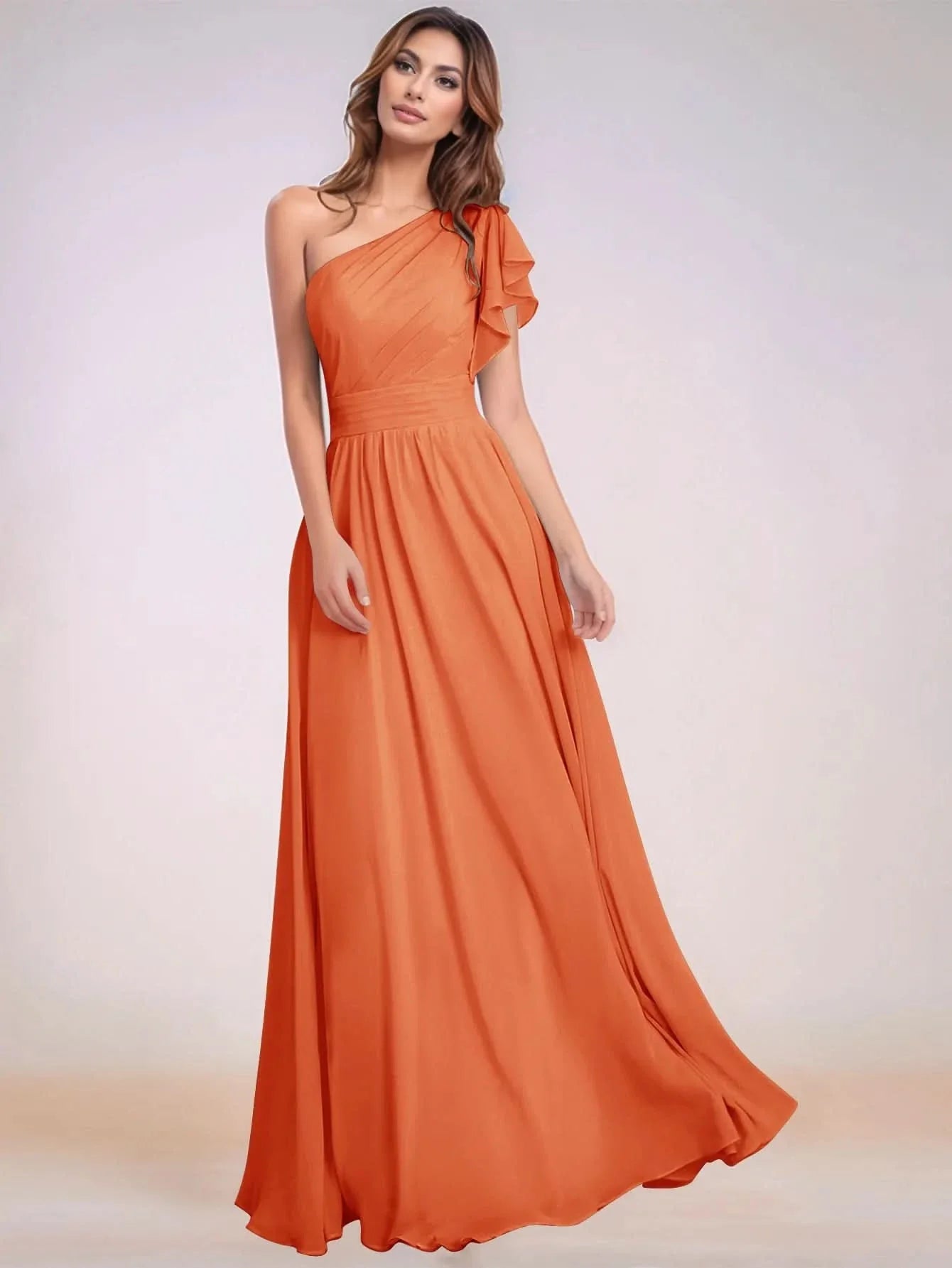 This chiffon bridesmaid dress features ruffle short sleeve on the bodice. The one shoulder brides maid dress has a asymmetrical neck and pleated hem. The sheath classy wedding guest dress is ideal for wedding, family or wedding guest party.