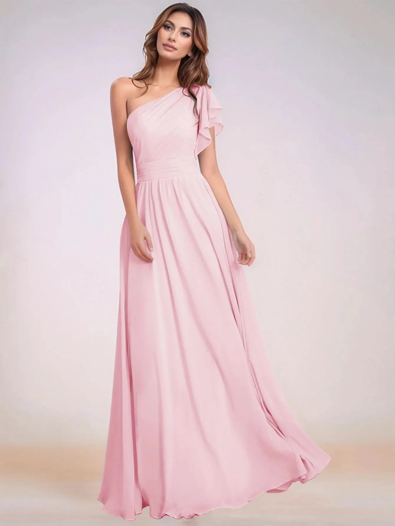Asymmetrical Chiffon Bridesmaid Dress With Ruffle Short Sleeve - Pink