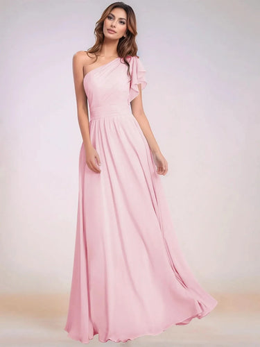 This chiffon bridesmaid dress features ruffle short sleeve on the bodice. The one shoulder brides maid dress has a asymmetrical neck and pleated hem. The sheath classy wedding guest dress is ideal for wedding, family or wedding guest party.