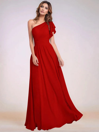 Asymmetrical Chiffon Bridesmaid Dress With Ruffle Short Sleeve - Red