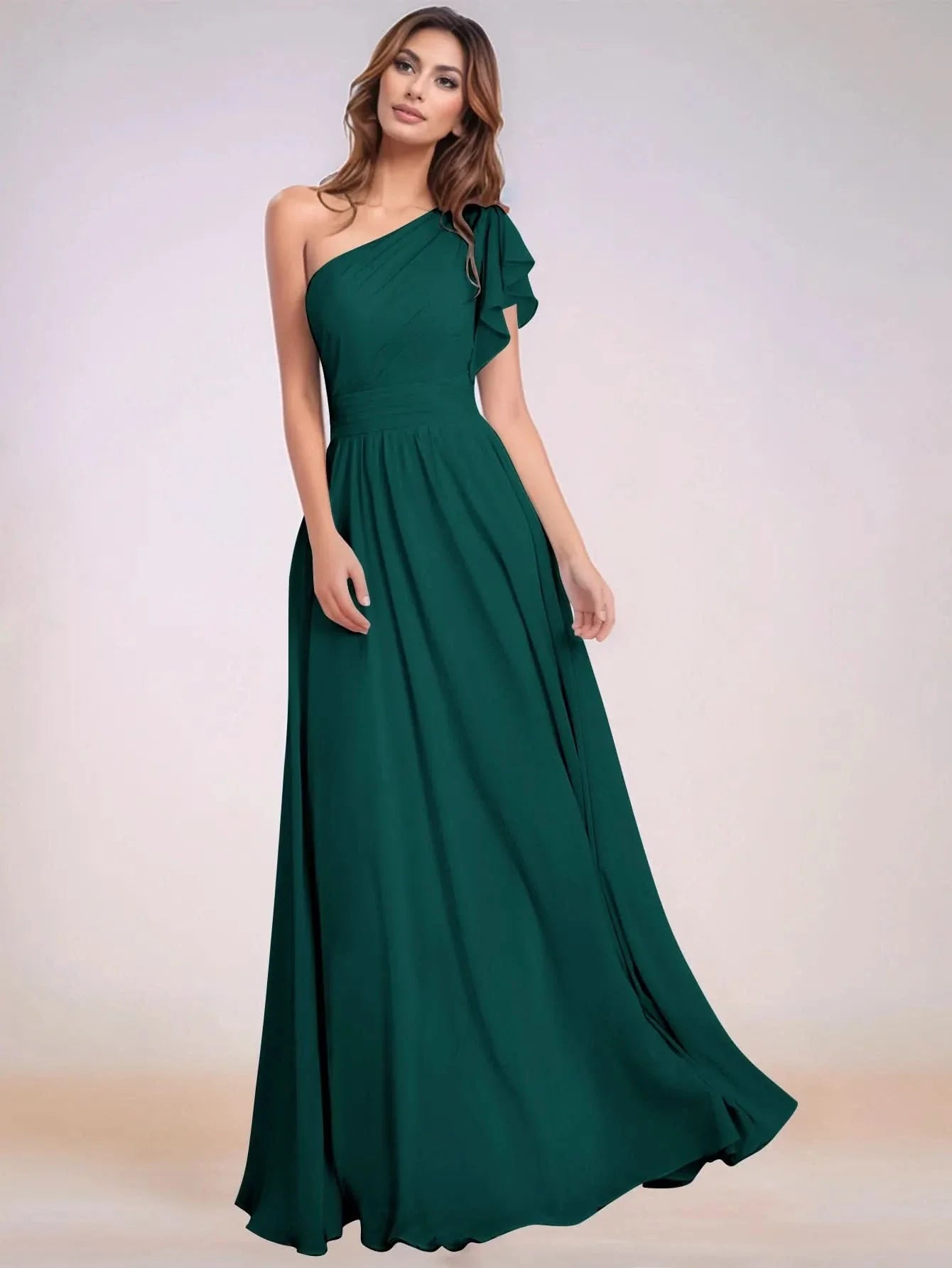 This chiffon bridesmaid dress features ruffle short sleeve on the bodice. The one shoulder brides maid dress has a asymmetrical neck and pleated hem. The sheath classy wedding guest dress is ideal for wedding, family or wedding guest party.