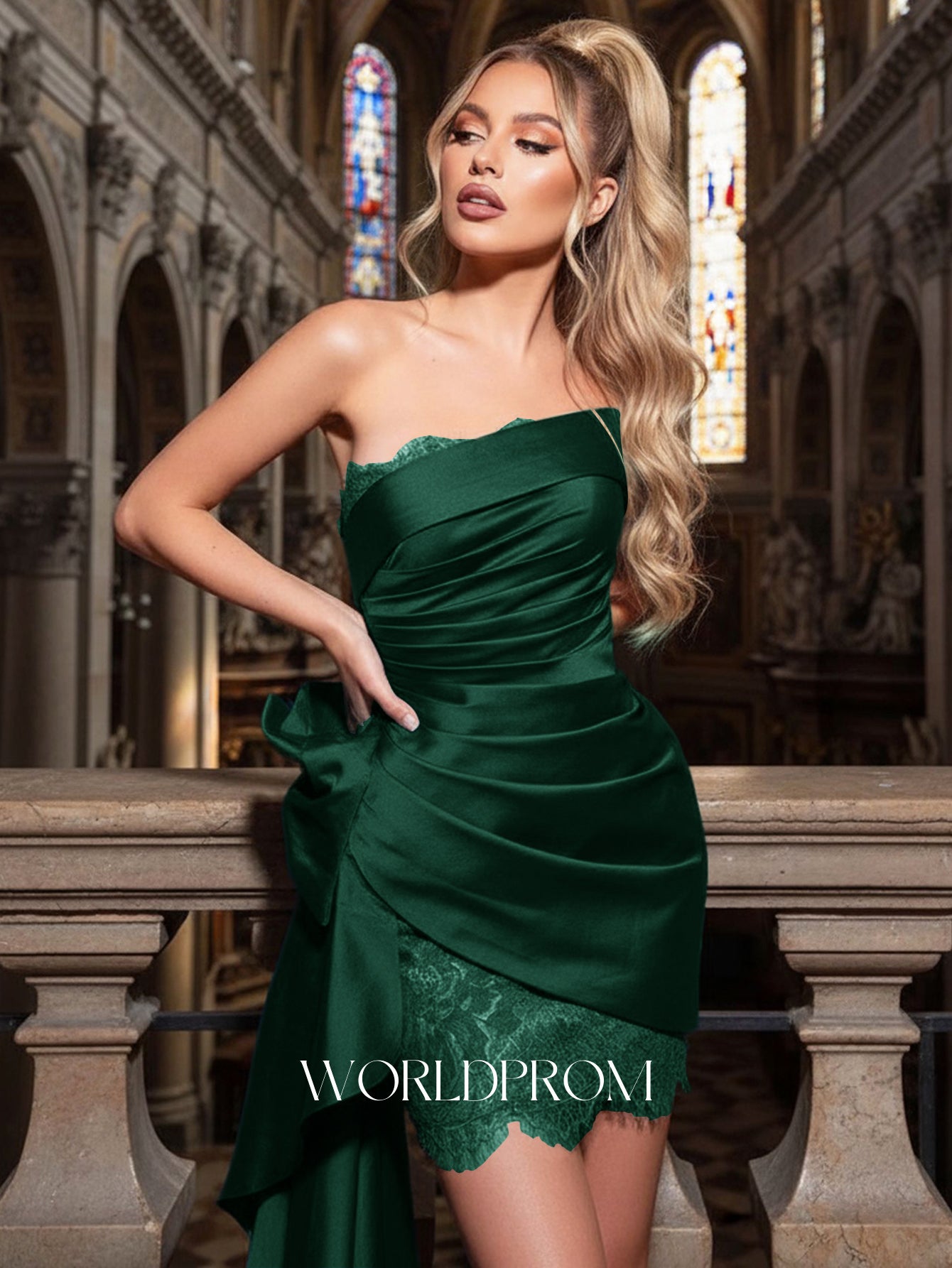 Asymmetrical Draped Satin Short Evening Gown With Bow Drop Waist - Emerald Green