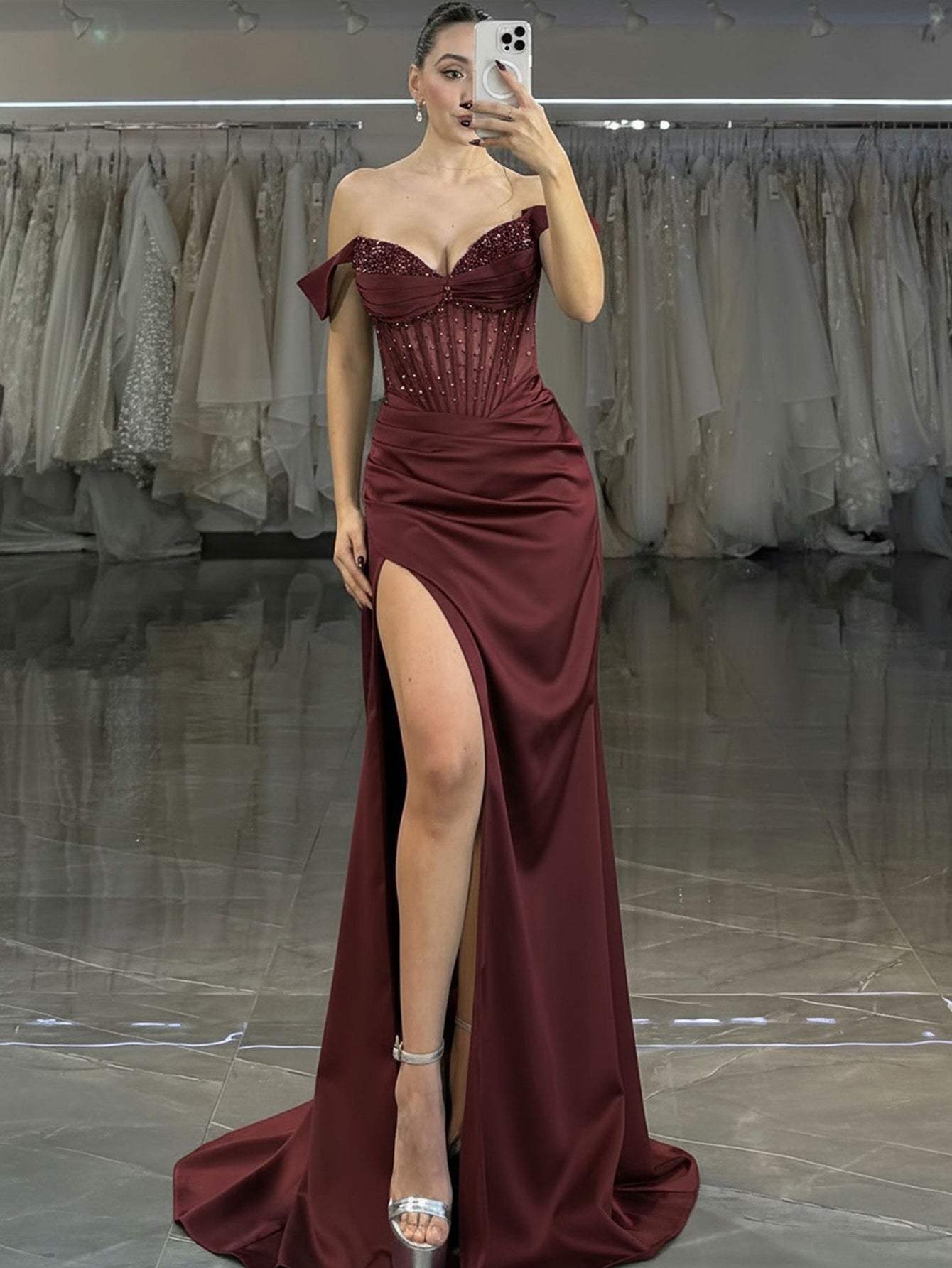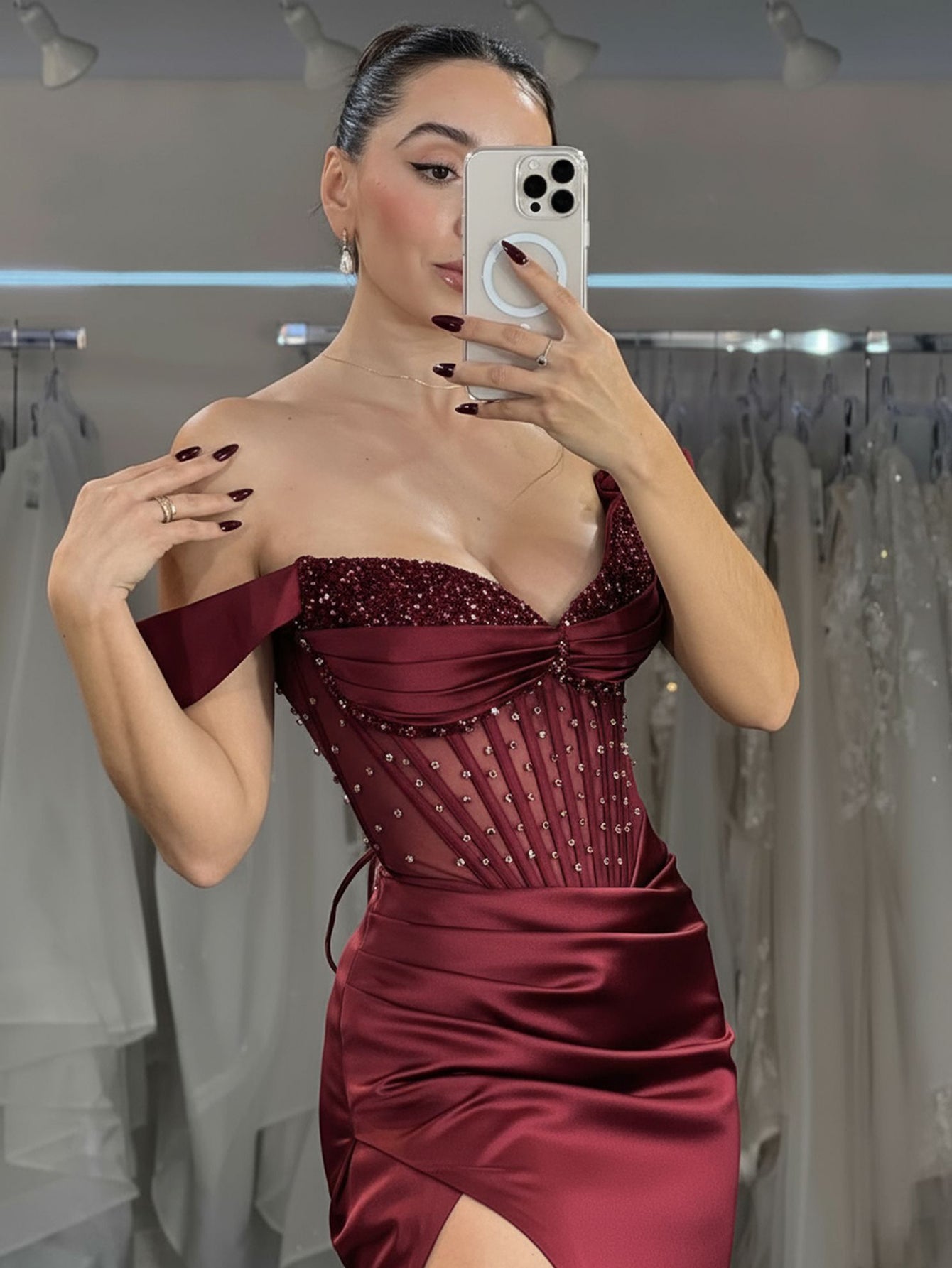 This Illusion gown features ruched bust and beaded on a sheer net bodice. The strapless dress for prom has a sweetheart neck and split hem. This trumpet green dress is ideal for party, evening or festivals.