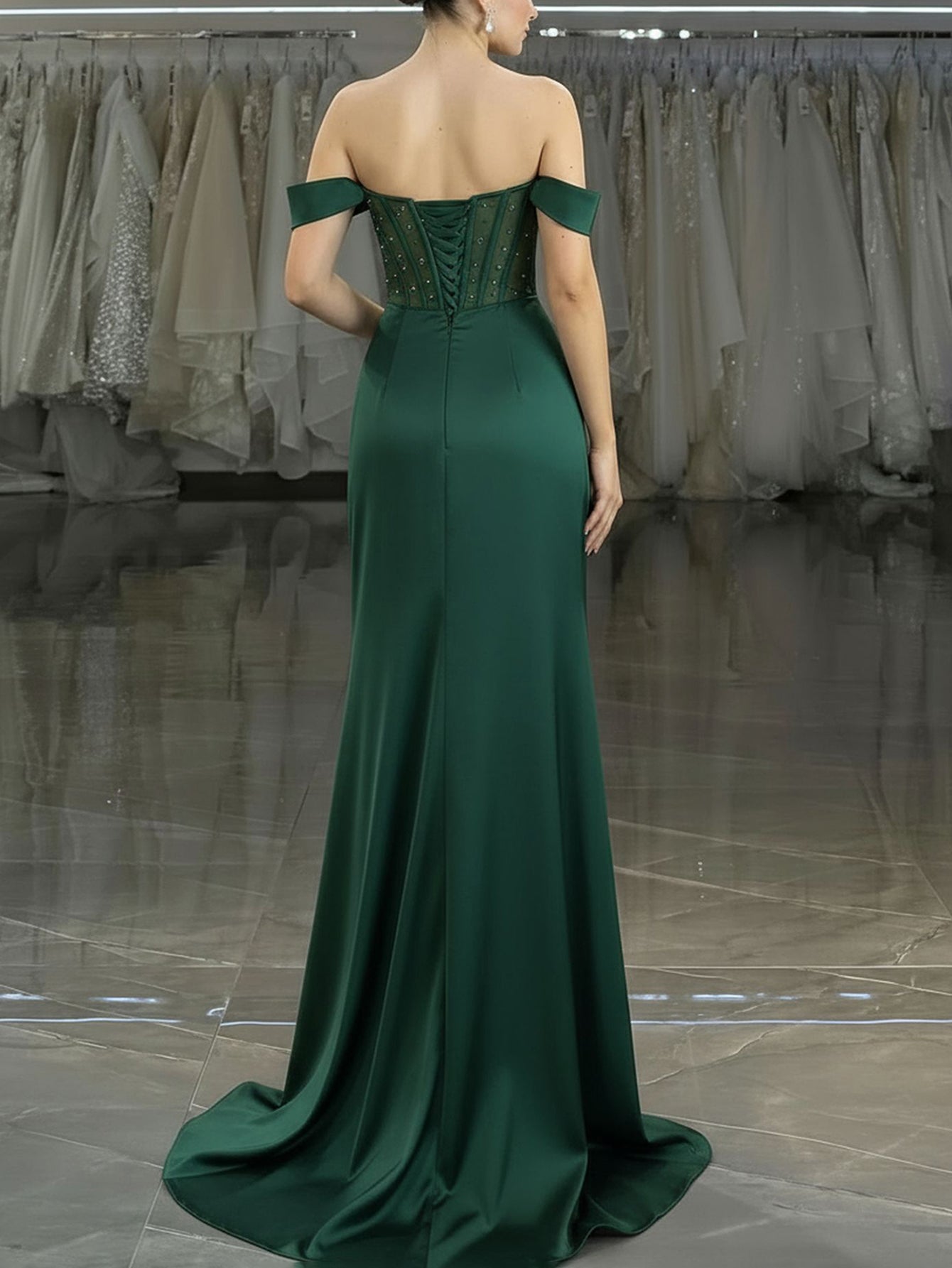 This Illusion gown features ruched bust and beaded on a sheer net bodice. The strapless dress for prom has a sweetheart neck and split hem. This trumpet green dress is ideal for party, evening or festivals.
