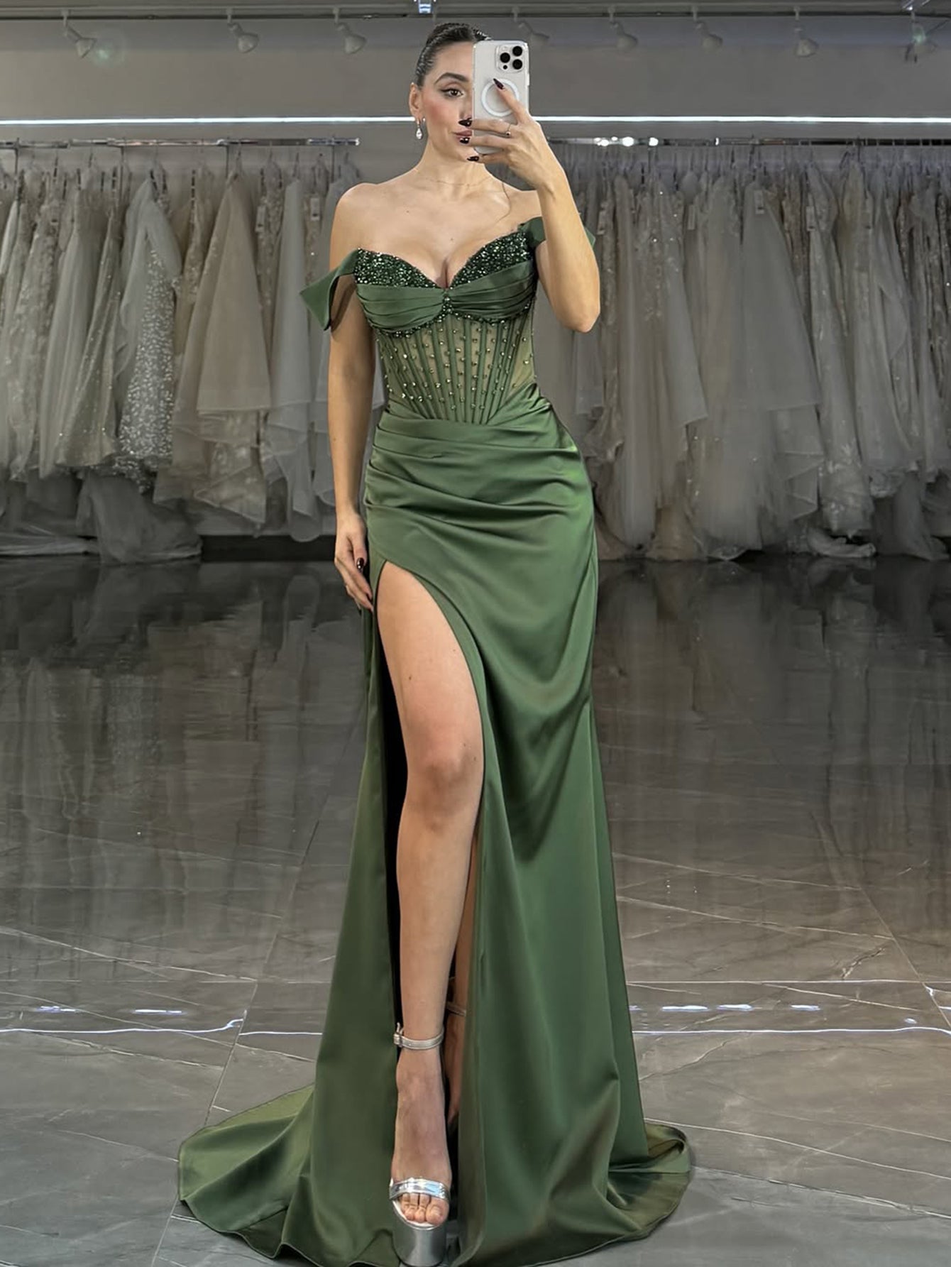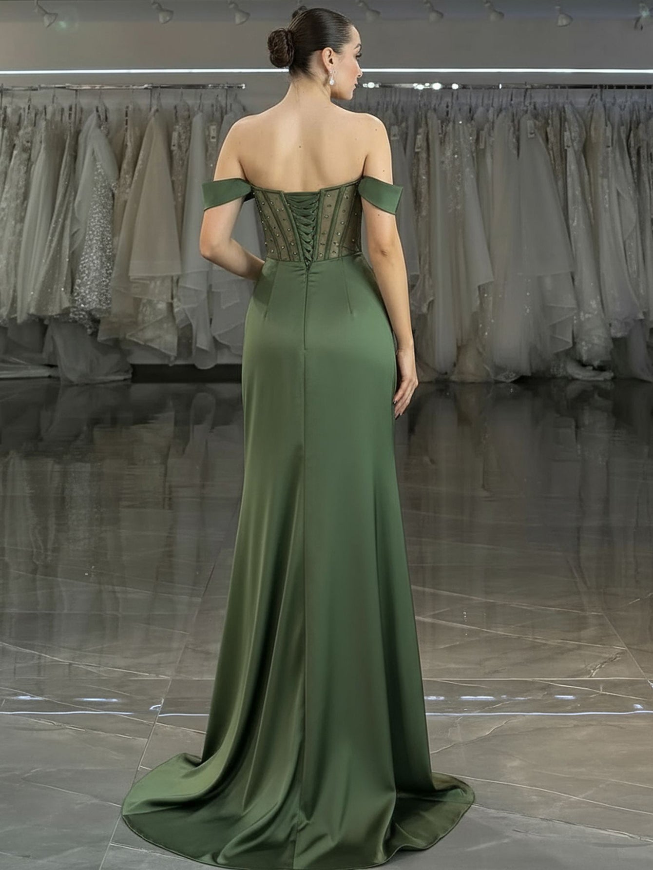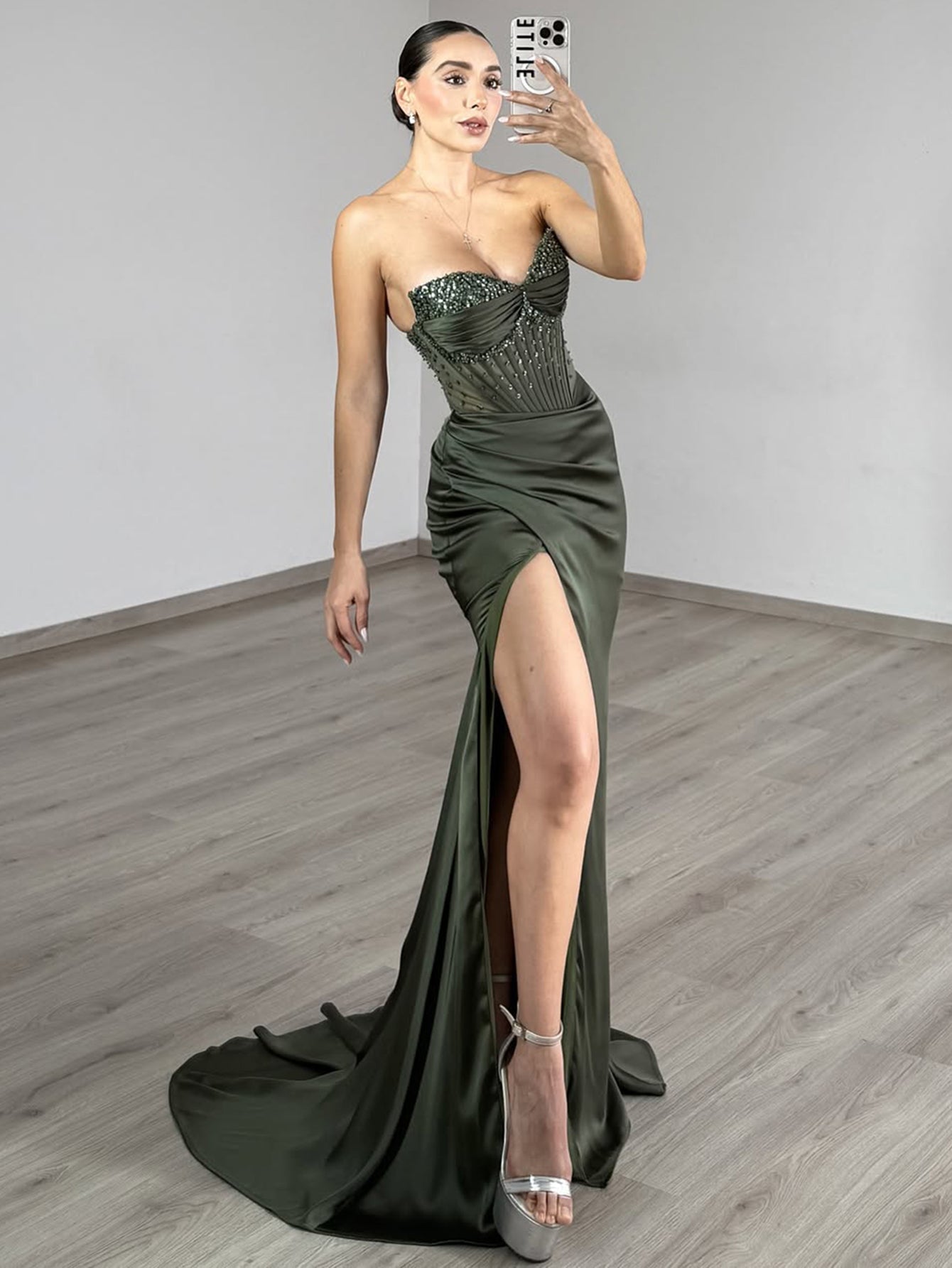Beaded Strapless Illusion Bodice Mermaid Prom Dress Long - Olive Green
