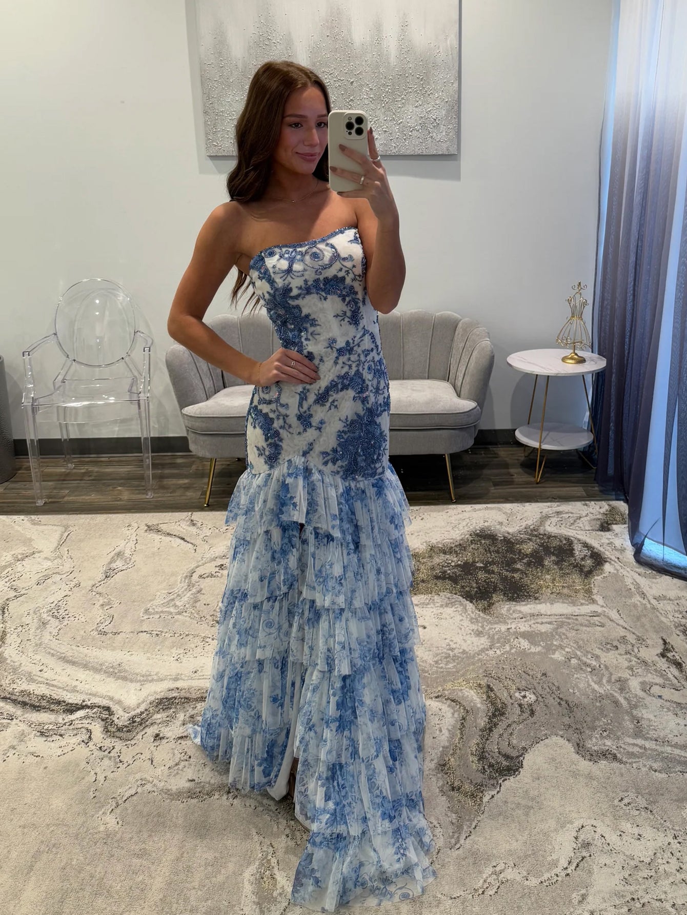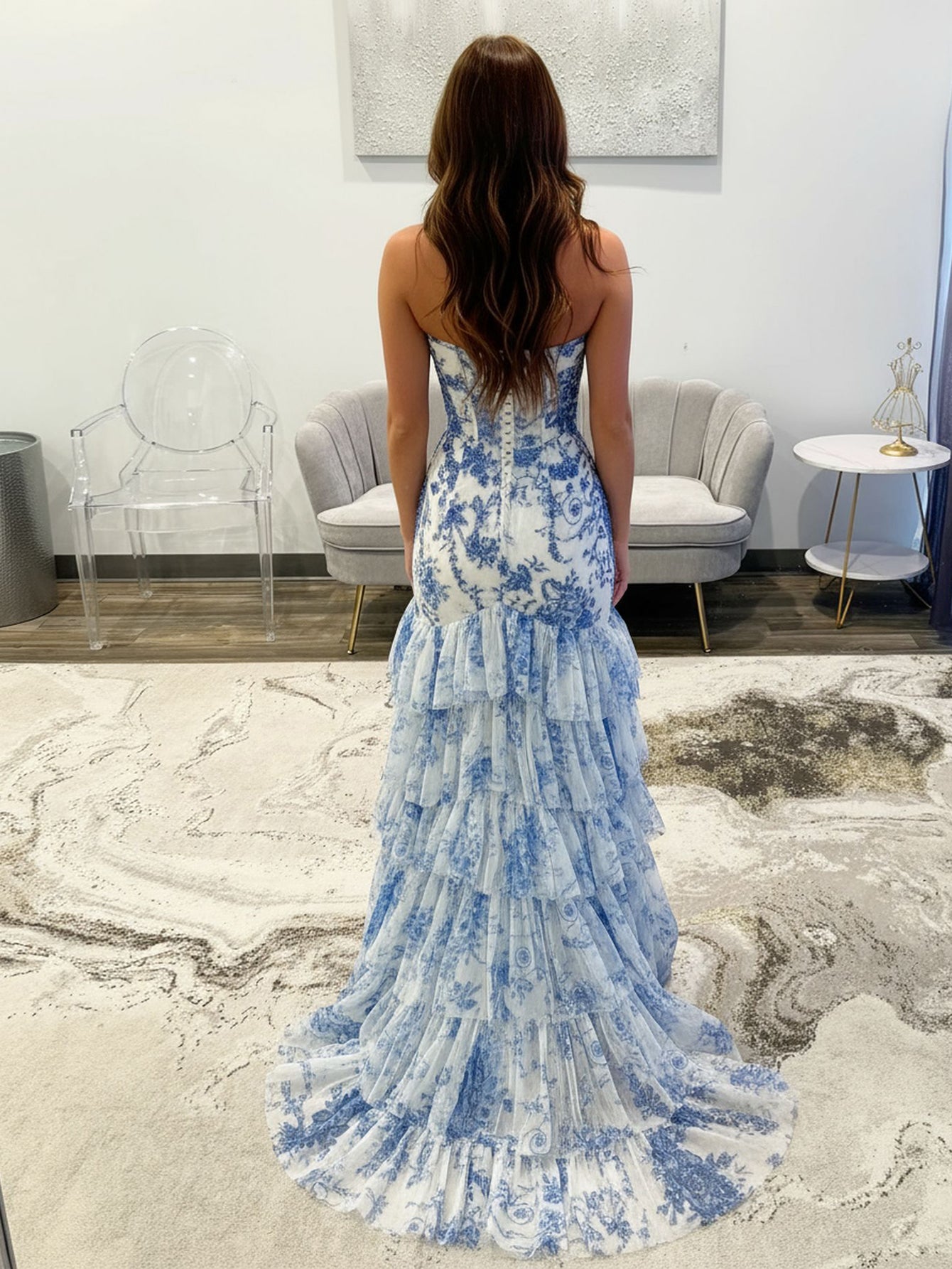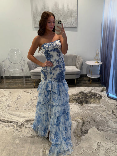 Beading Bodice Embroidery Mermaid Prom Dress With Ruffle Hem - Baby Blue Floral