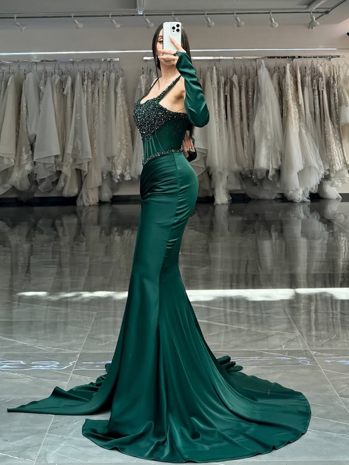 This satin prom gown features beading corset with detachable sleeves on the bodice. The tank dress has a sweetheart neckline and drop hem. Worldprom mermaid prom dresses are ideal for party, evening or festivals.