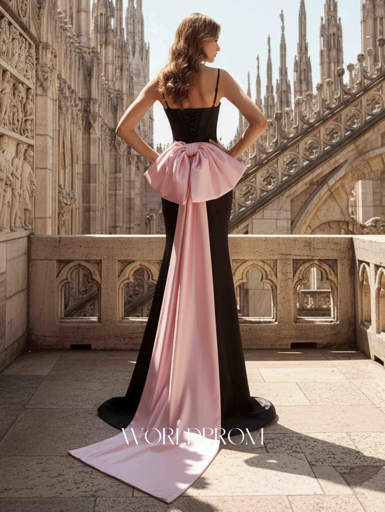 Big Bow Back Spaghetti Shoulder Strap Bodice Mermaid Long Prom Dress With Slit - Black