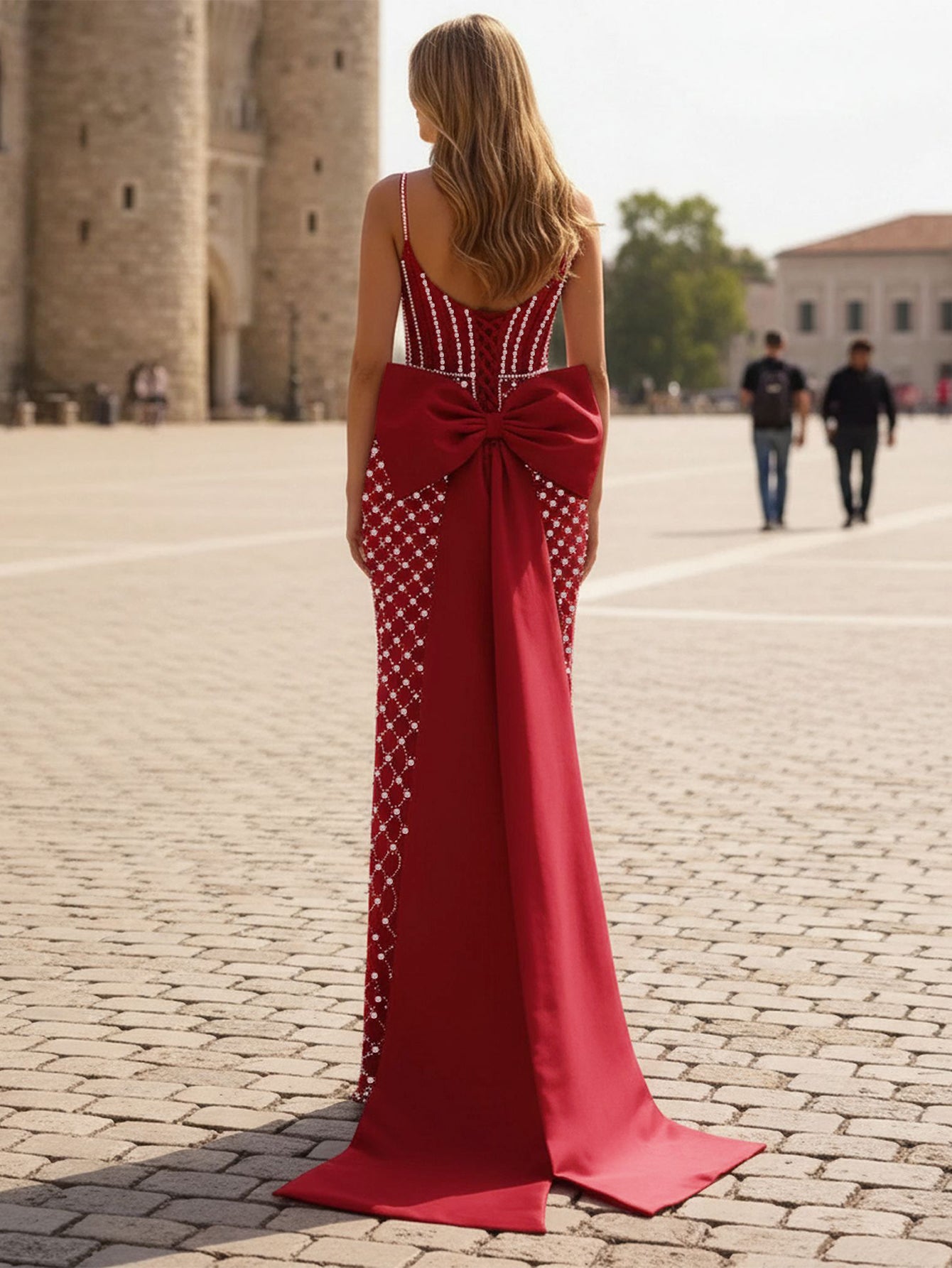 Big Bow Back Sparkly Beading Corset Long Mermaid Prom Dress - Red