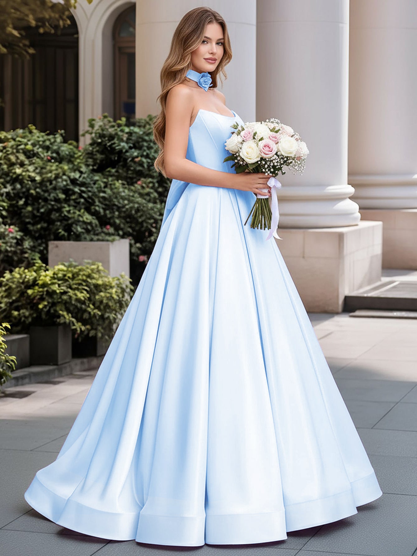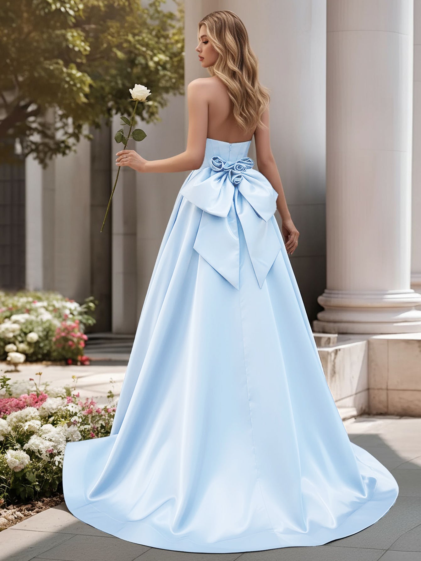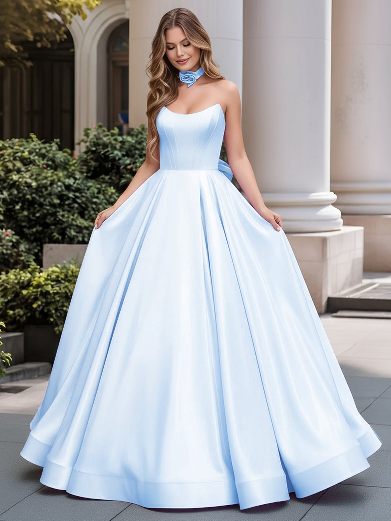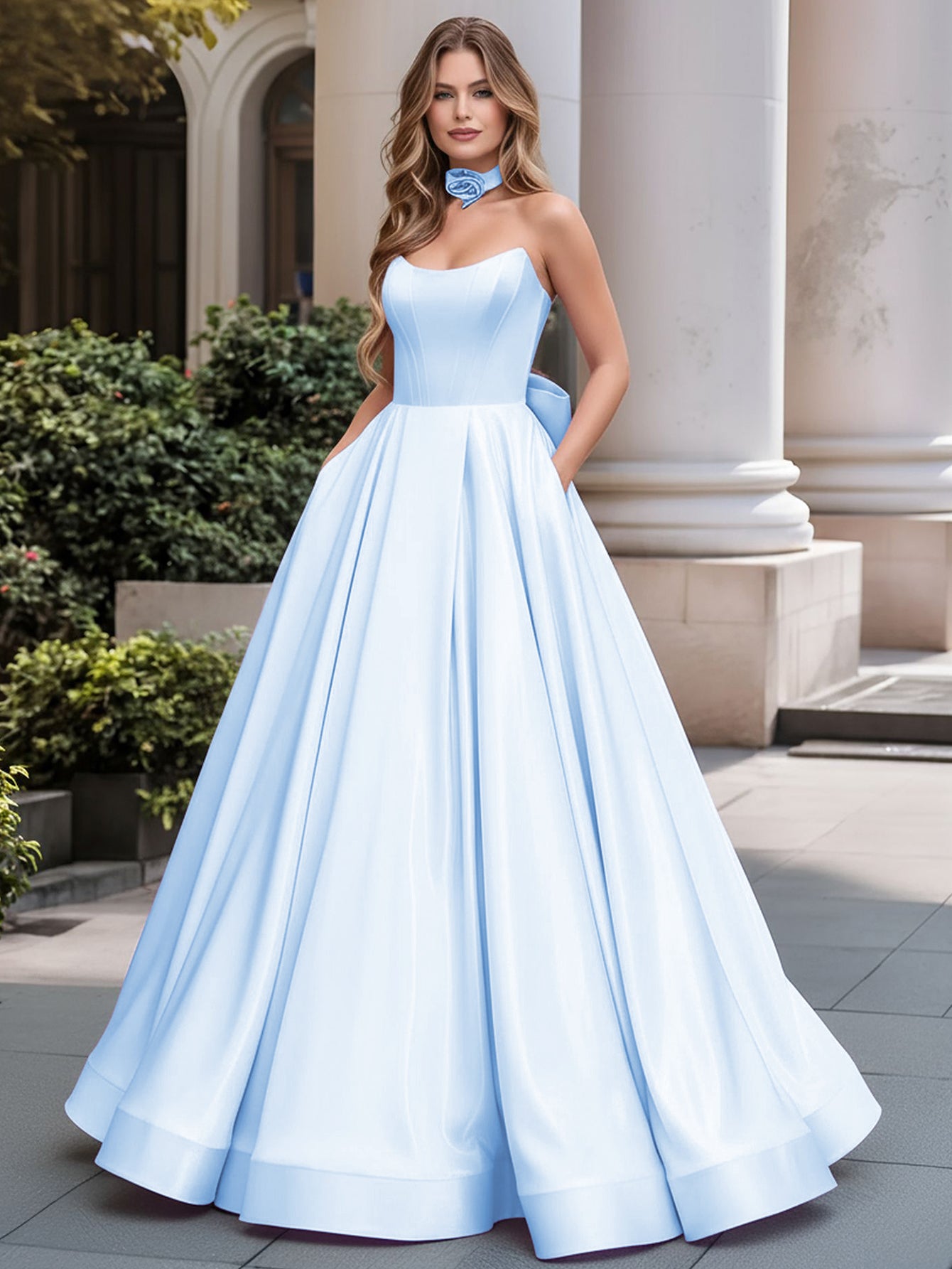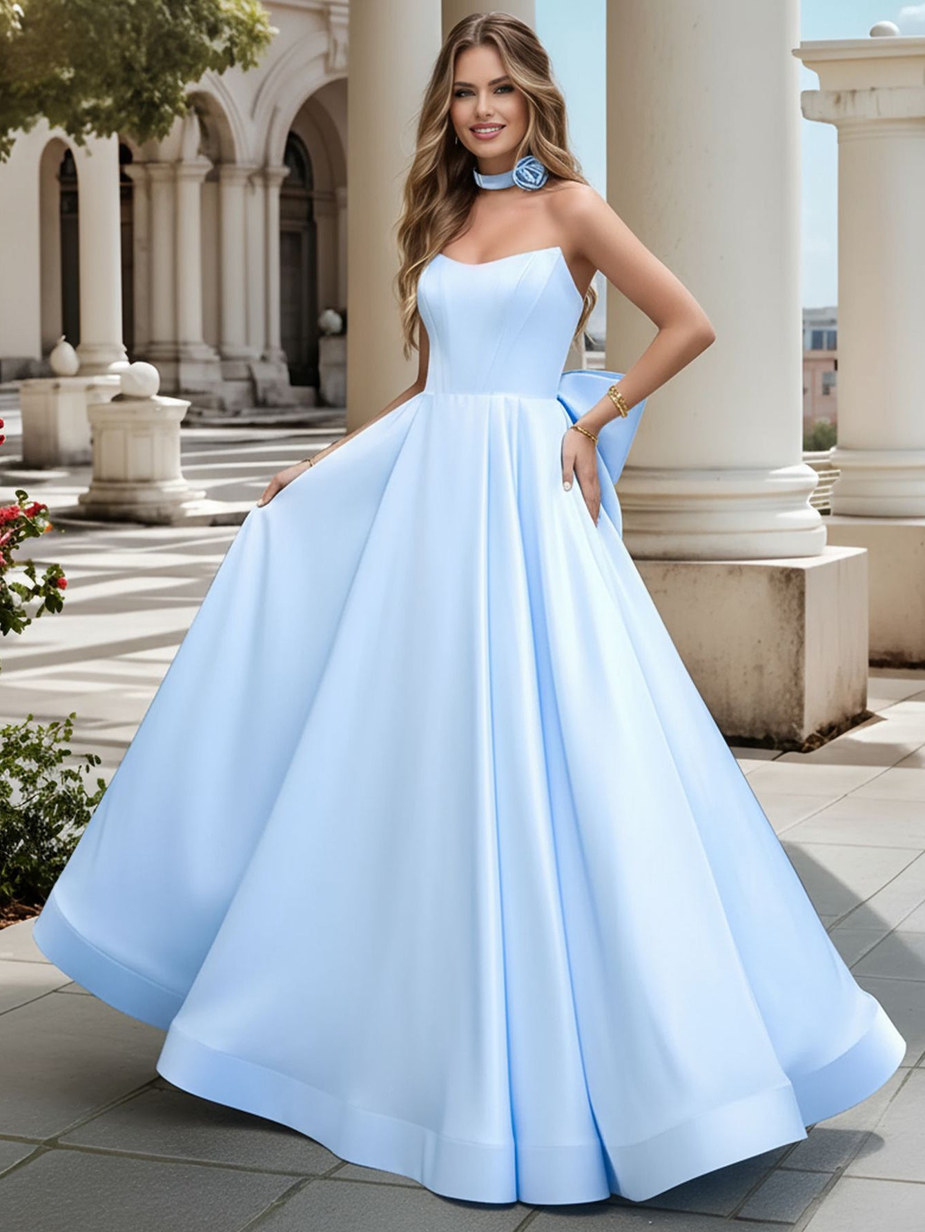 Big Bow Boned Ball Gown Prom Dress With Pocket - Sky Blue