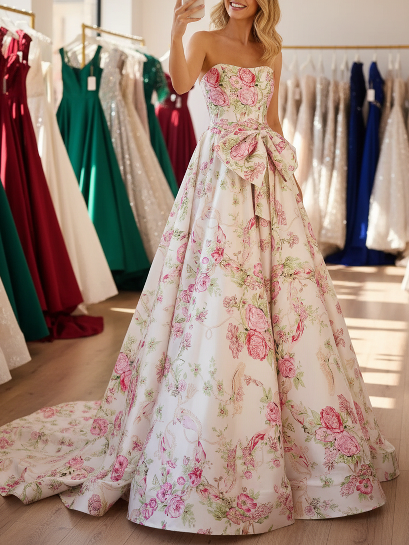 This satin prom gown features big bow on the bodice. The strapless floral dress has a scoop neckline and pleated hem. Worldprom ball gown prom dresses are ideal for party, evening or festivals.
