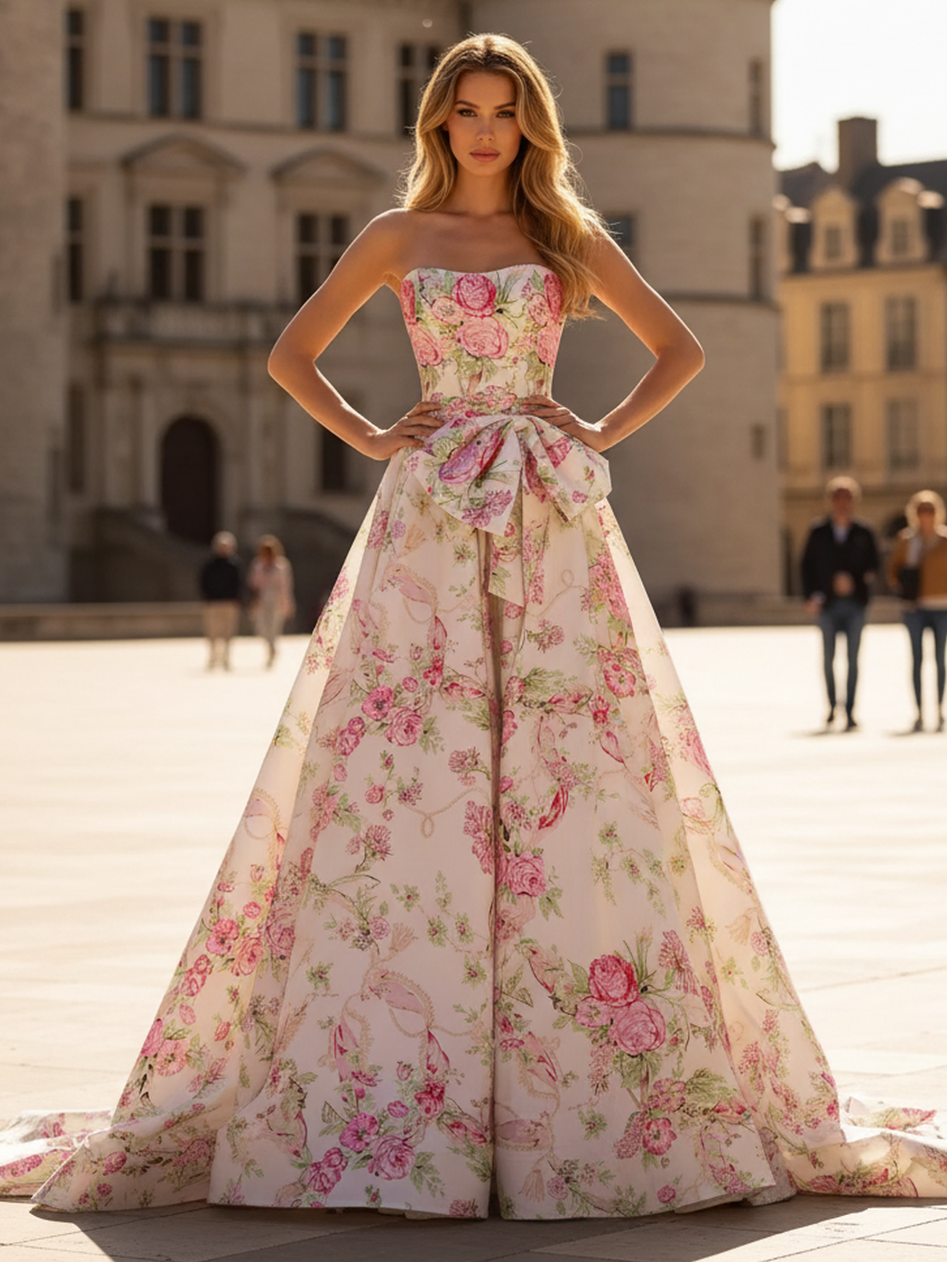 Big Bow Front Floral Corset Long Prom Ball Gown Dress - Pink Floral