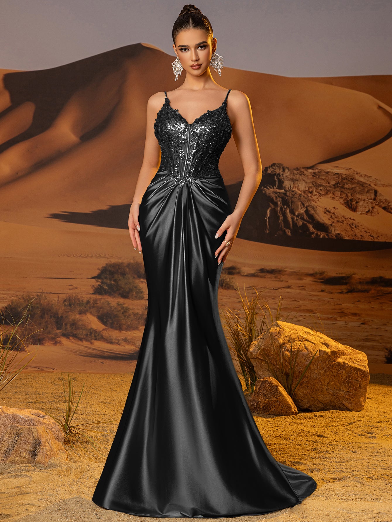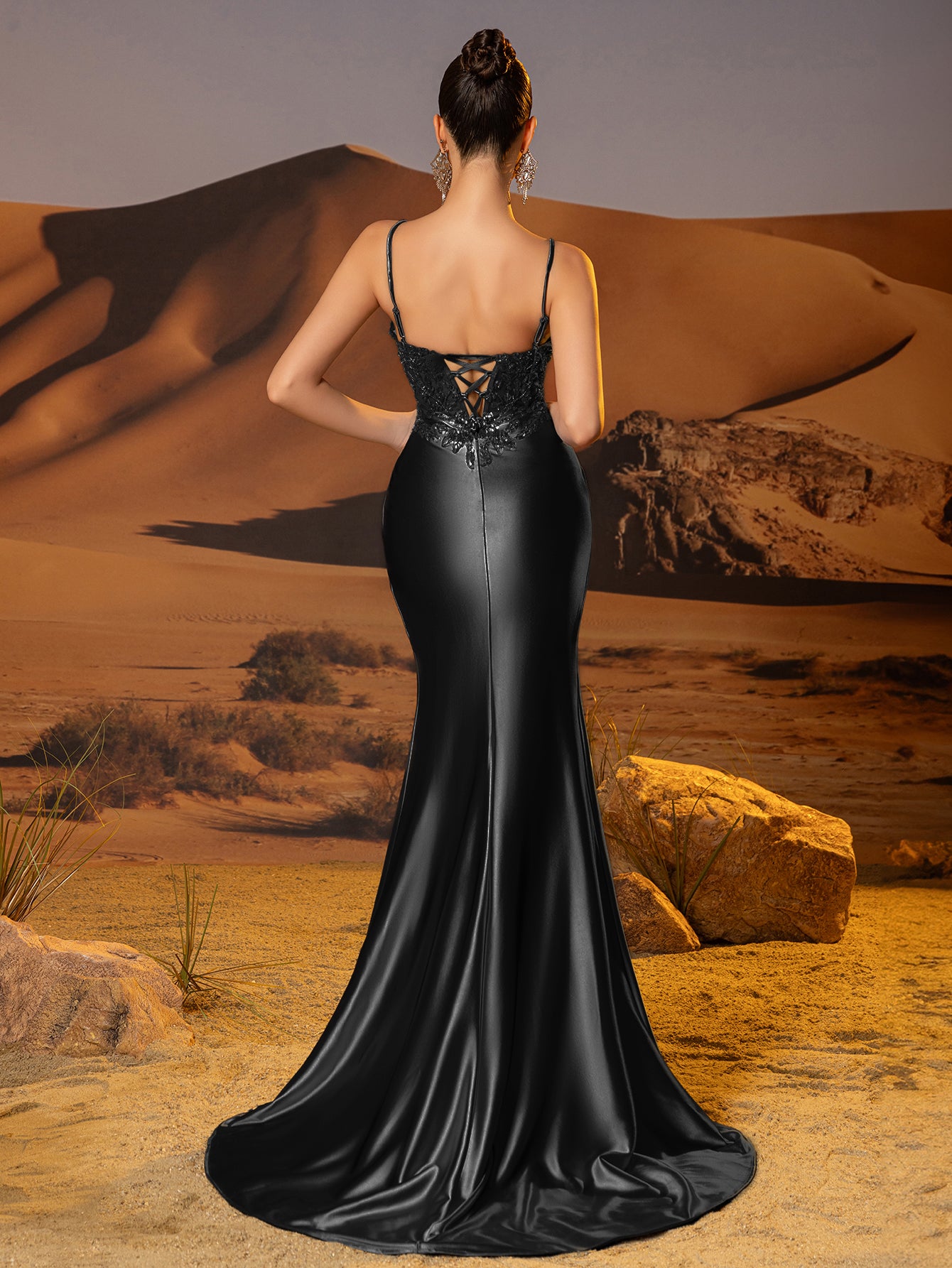This satin prom gown features lace embroidery on the bodice. The backless maxi dress has a V-neckline and pleated hem. Mermaid formal dresses are ideal for party, evening or festivals.