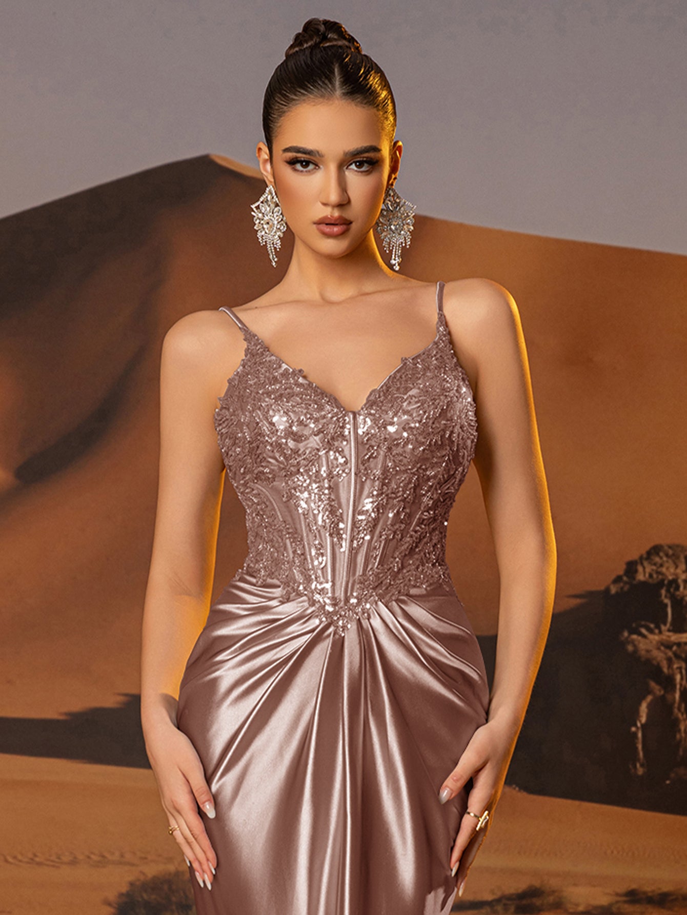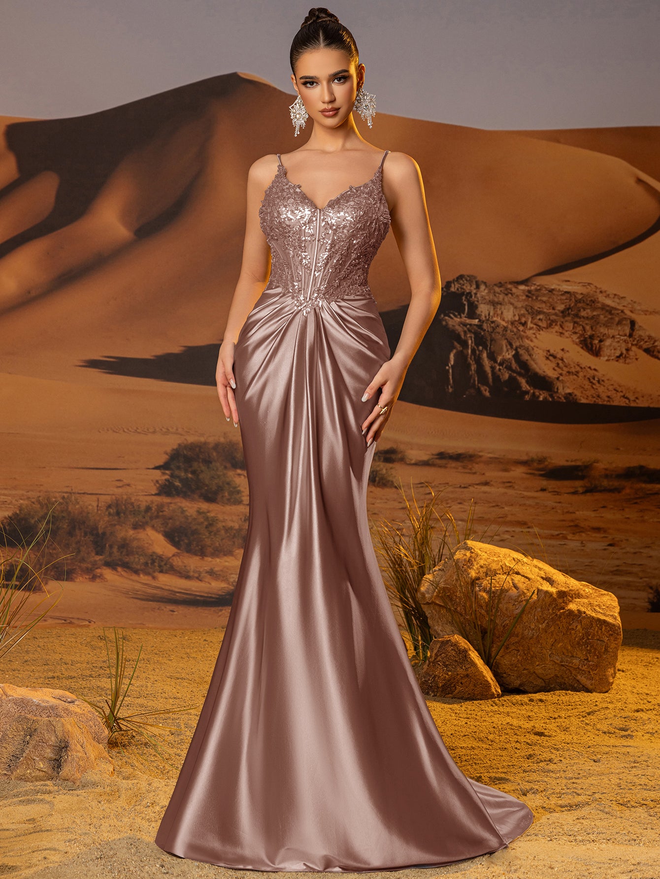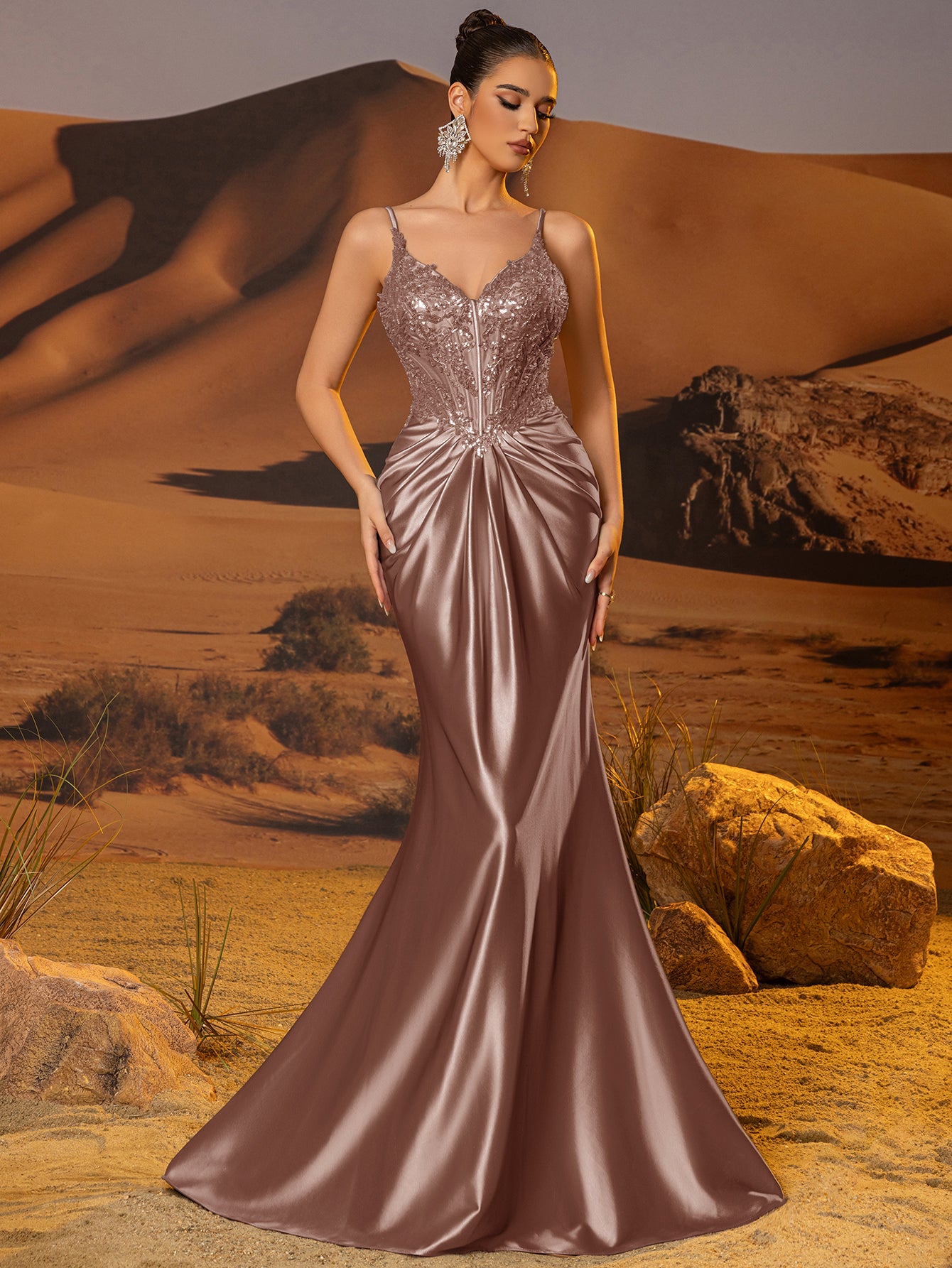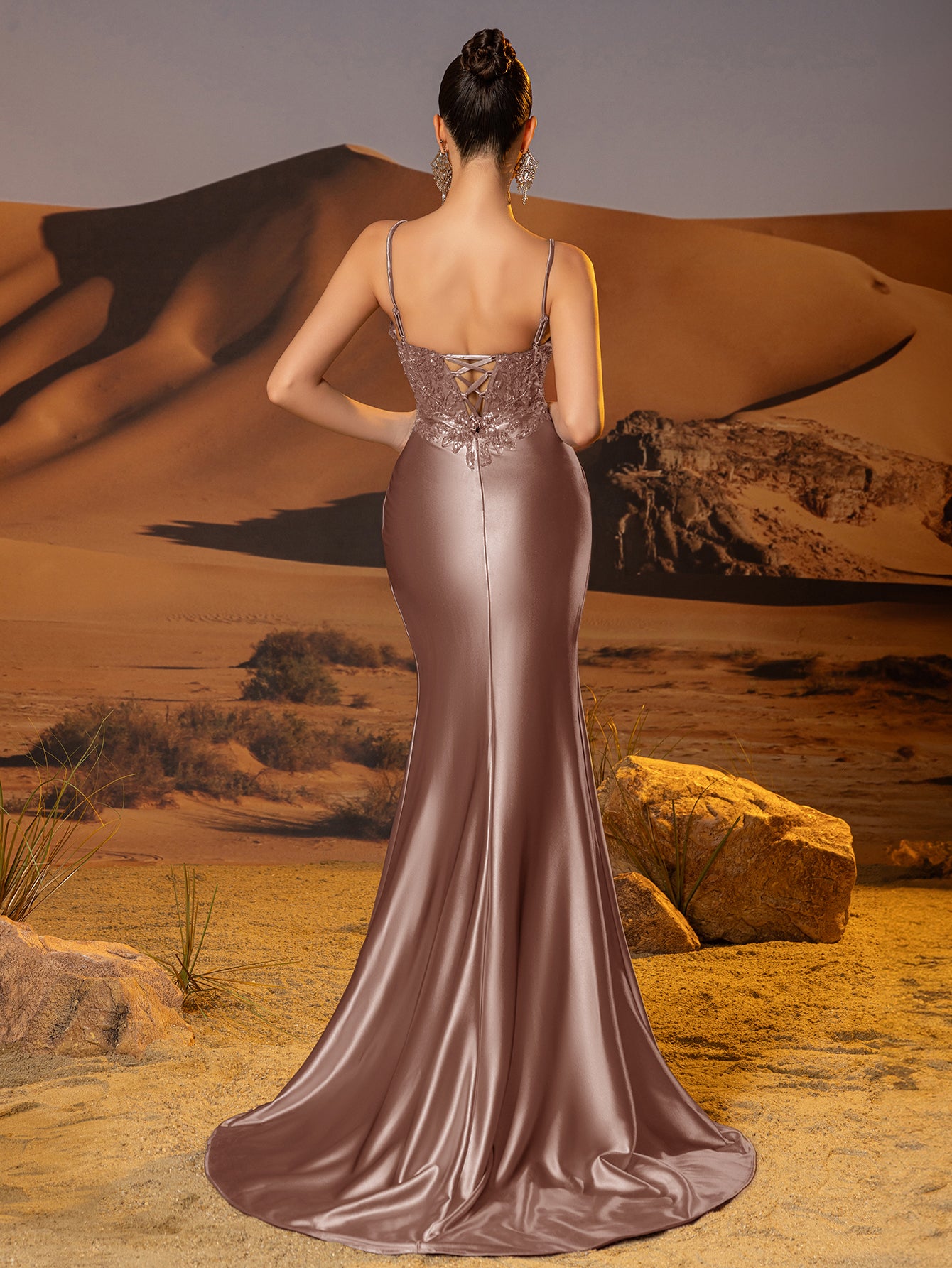 This satin prom gown features lace embroidery on the bodice. The backless maxi dress has a V-neckline and pleated hem. Mermaid formal dresses are ideal for party, evening or festivals.