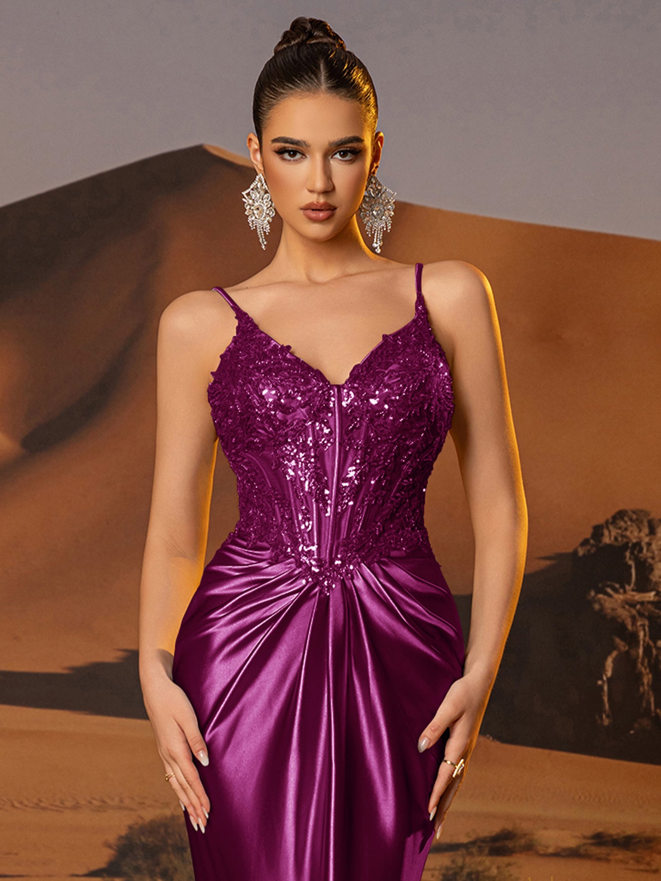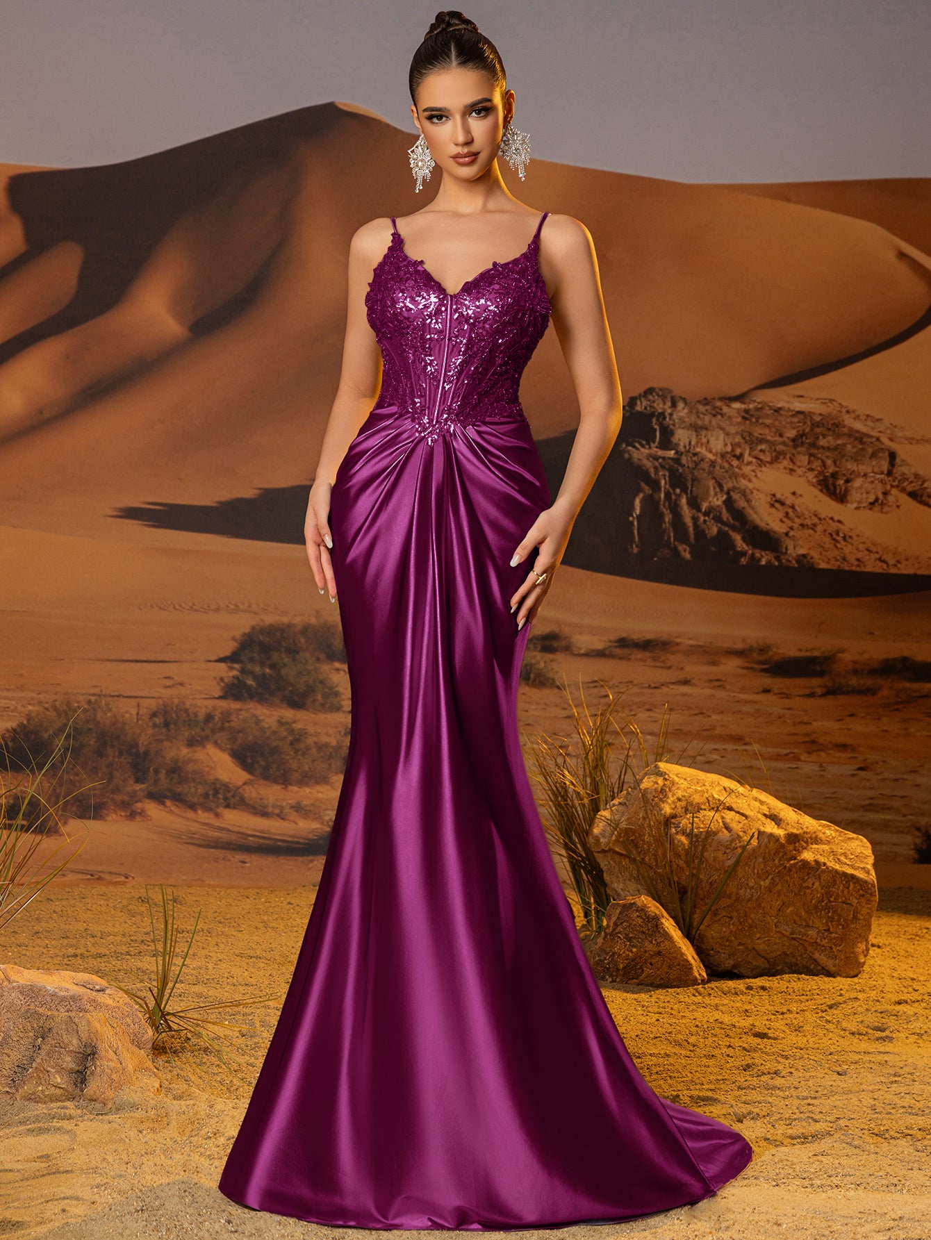 This satin prom gown features lace embroidery on the bodice. The backless maxi dress has a V-neckline and pleated hem. Mermaid formal dresses are ideal for party, evening or festivals.