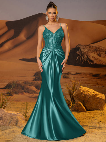 This satin prom gown features lace embroidery on the bodice. The backless maxi dress has a V-neckline and pleated hem. Mermaid formal dresses are ideal for party, evening or festivals.