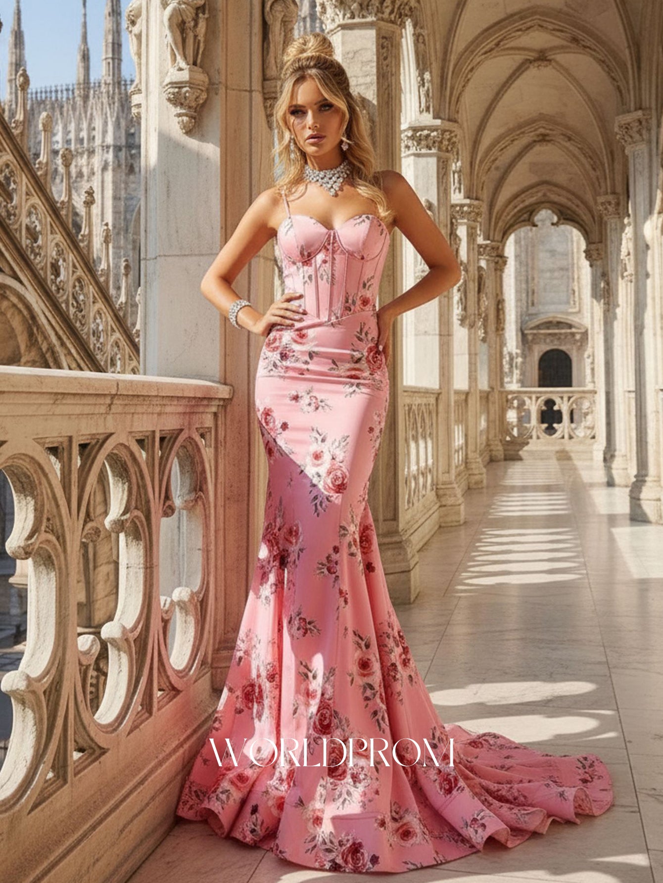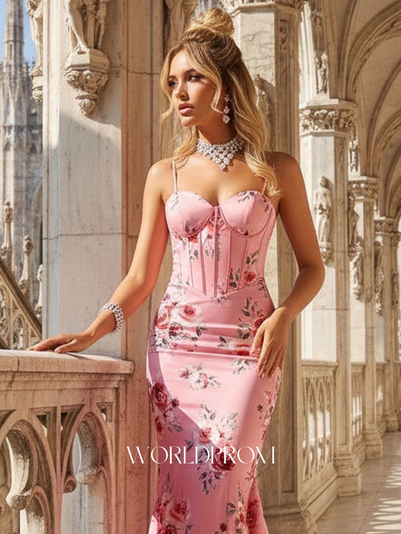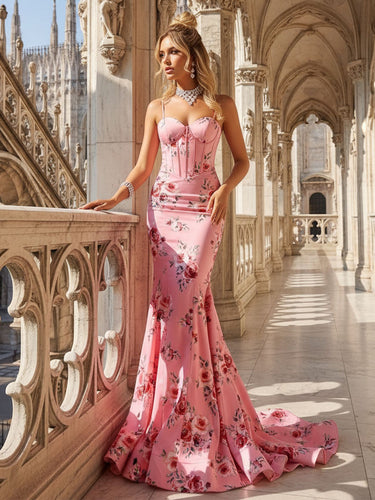 Bodice Printing Spaghetti Strap Sexy Mermaid Prom Dress - Pink Floral