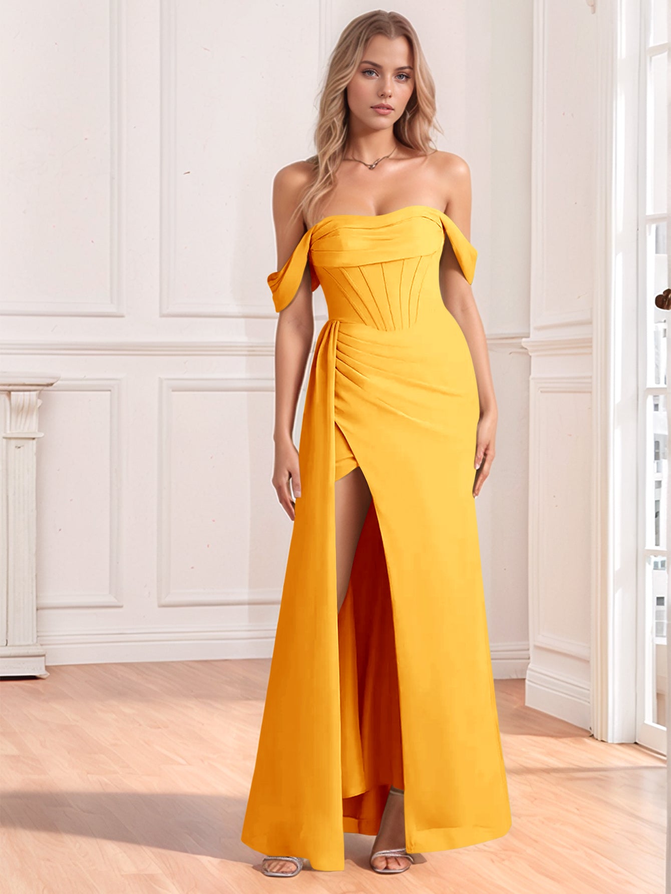 Boned Off Shoulder Waist Drop Chiffon Bridesmaid Dress - Mustard Yellow