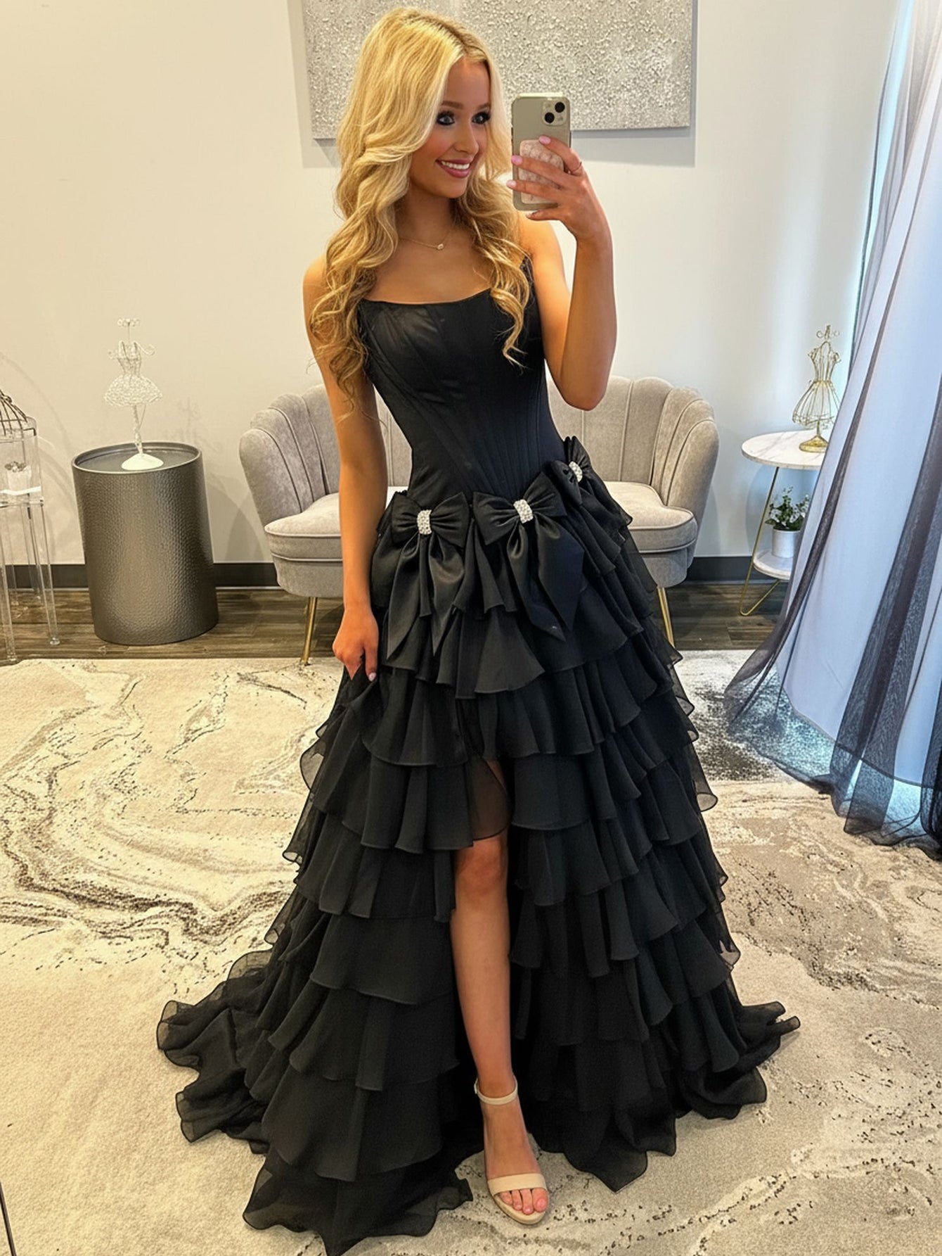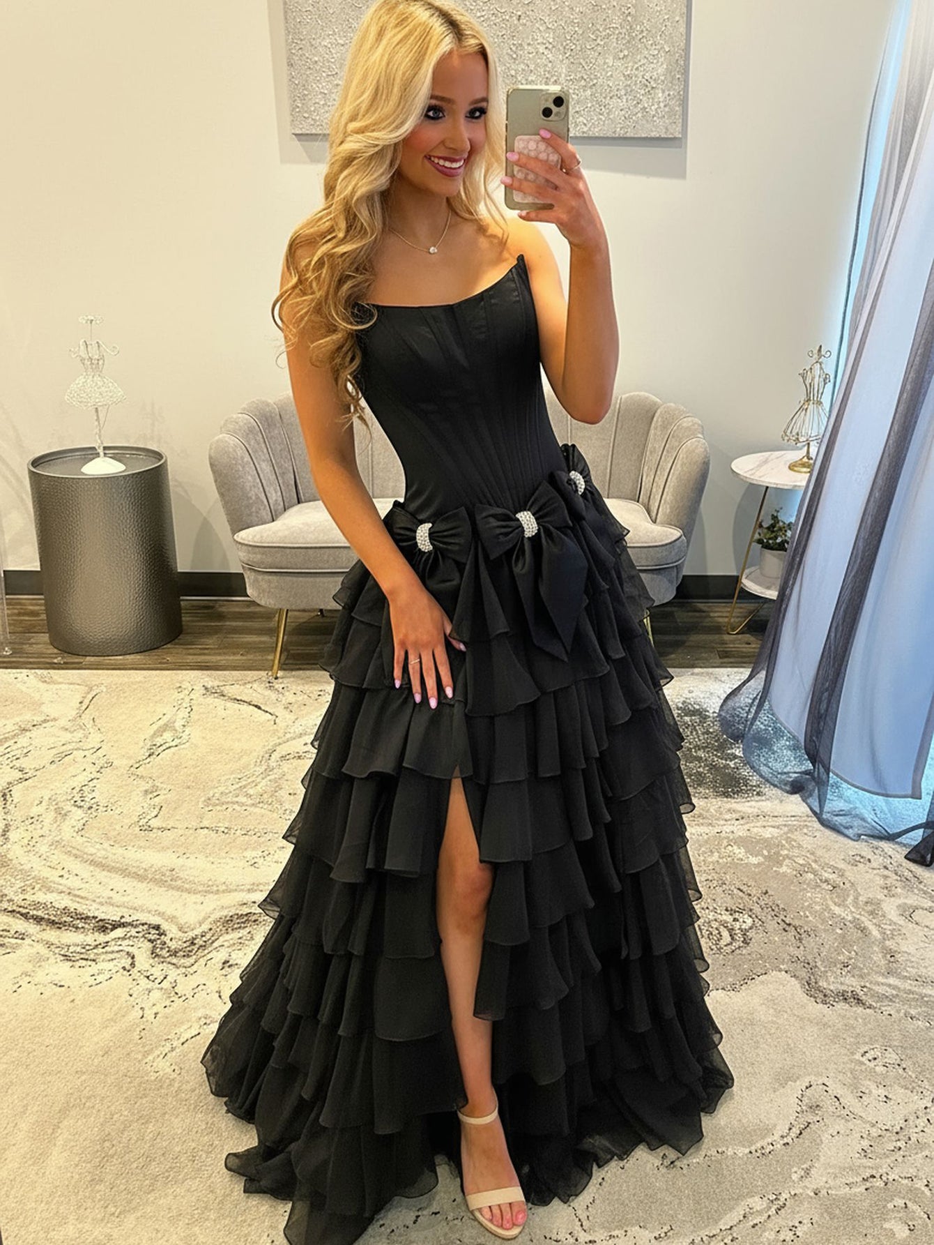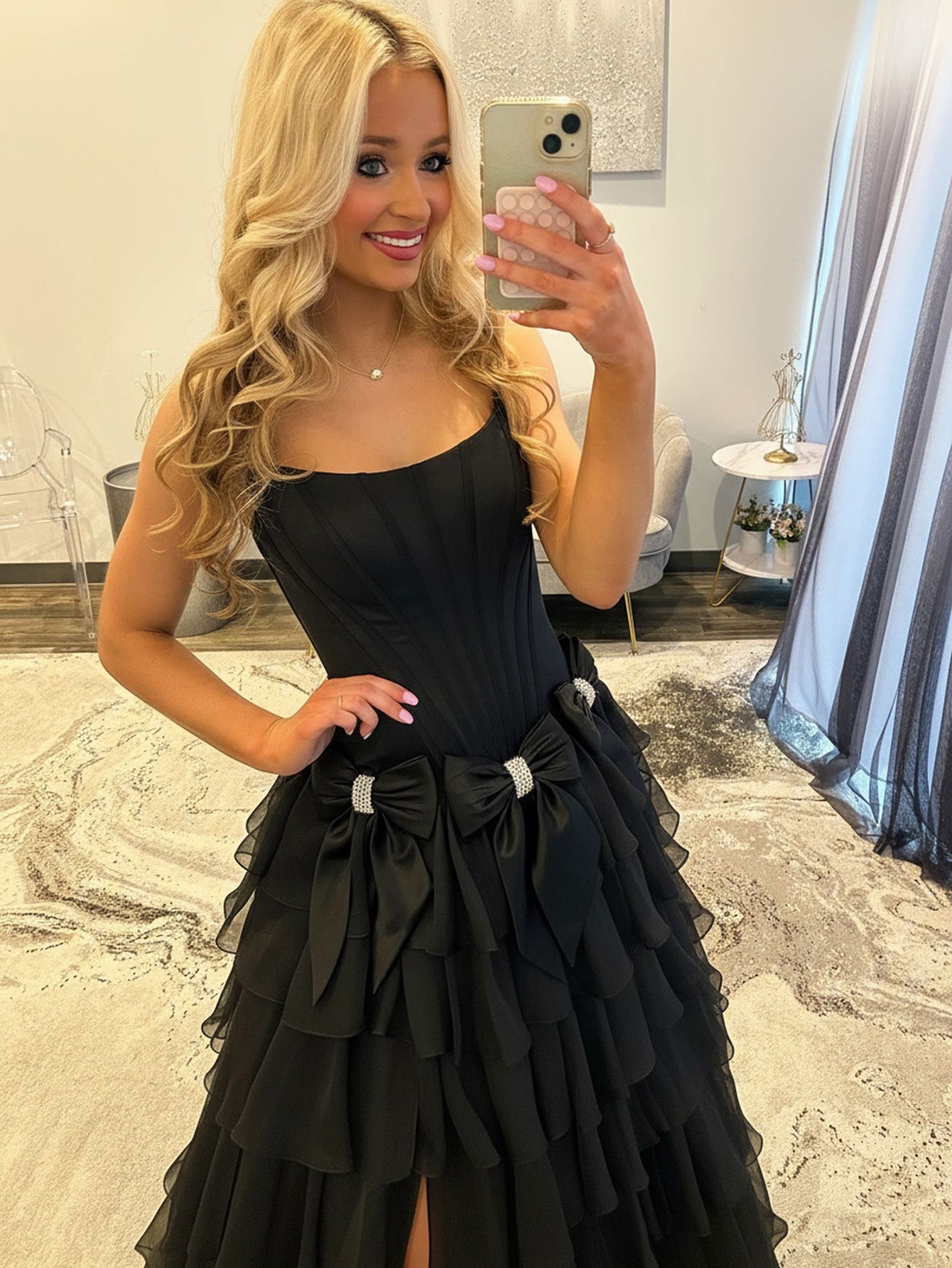 Boned Strapless Tiered Ball Gown Prom Dress Long With Bow - Black