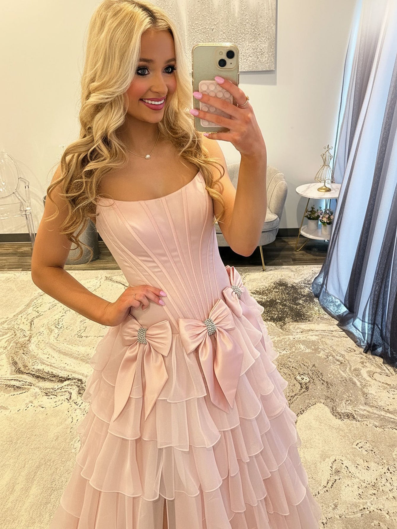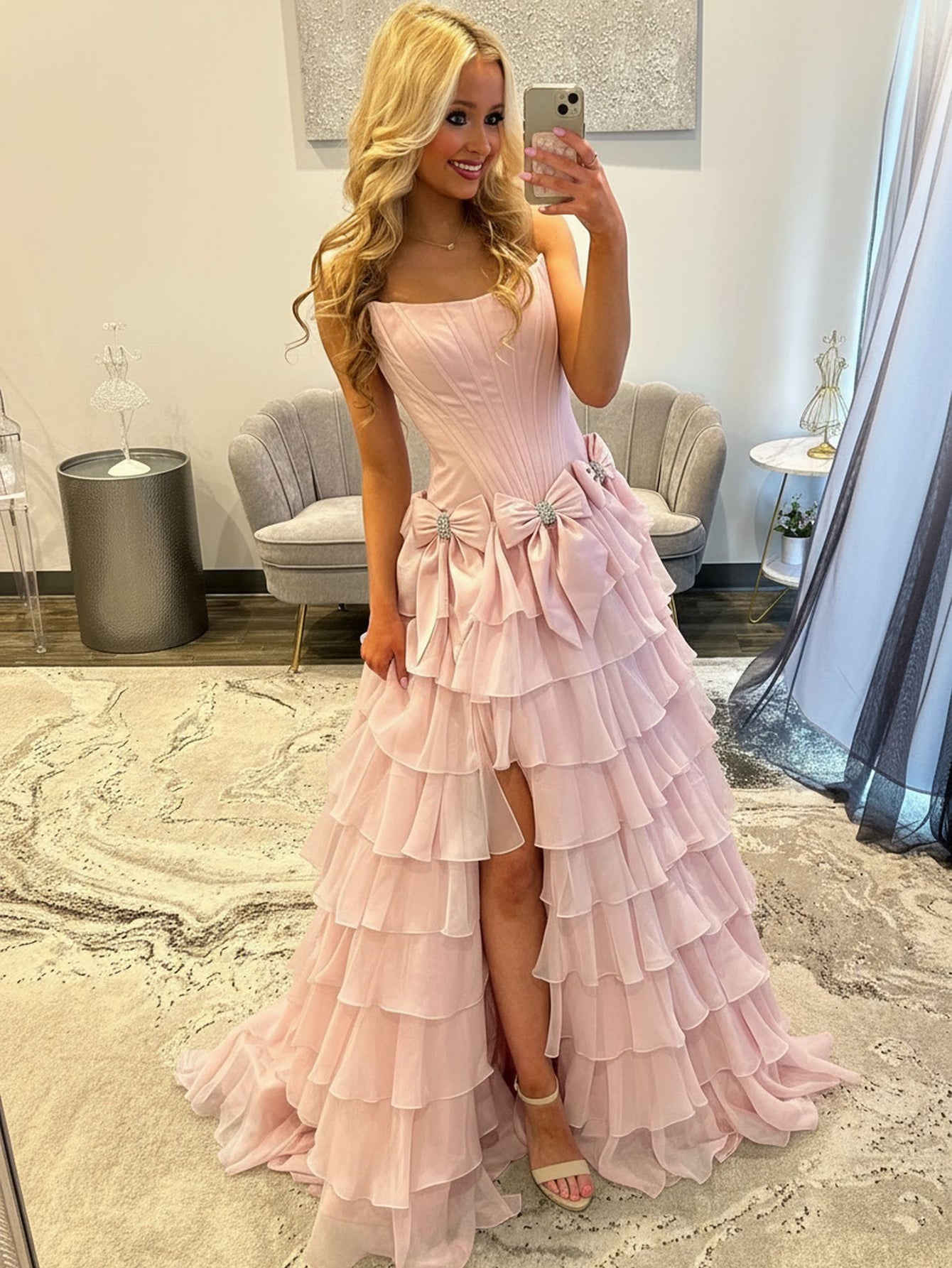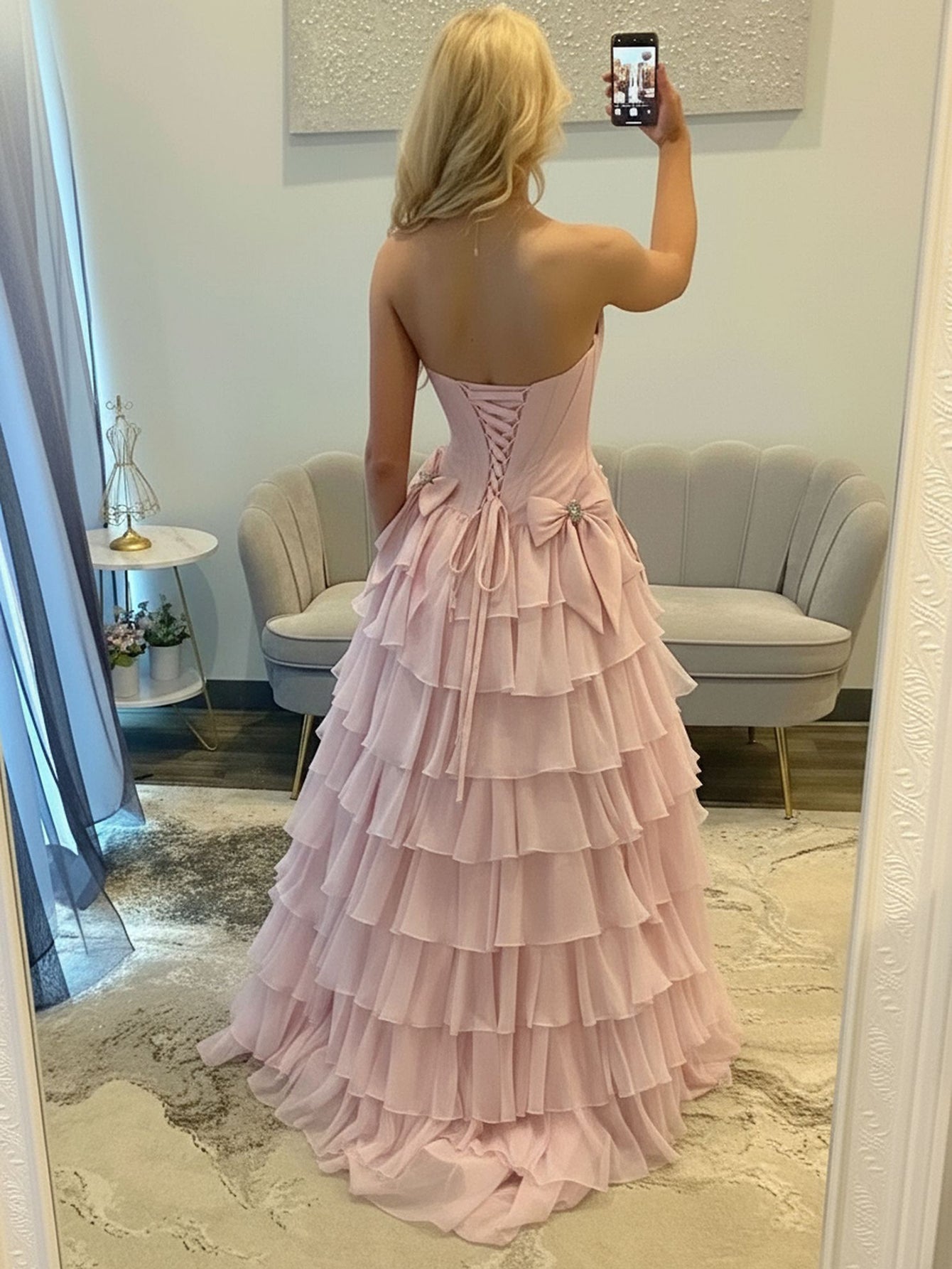 Boned Strapless Tiered Ball Gown Prom Dress Long With Bow - Blush Pink