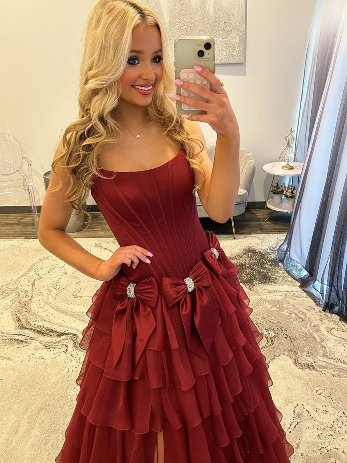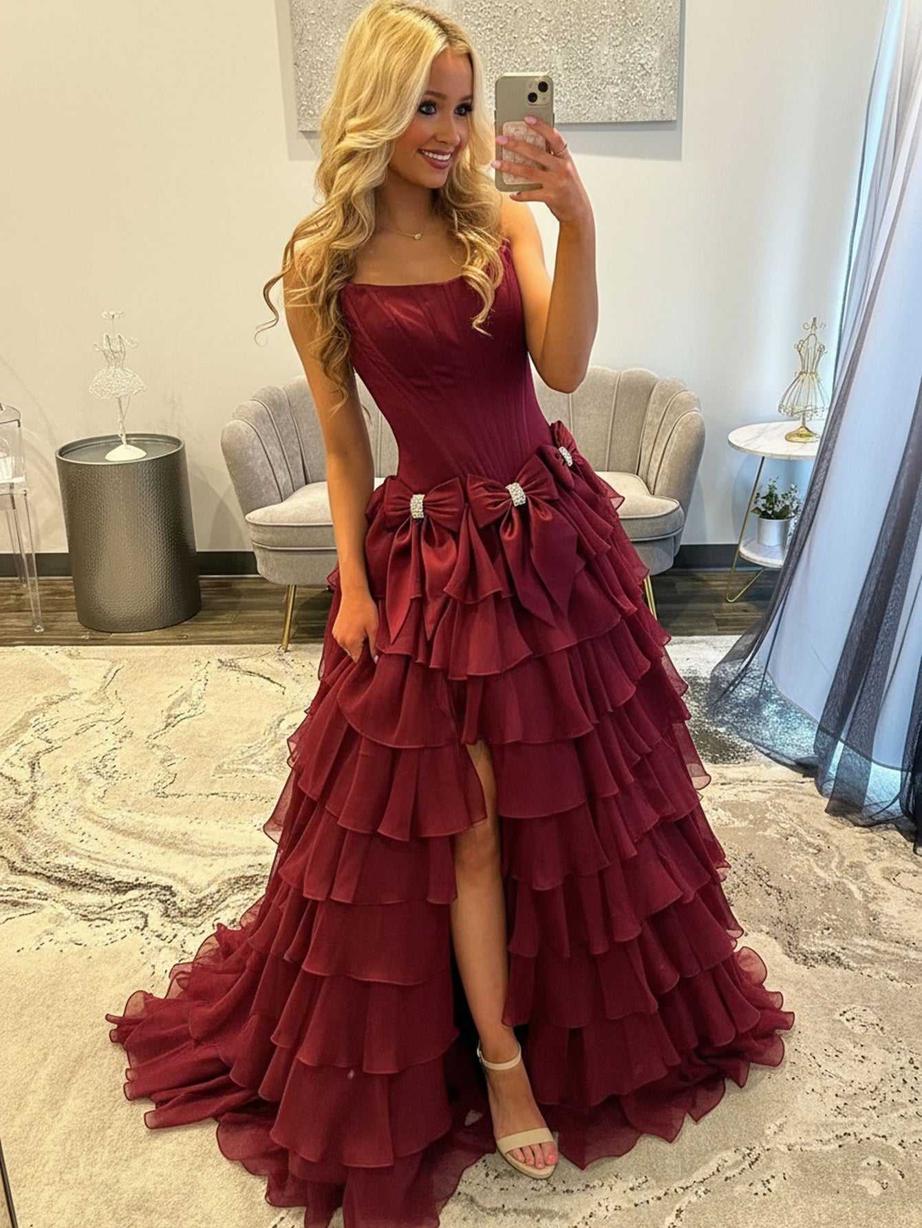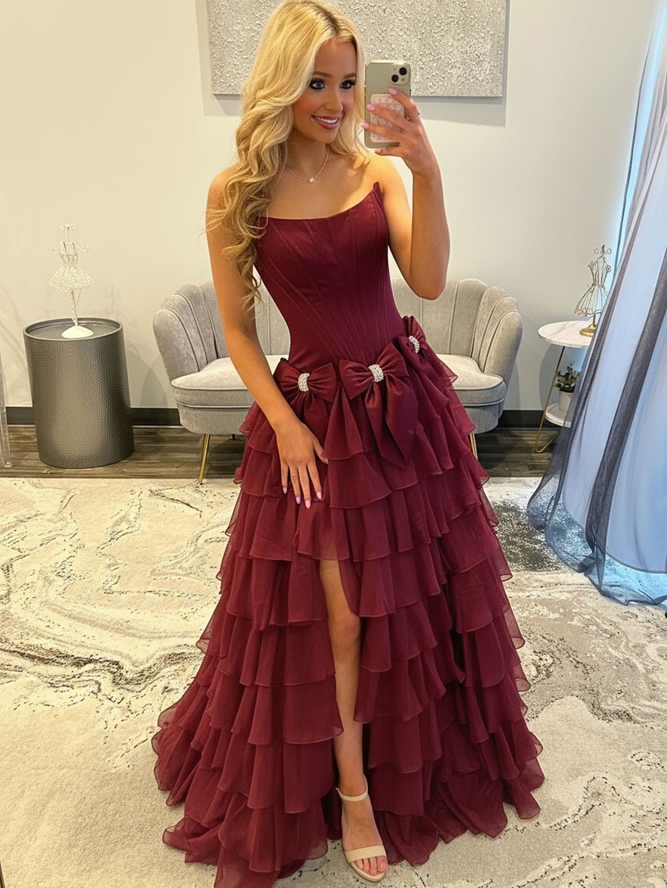 Boned Strapless Tiered Ball Gown Prom Dress Long With Bow - Burgundy