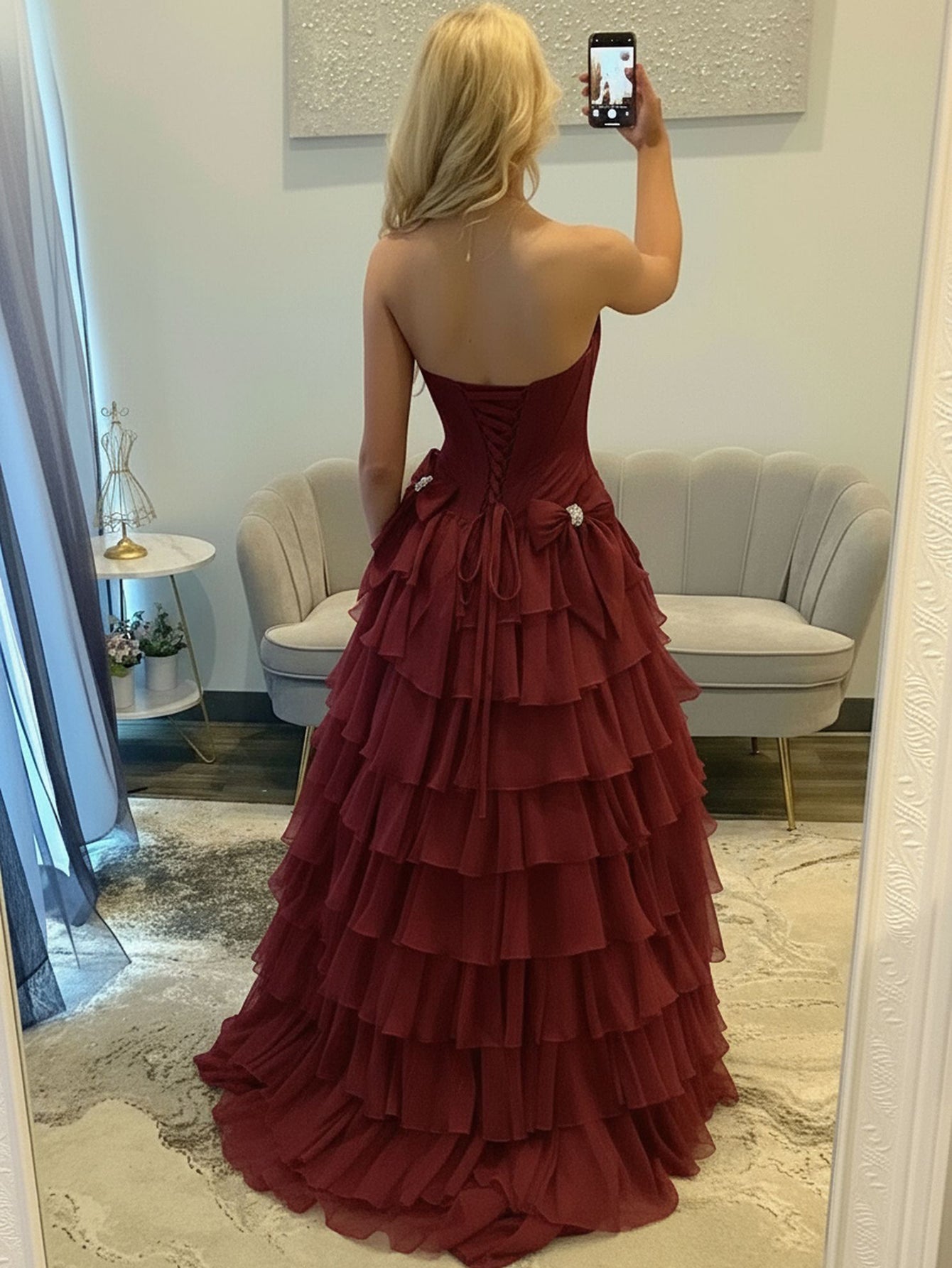 Details: Backless, Fitted Waist, Tiered, Boned, Bow