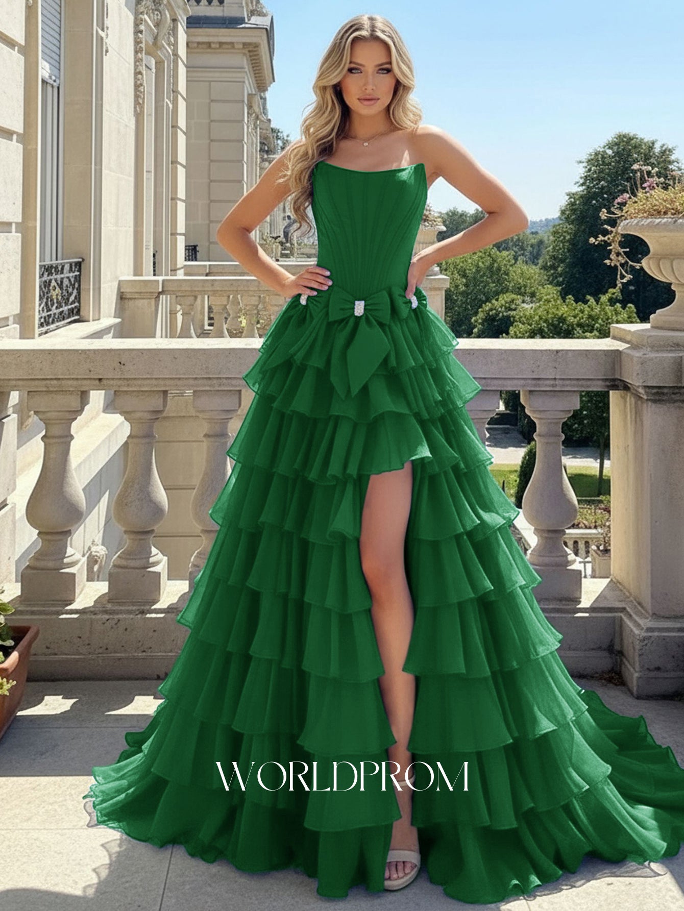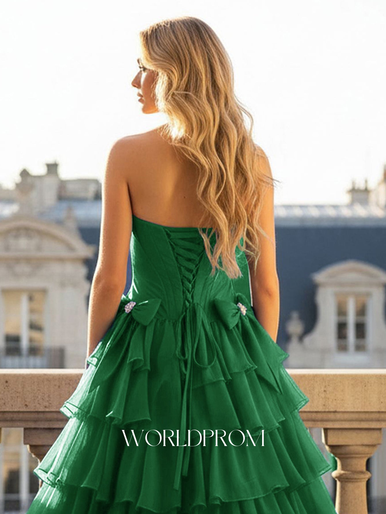 Boned Strapless Tiered Ball Gown Prom Dress Long With Bow - Emerald Green
