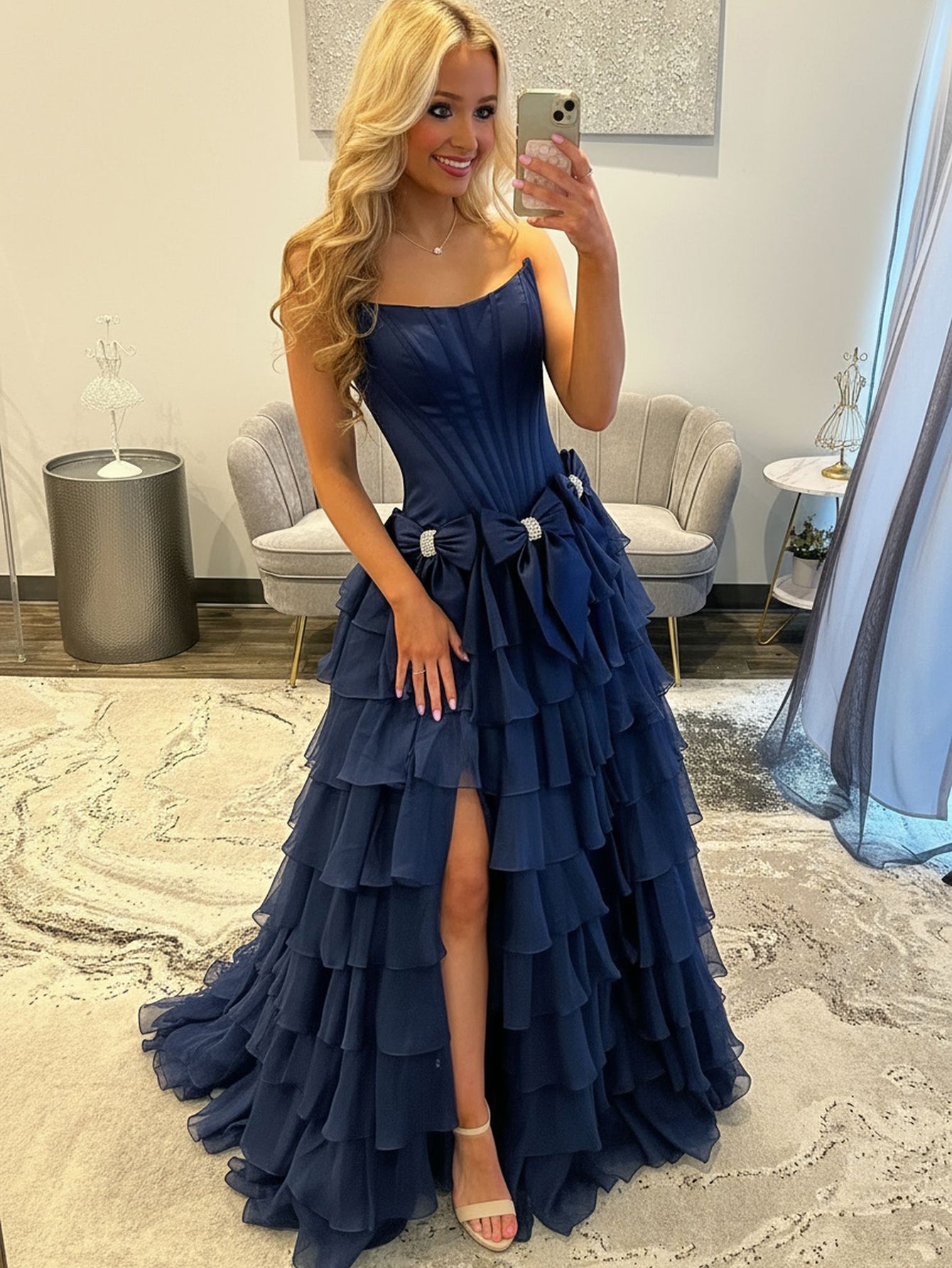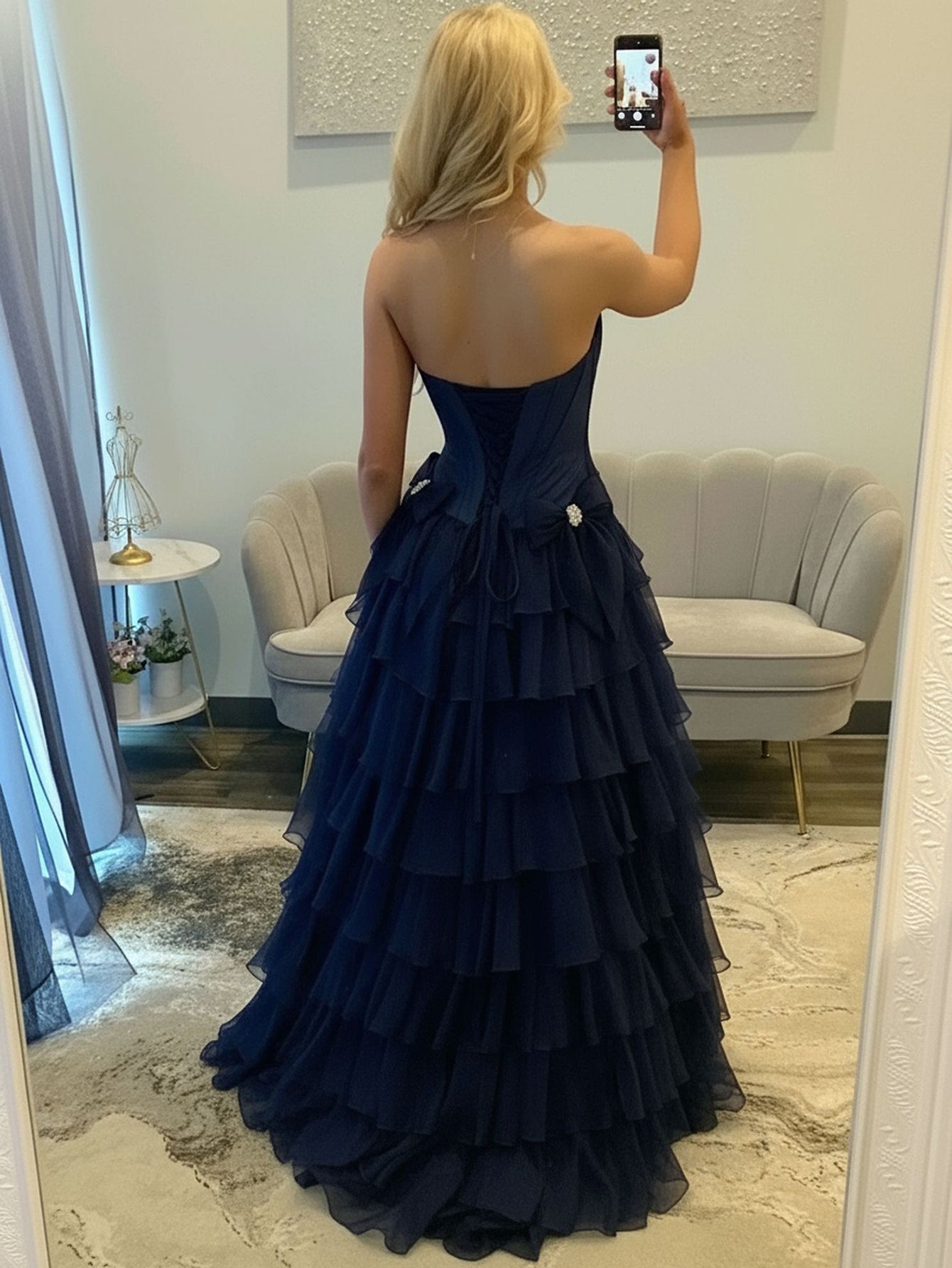 Boned Strapless Tiered Ball Gown Prom Dress Long With Bow - Navy Blue