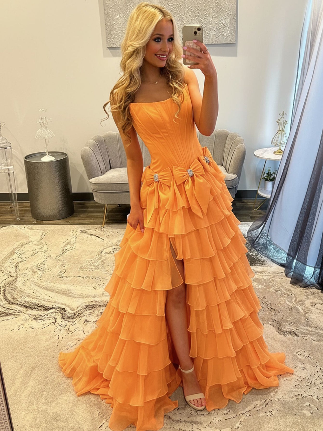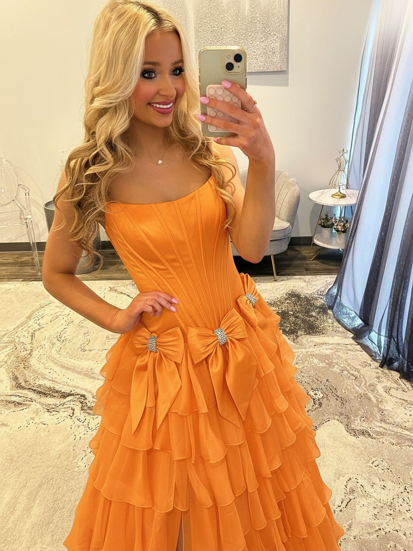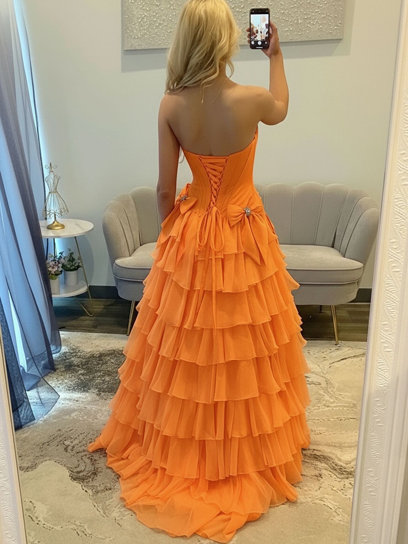 Boned Strapless Tiered Ball Gown Prom Dress Long With Bow - Orange