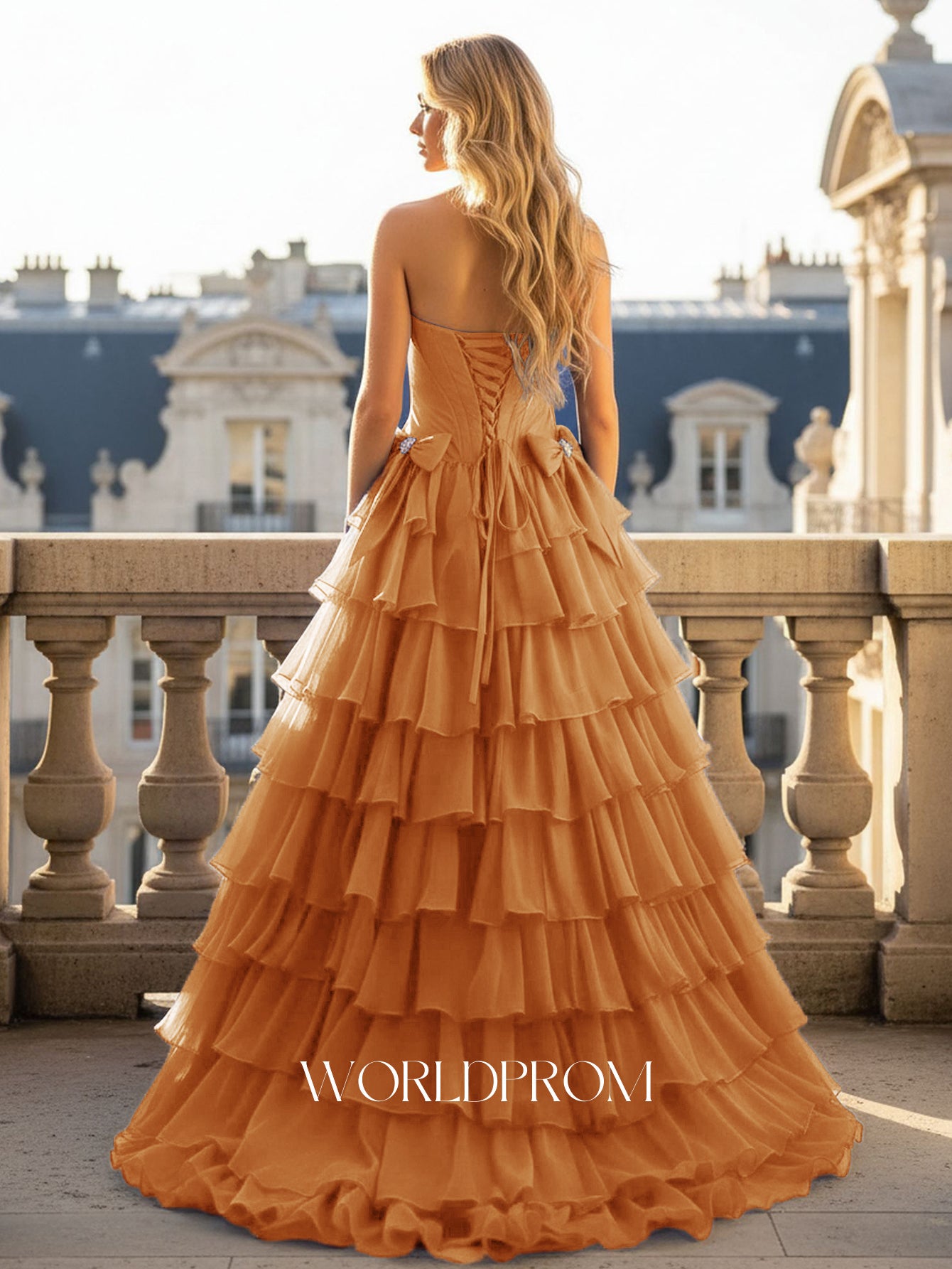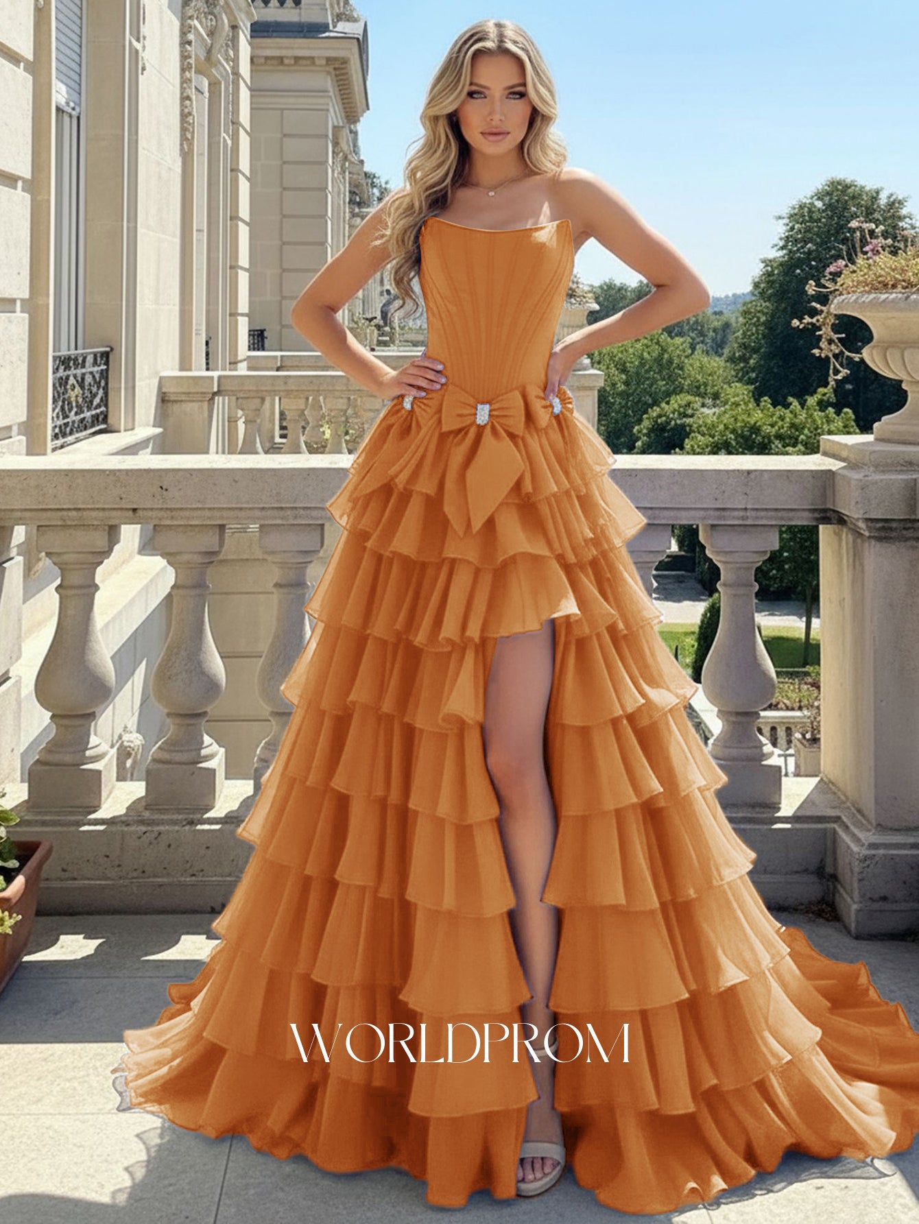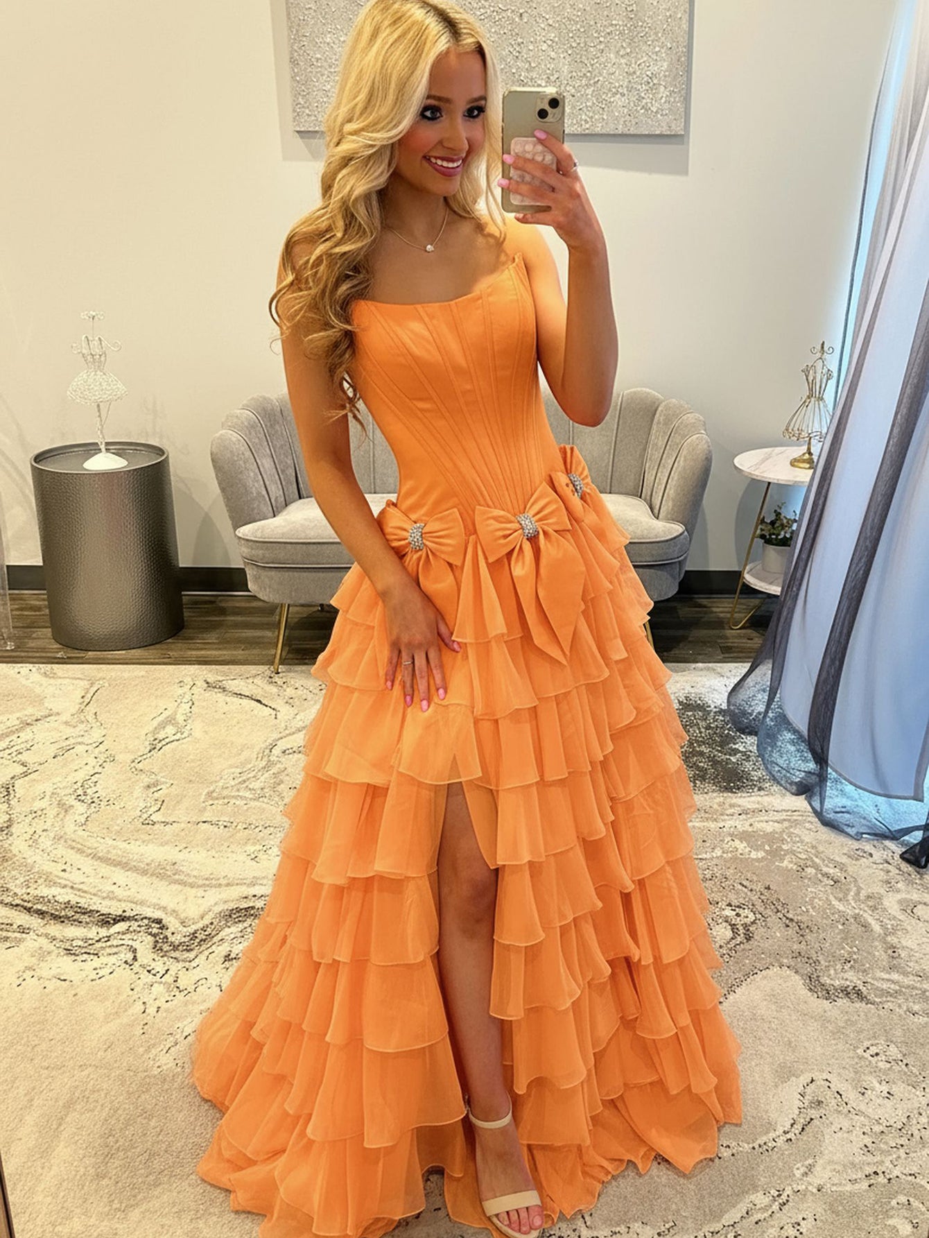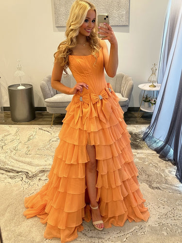 Boned Strapless Tiered Ball Gown Prom Dress Long With Bow - Orange