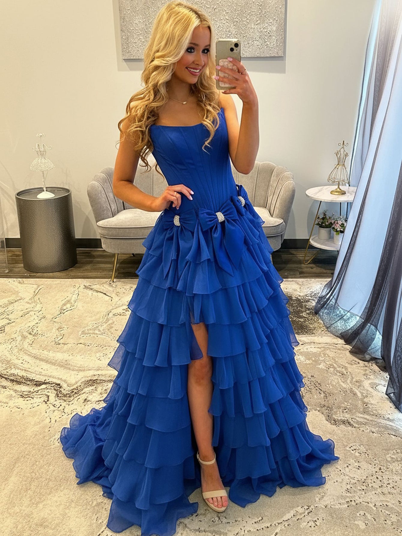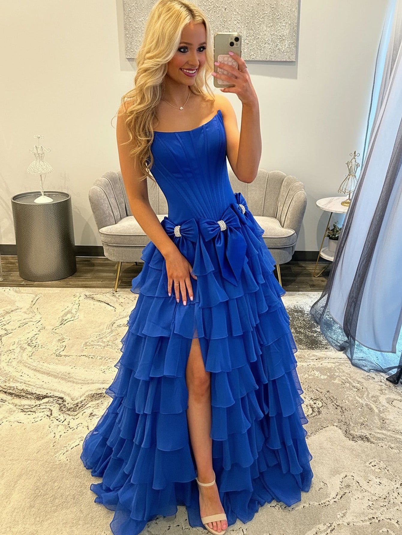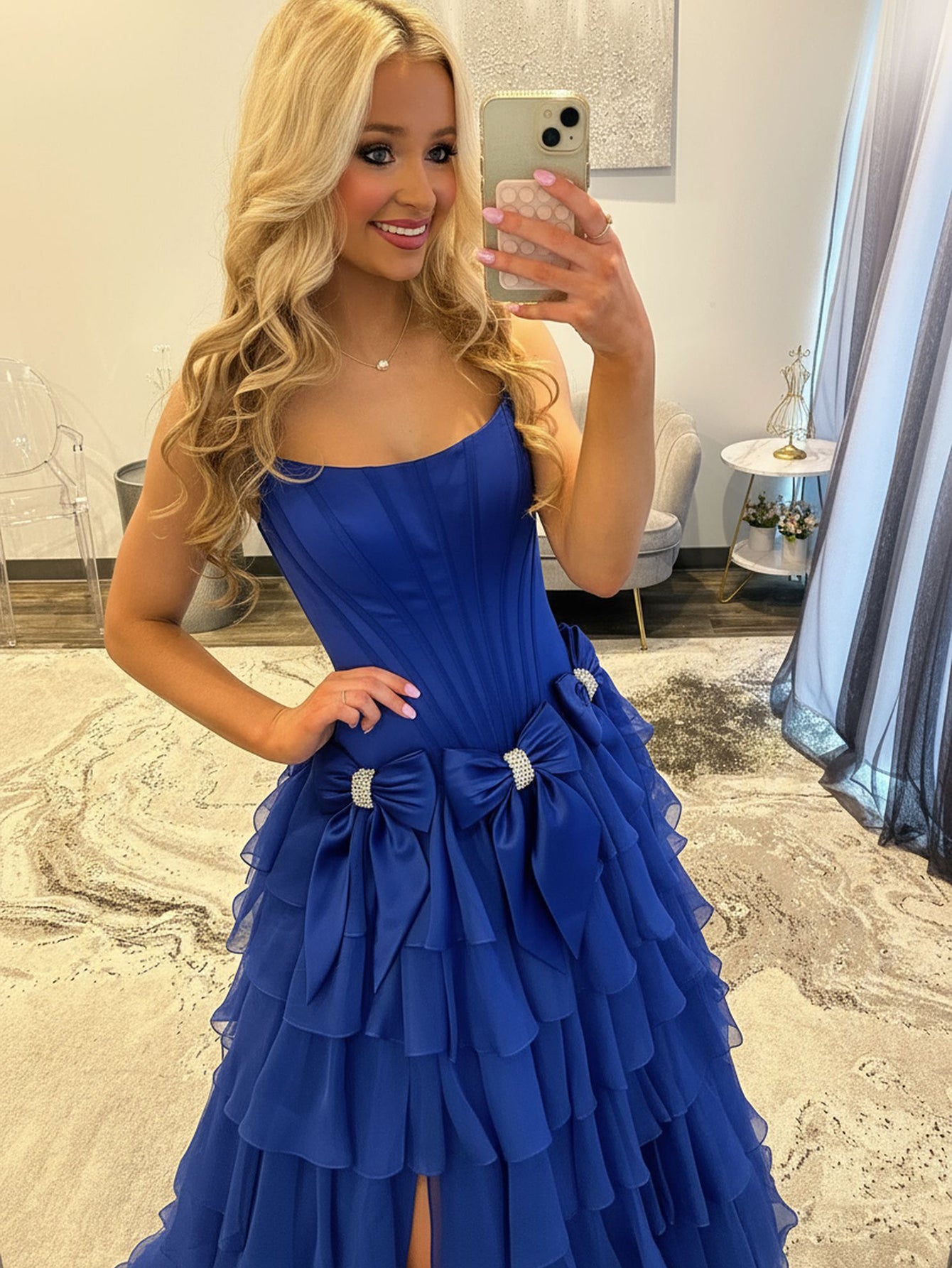 Boned Strapless Tiered Ball Gown Prom Dress Long With Bow - Royal Blue