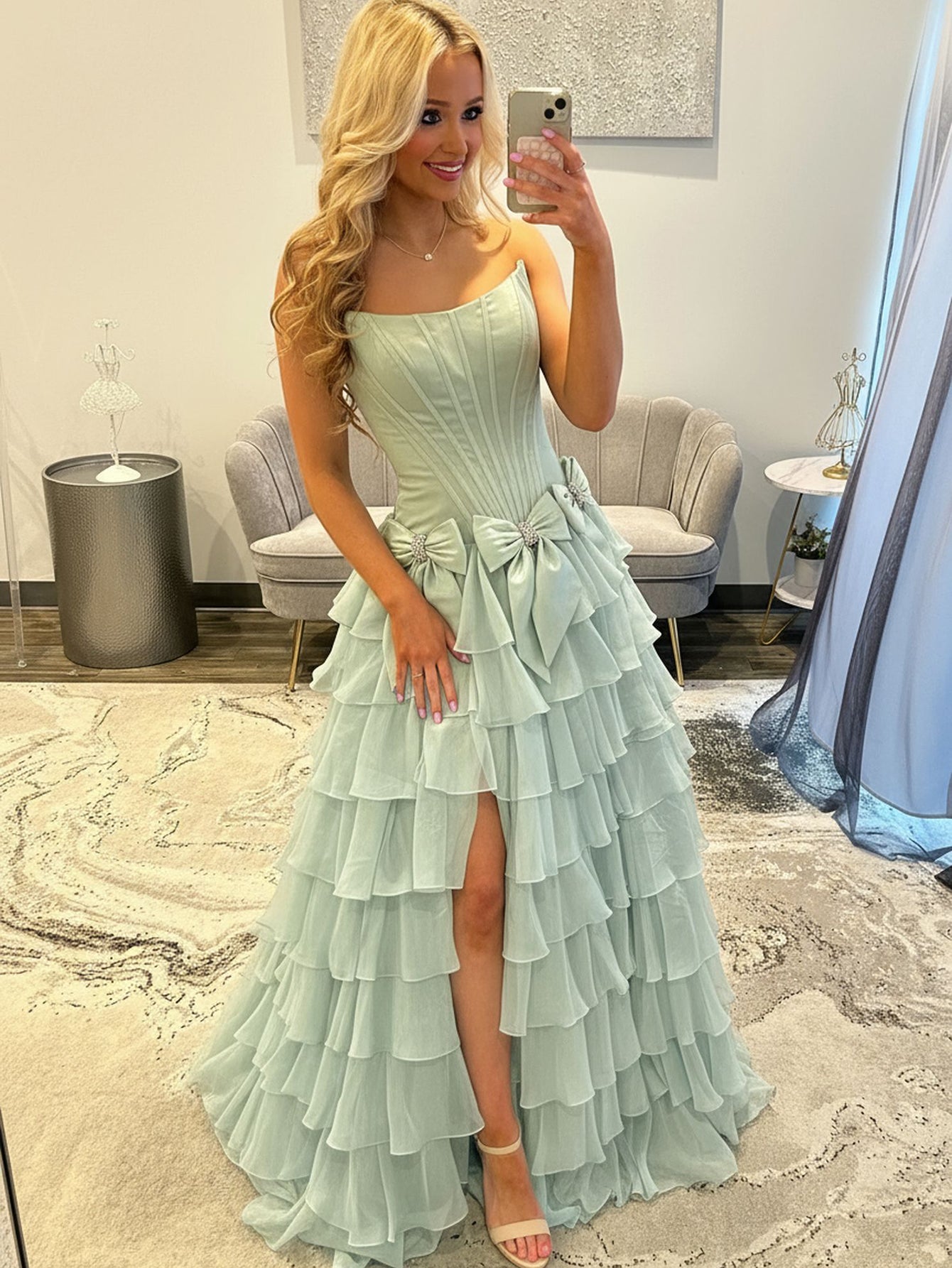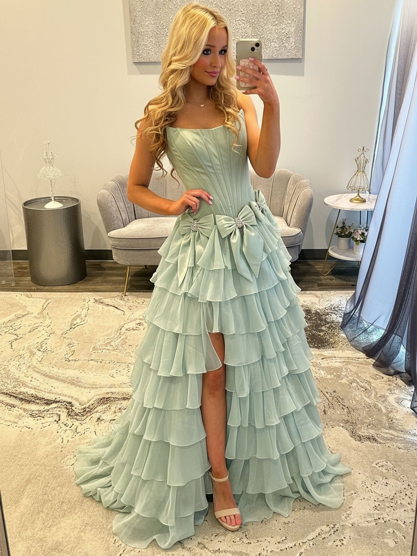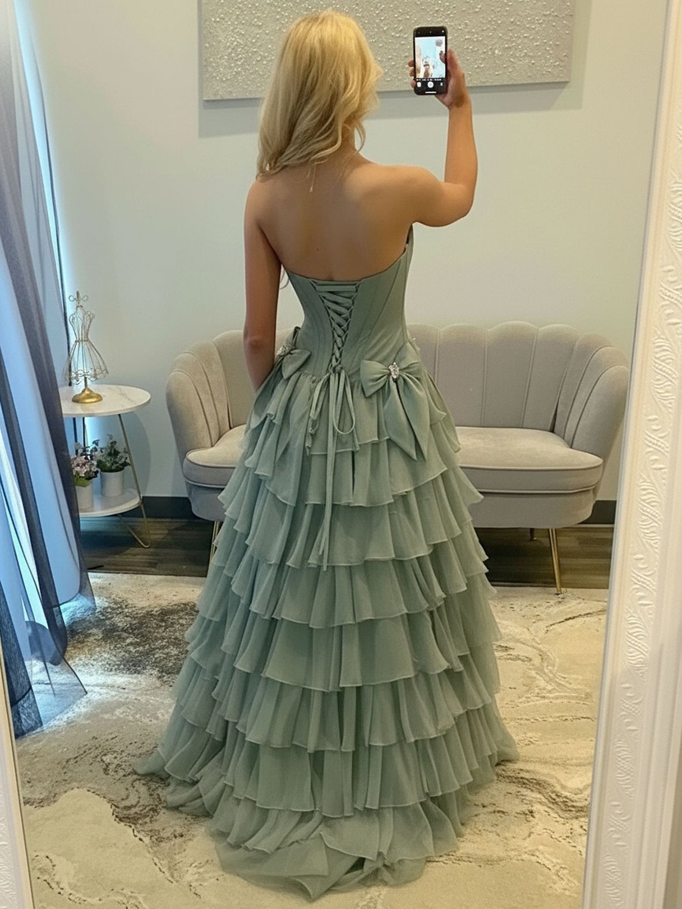 Boned Strapless Tiered Ball Gown Prom Dress Long With Bow - Sage Green