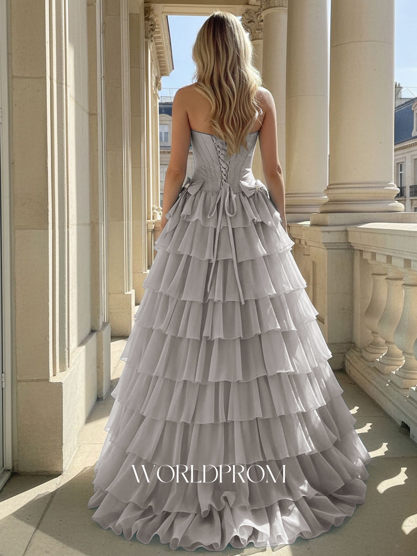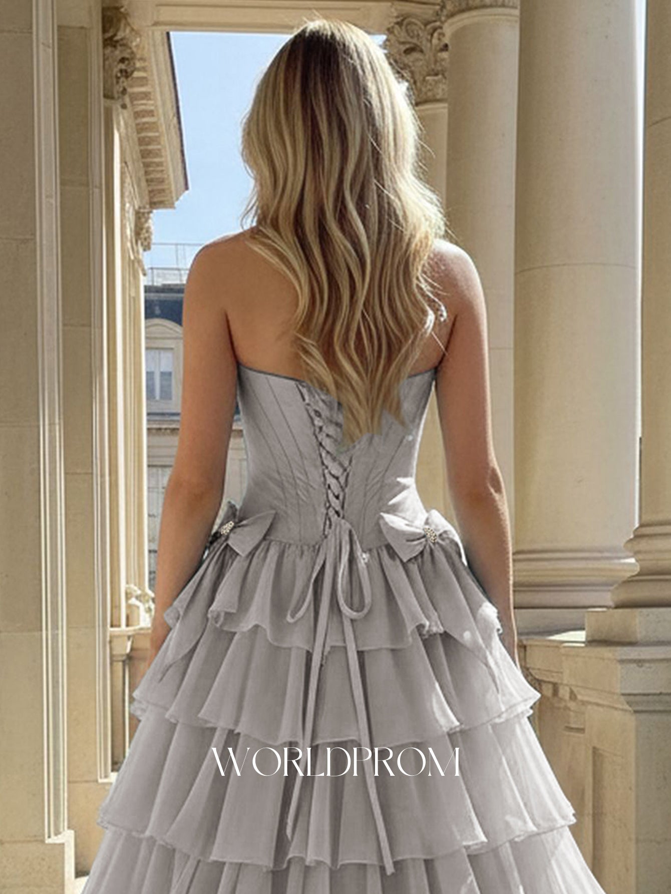 Boned Strapless Tiered Ball Gown Prom Dress Long With Bow - Silver