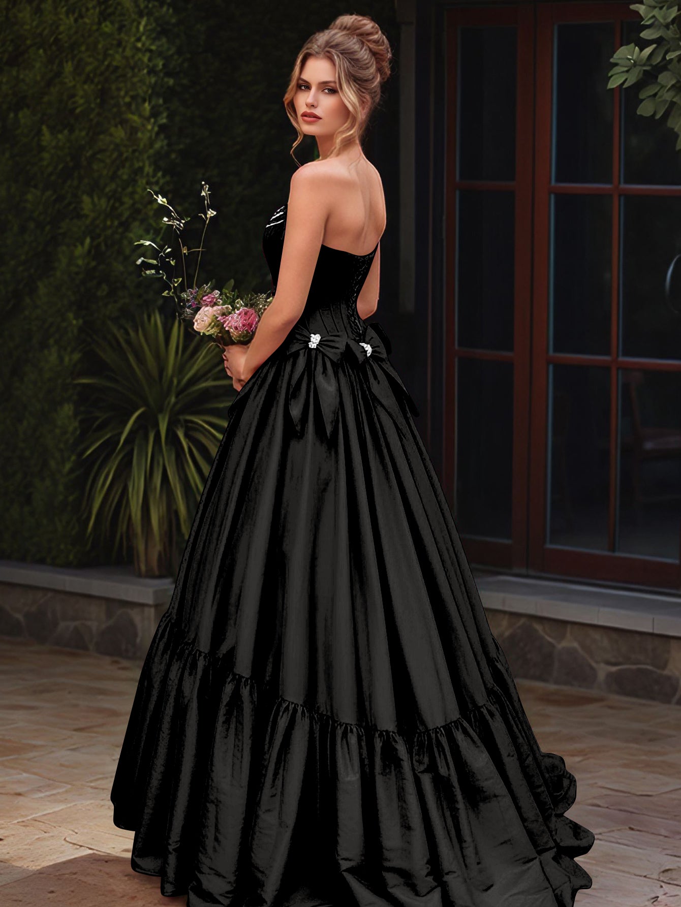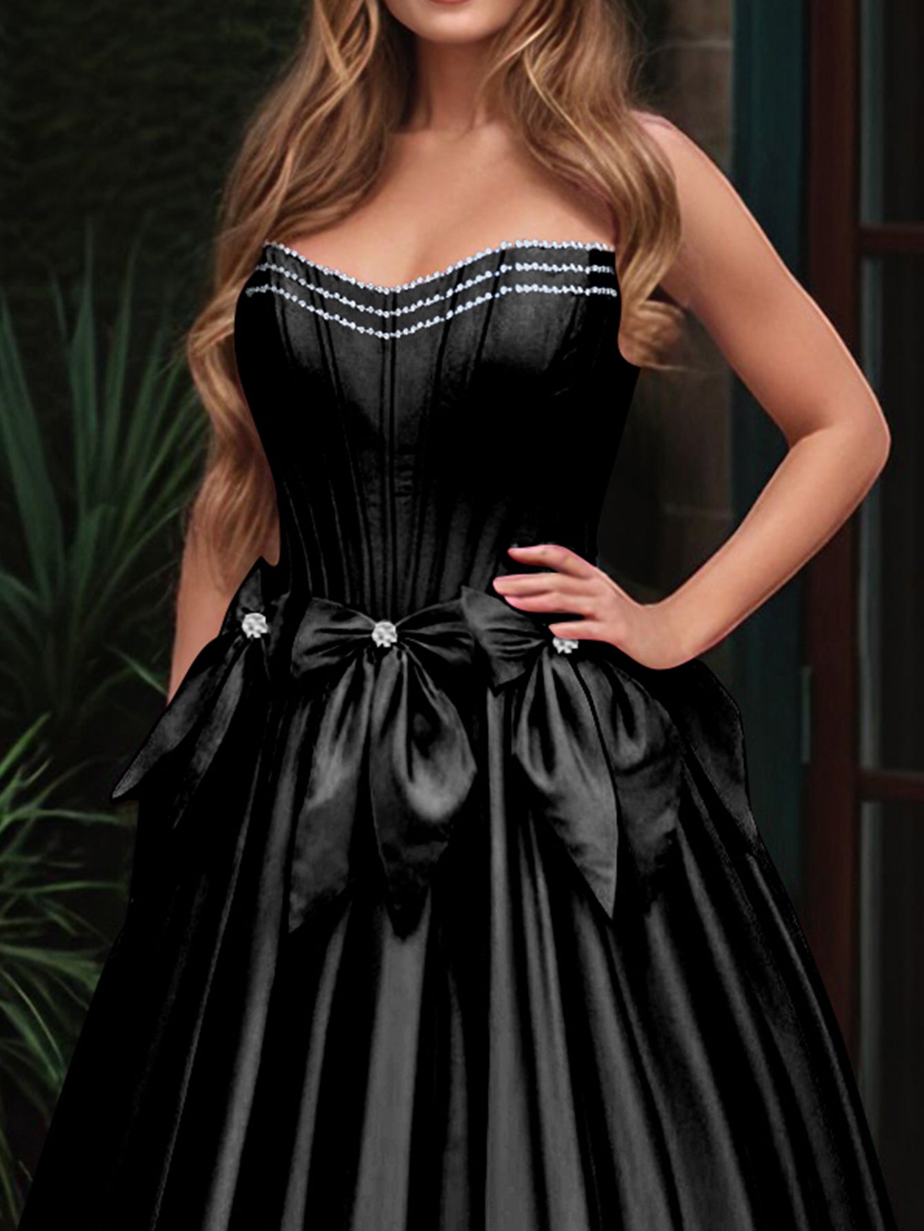Boned Top Strapless Beaded Ball Gown Prom Dress With Bow - Black