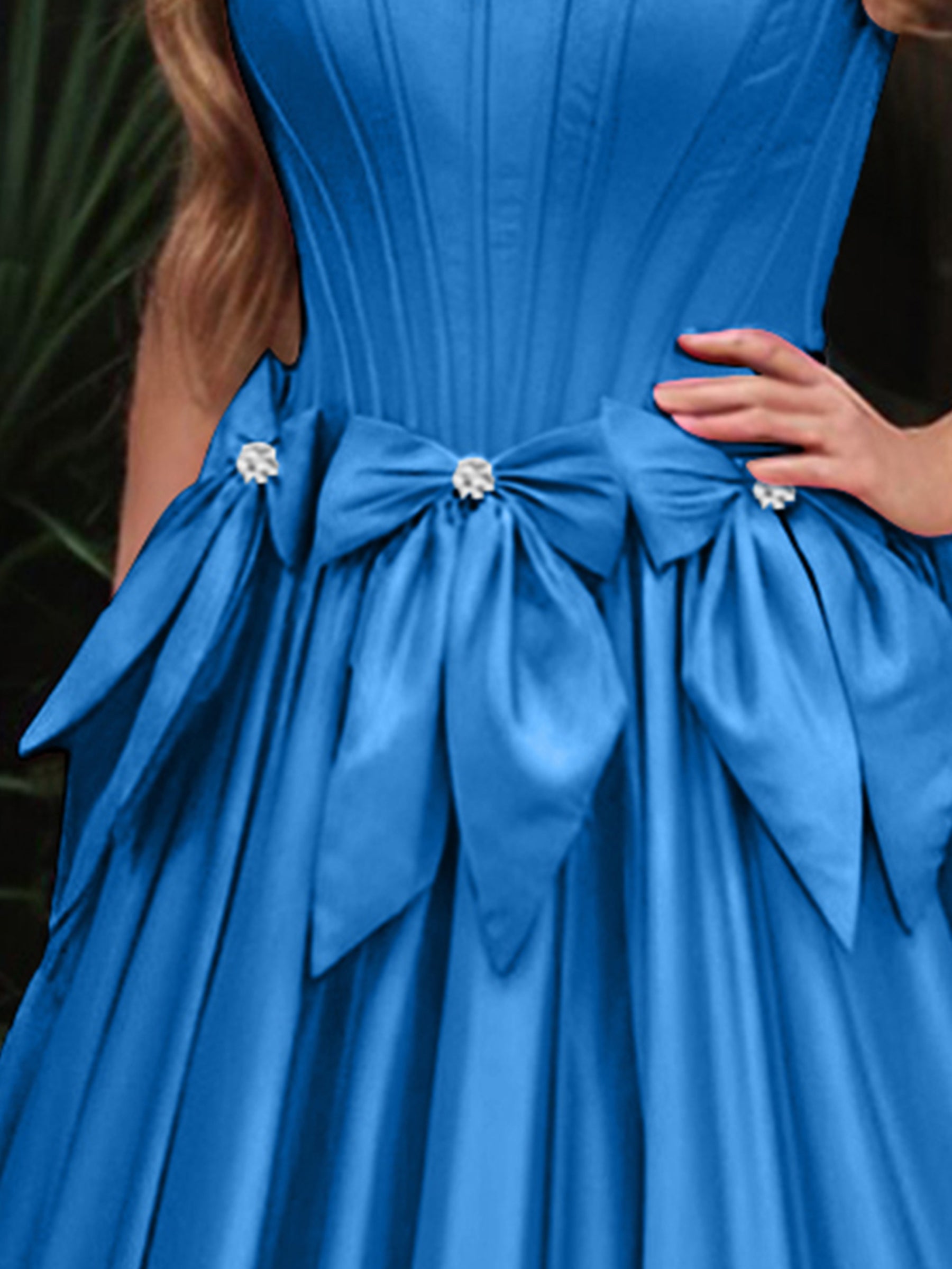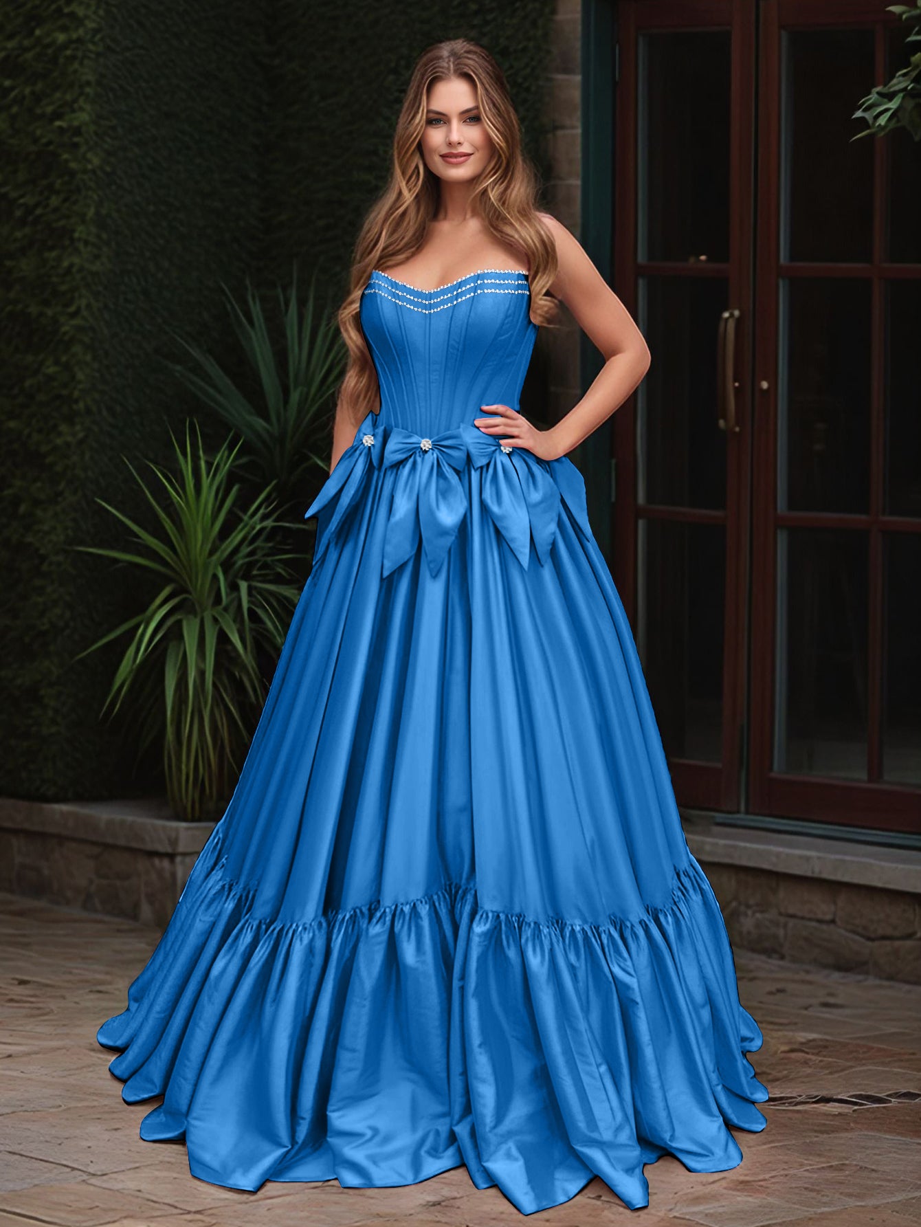 Boned Top Strapless Beaded Ball Gown Prom Dress With Bow - Blue