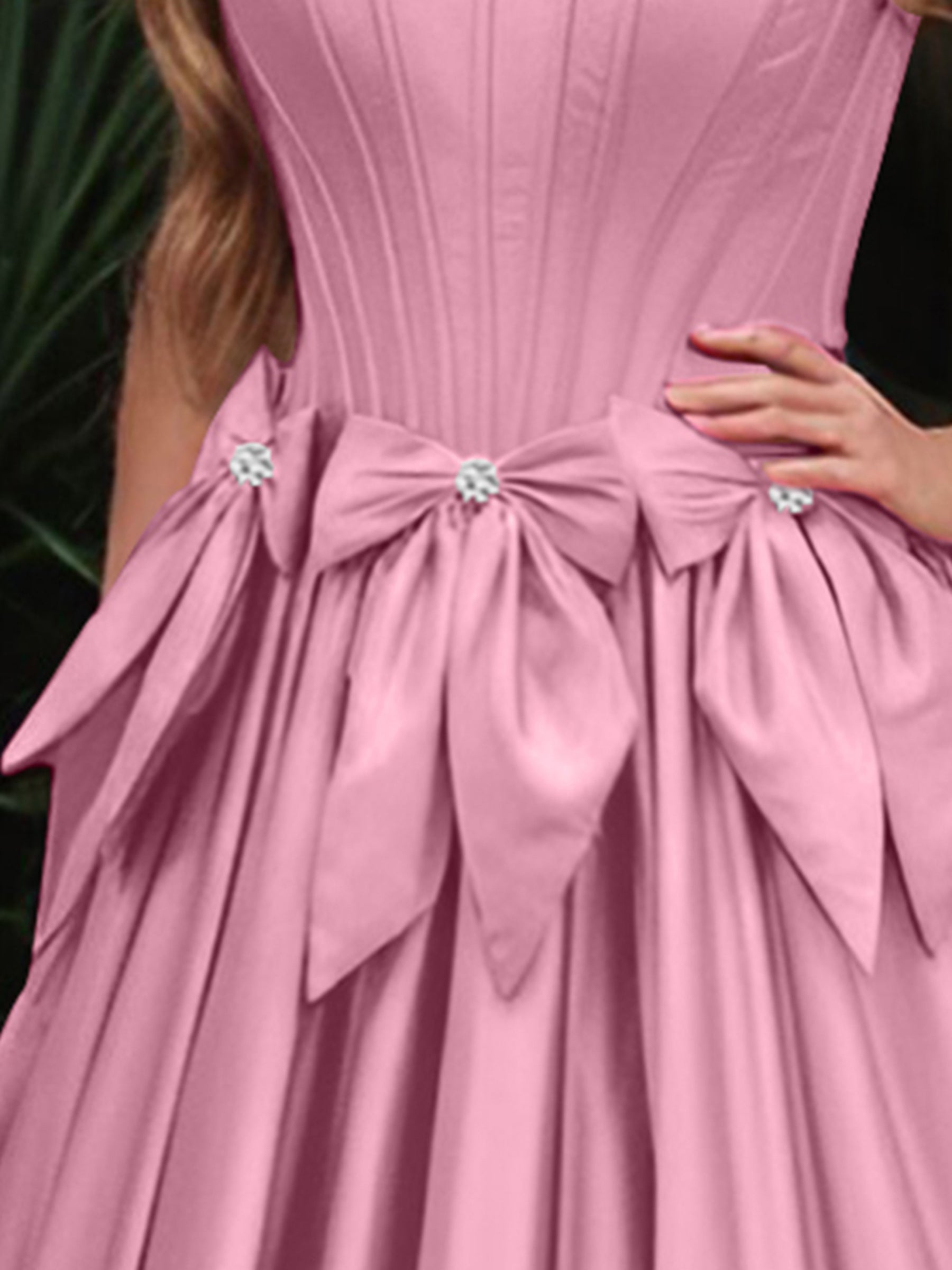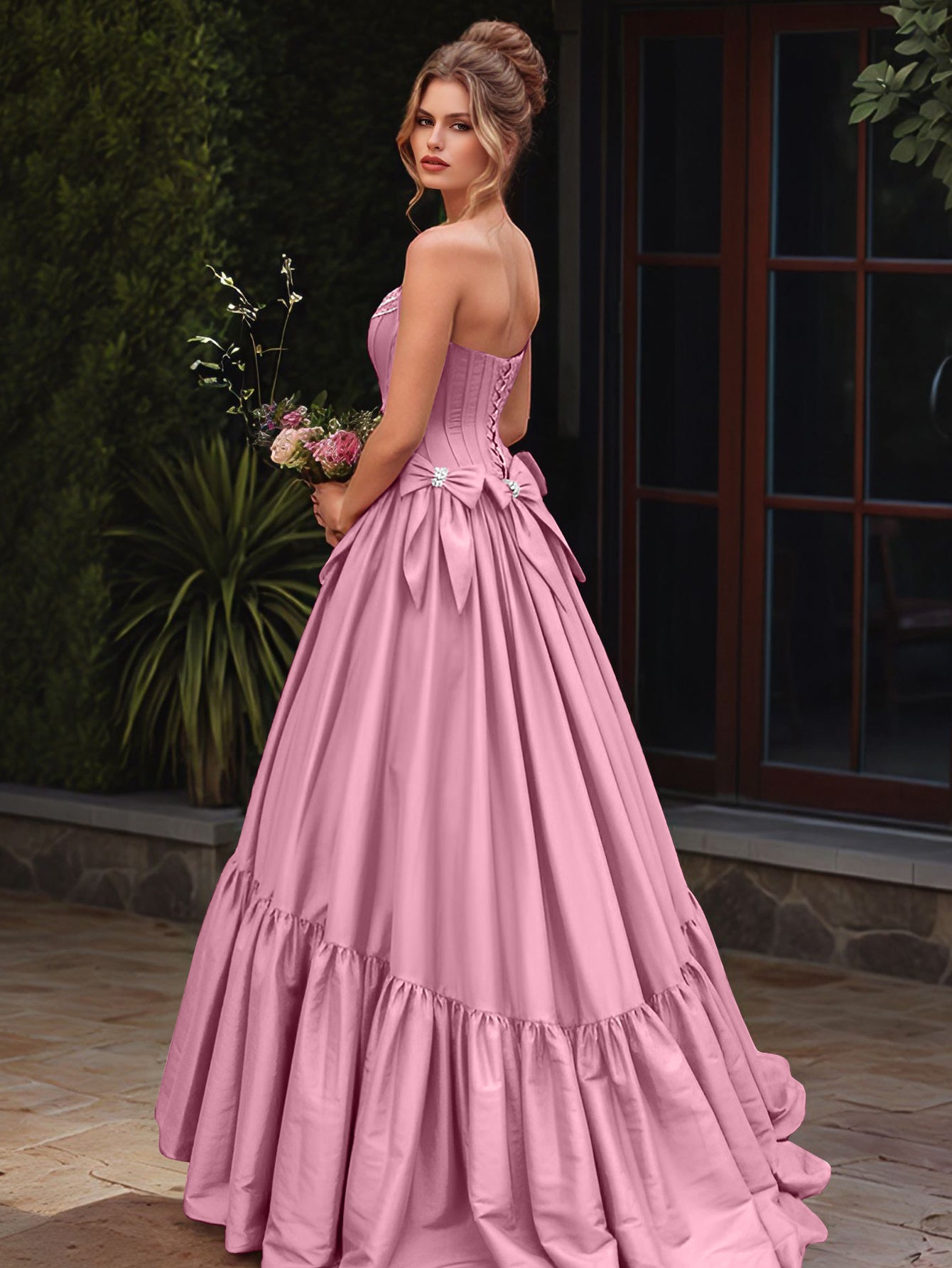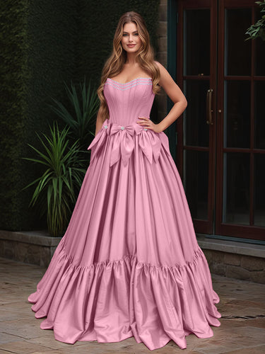 Boned Top Strapless Beaded Ball Gown Prom Dress With Bow - Blush Pink
