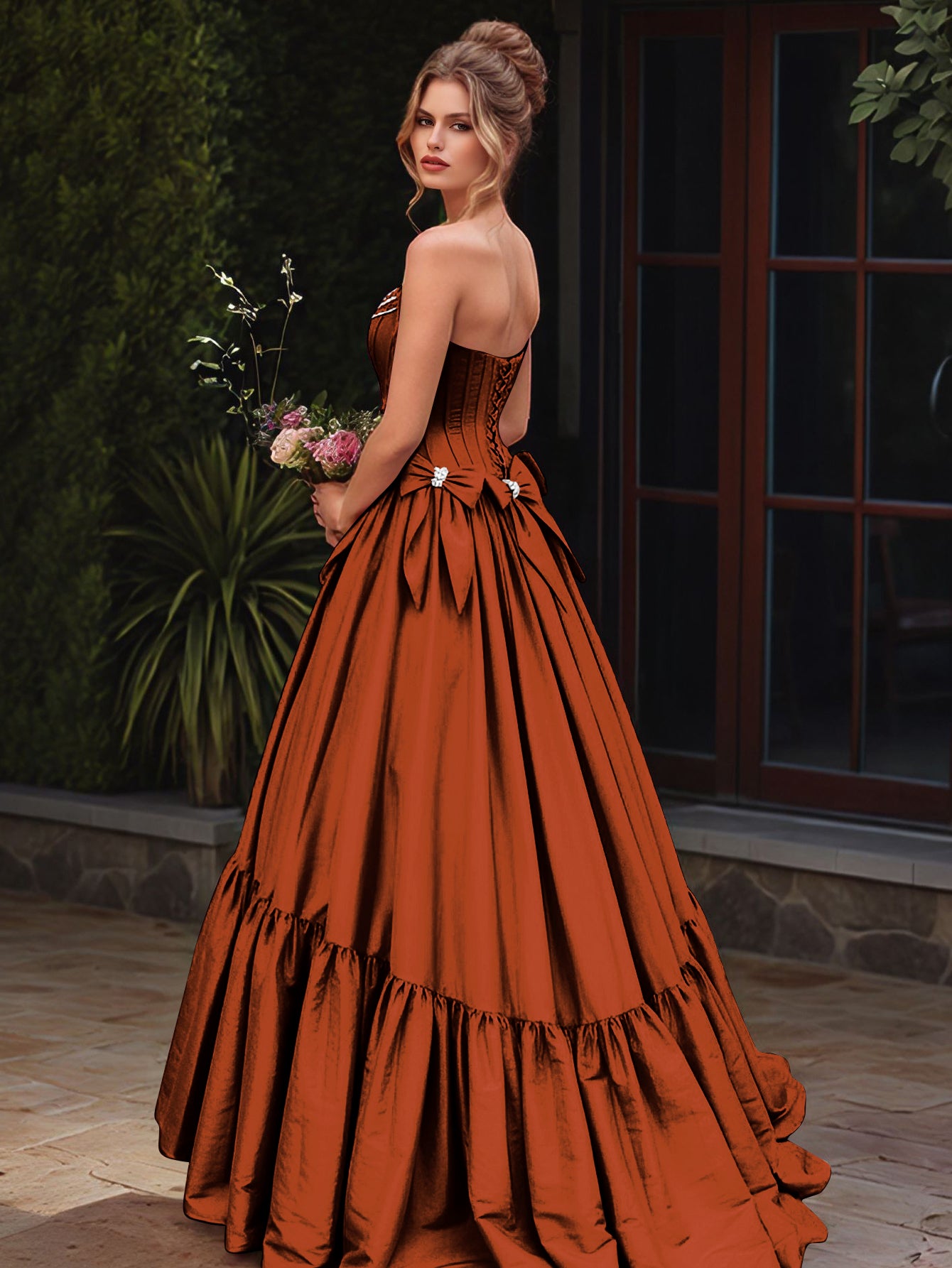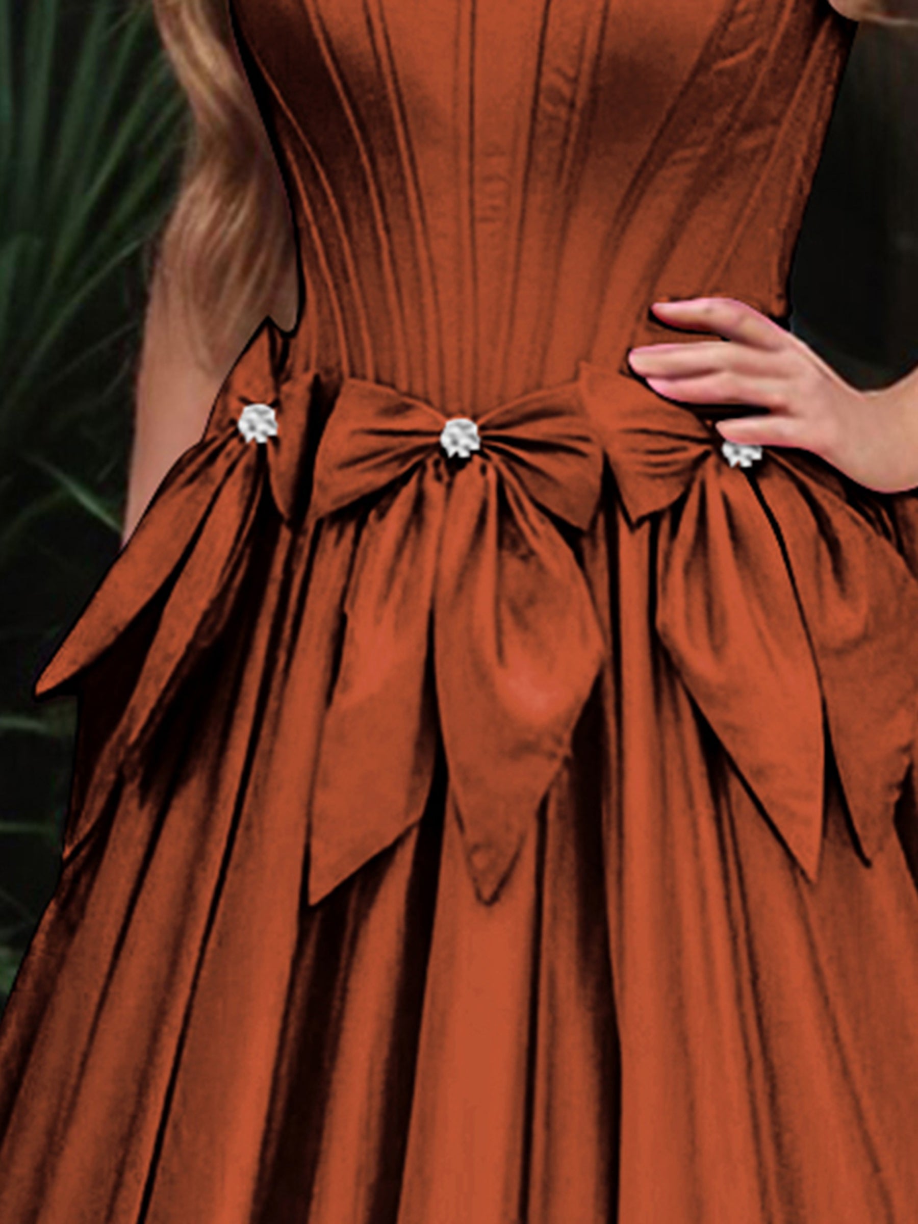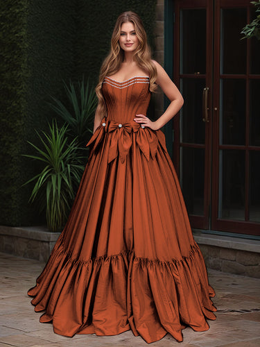 Boned Top Strapless Beaded Ball Gown Prom Dress With Bow - Burnt Orange