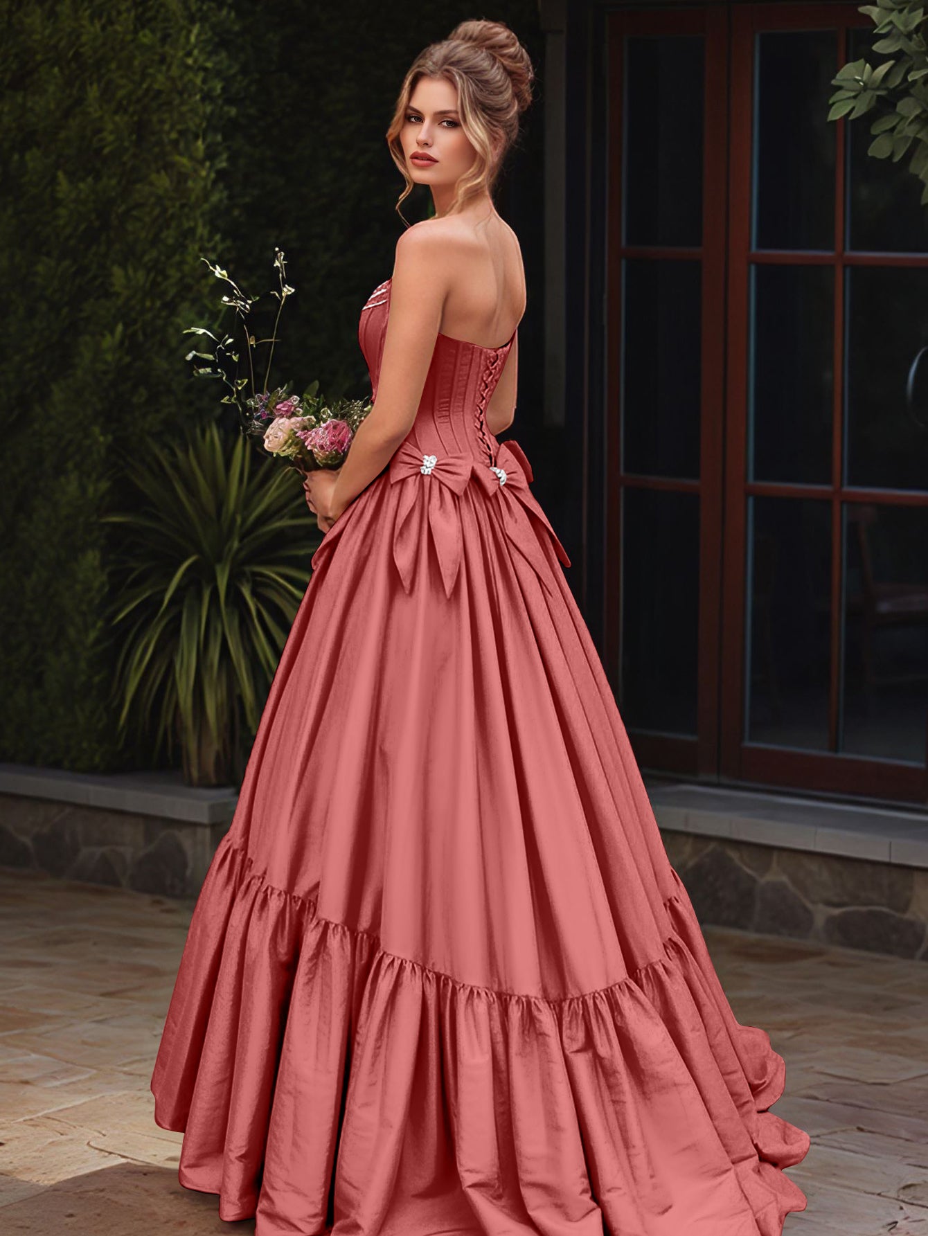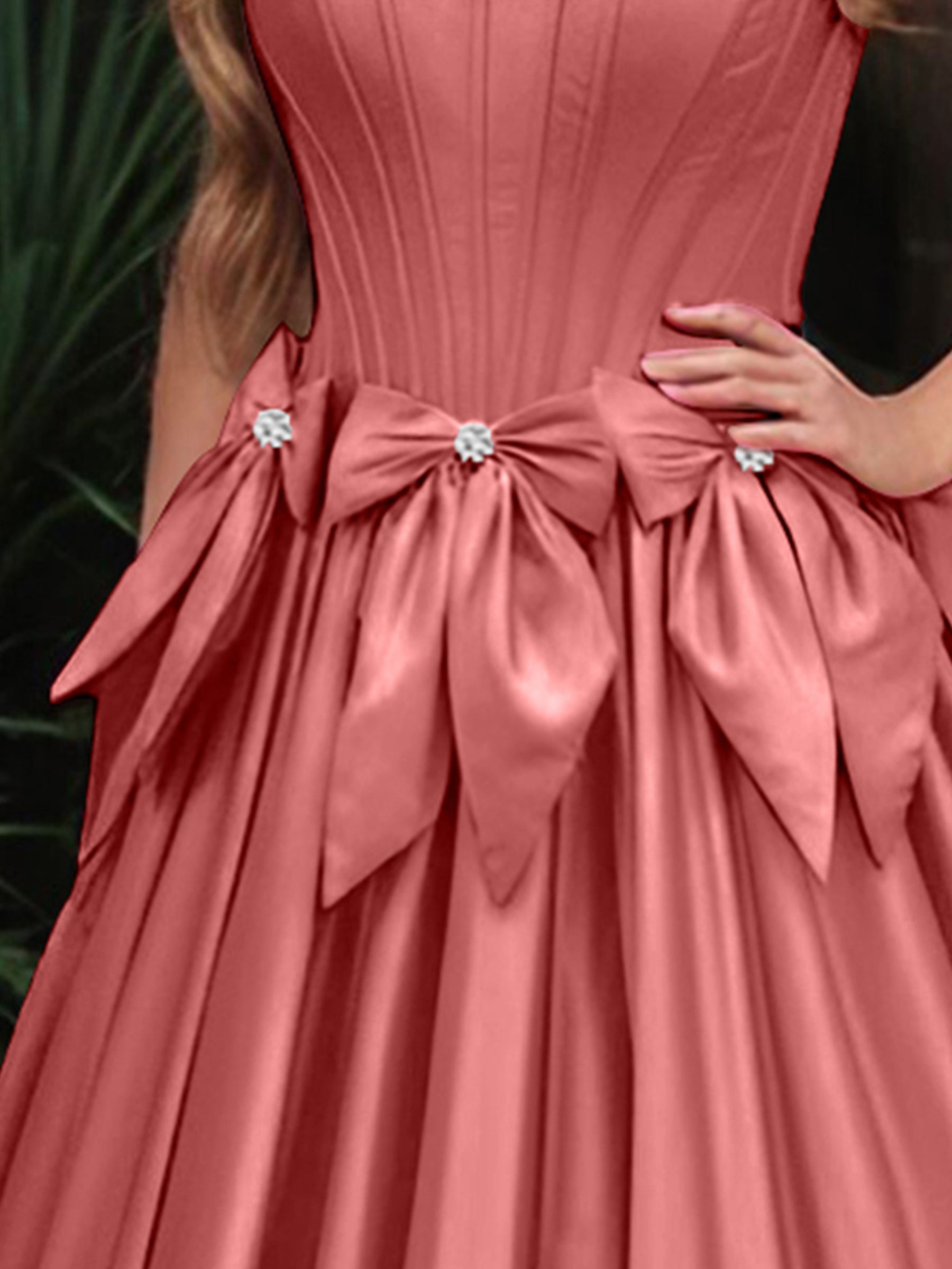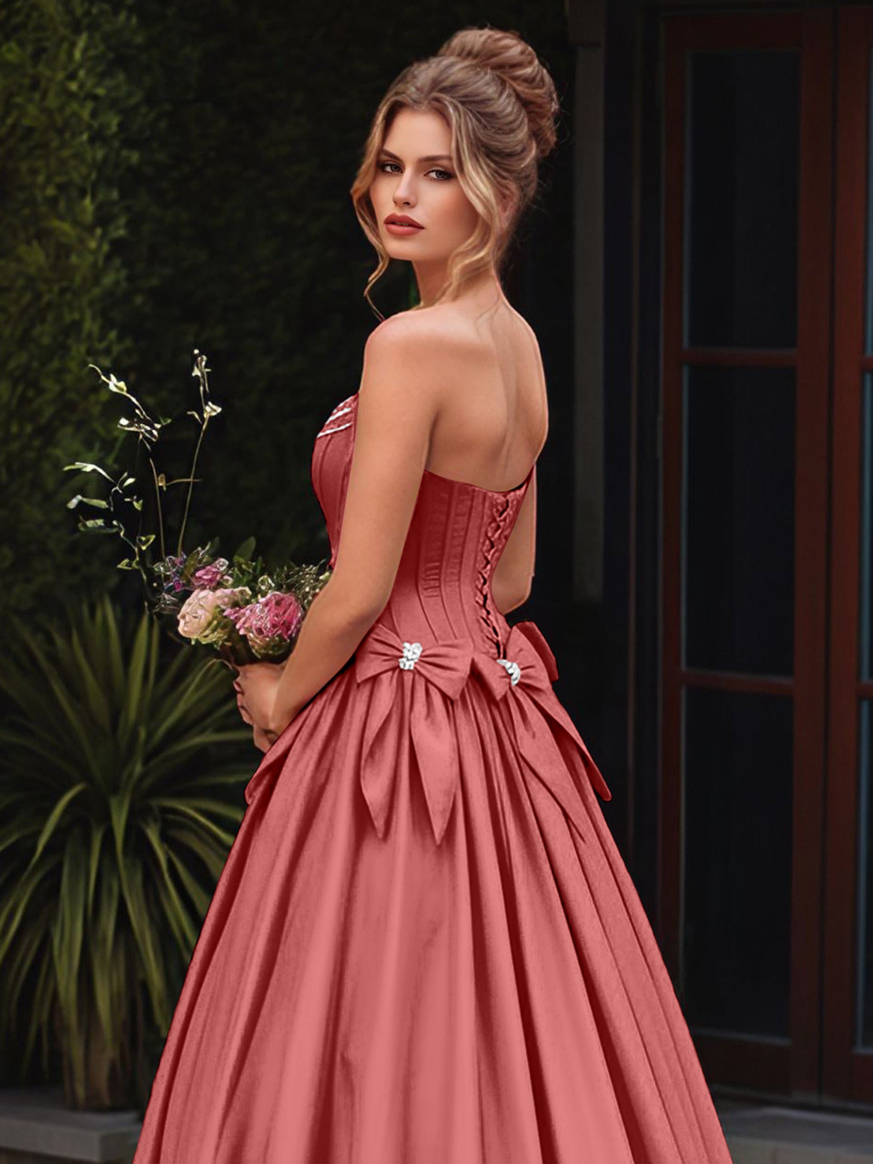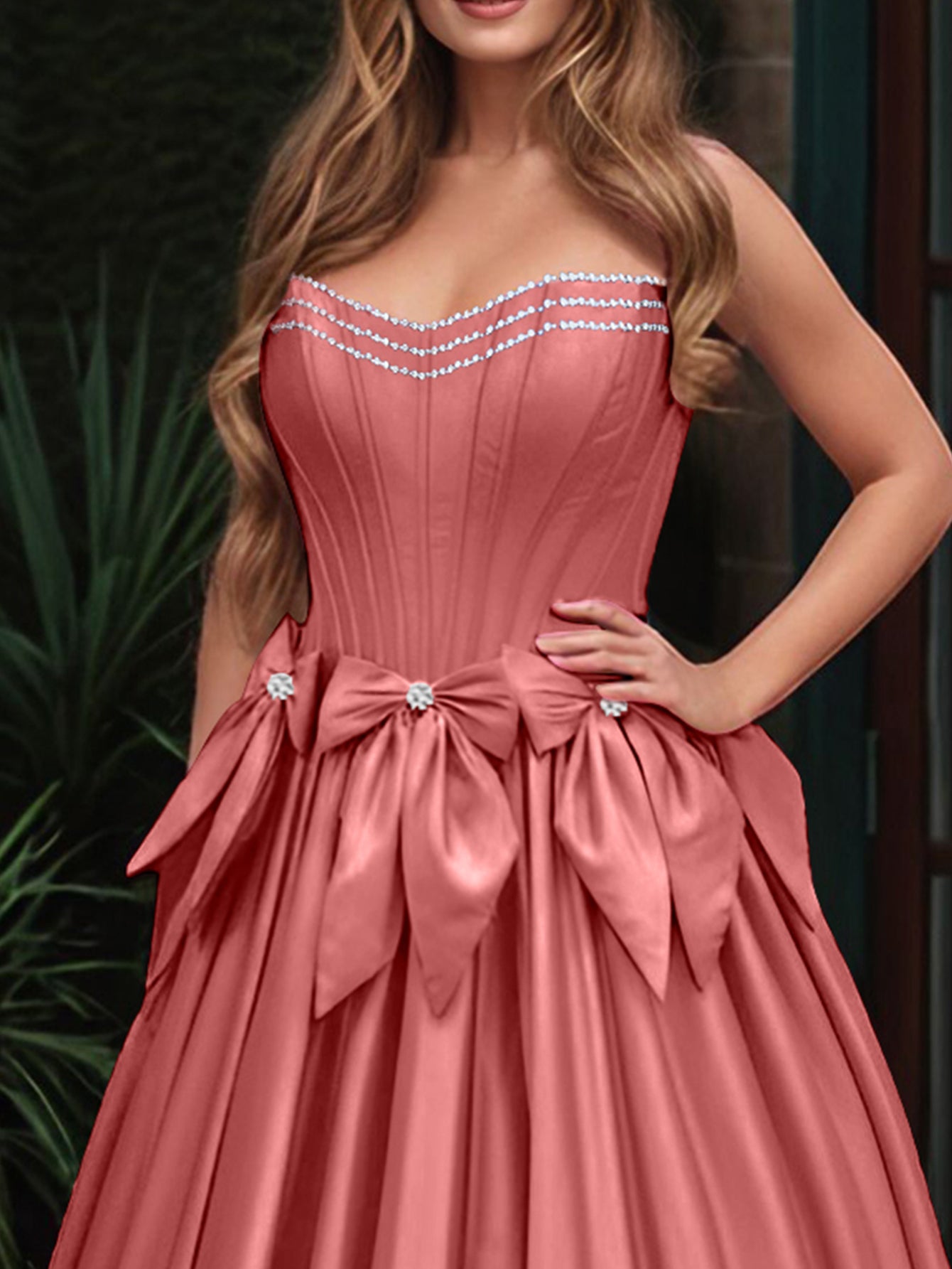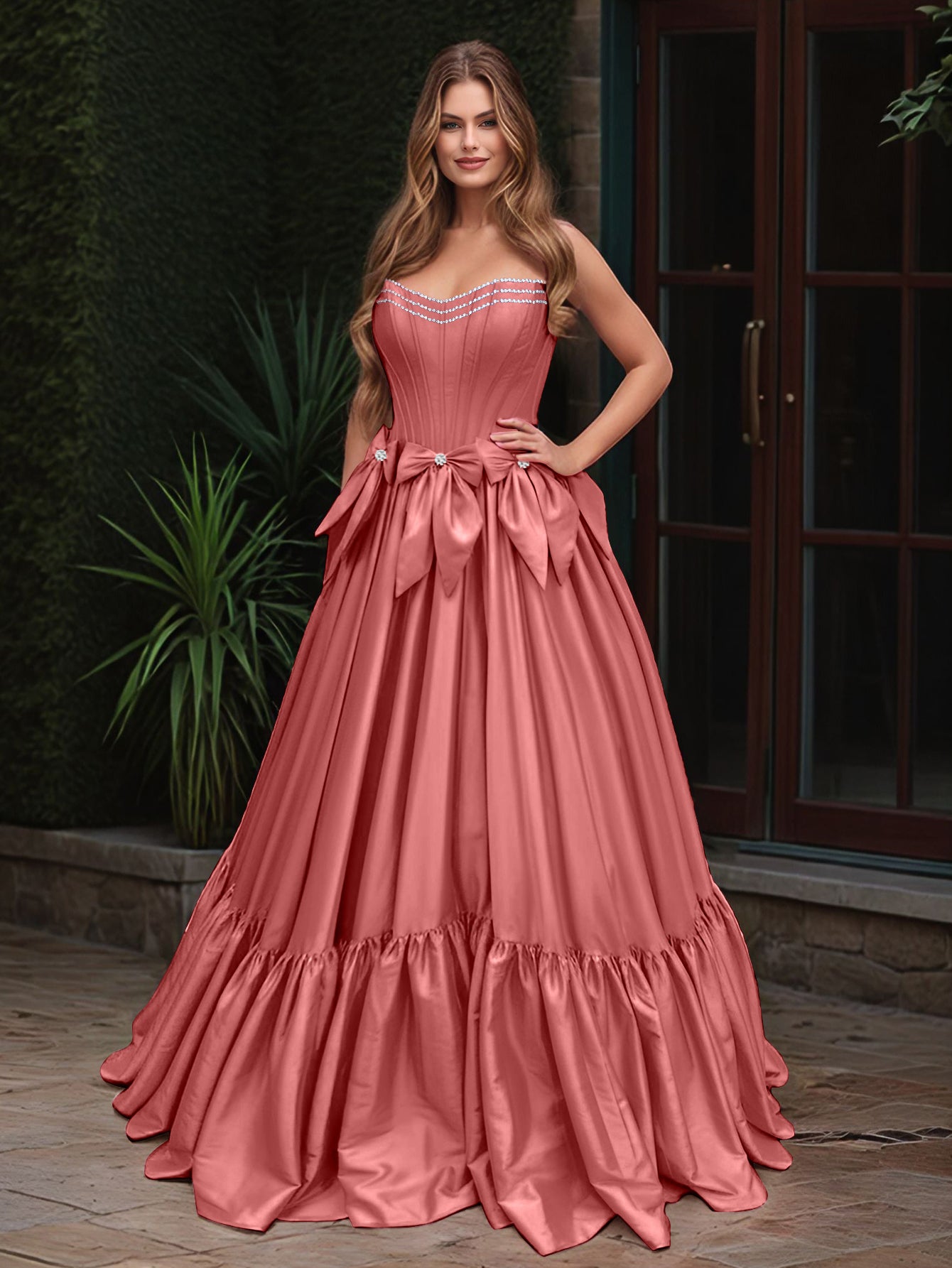 Boned Top Strapless Beaded Ball Gown Prom Dress With Bow - Coral